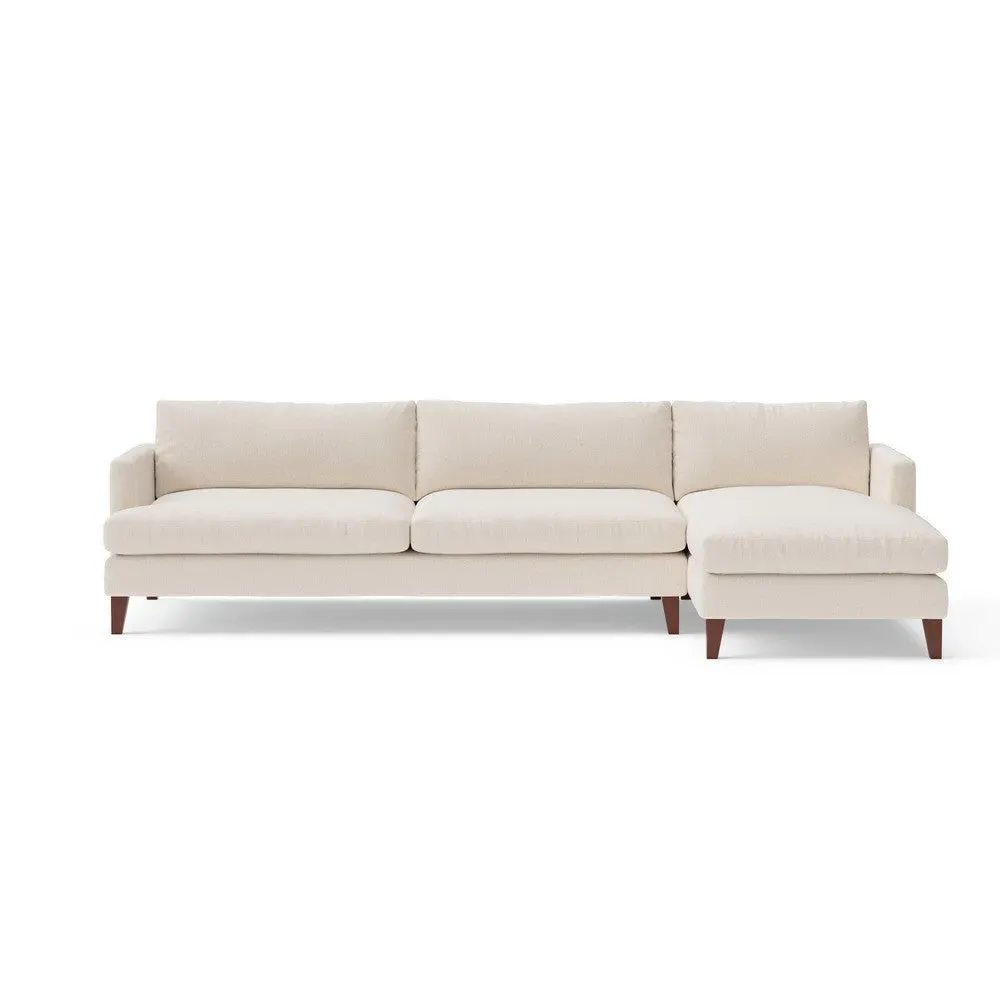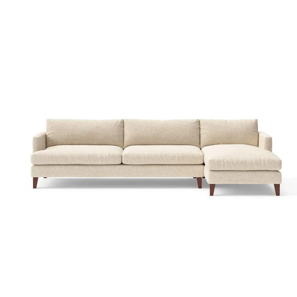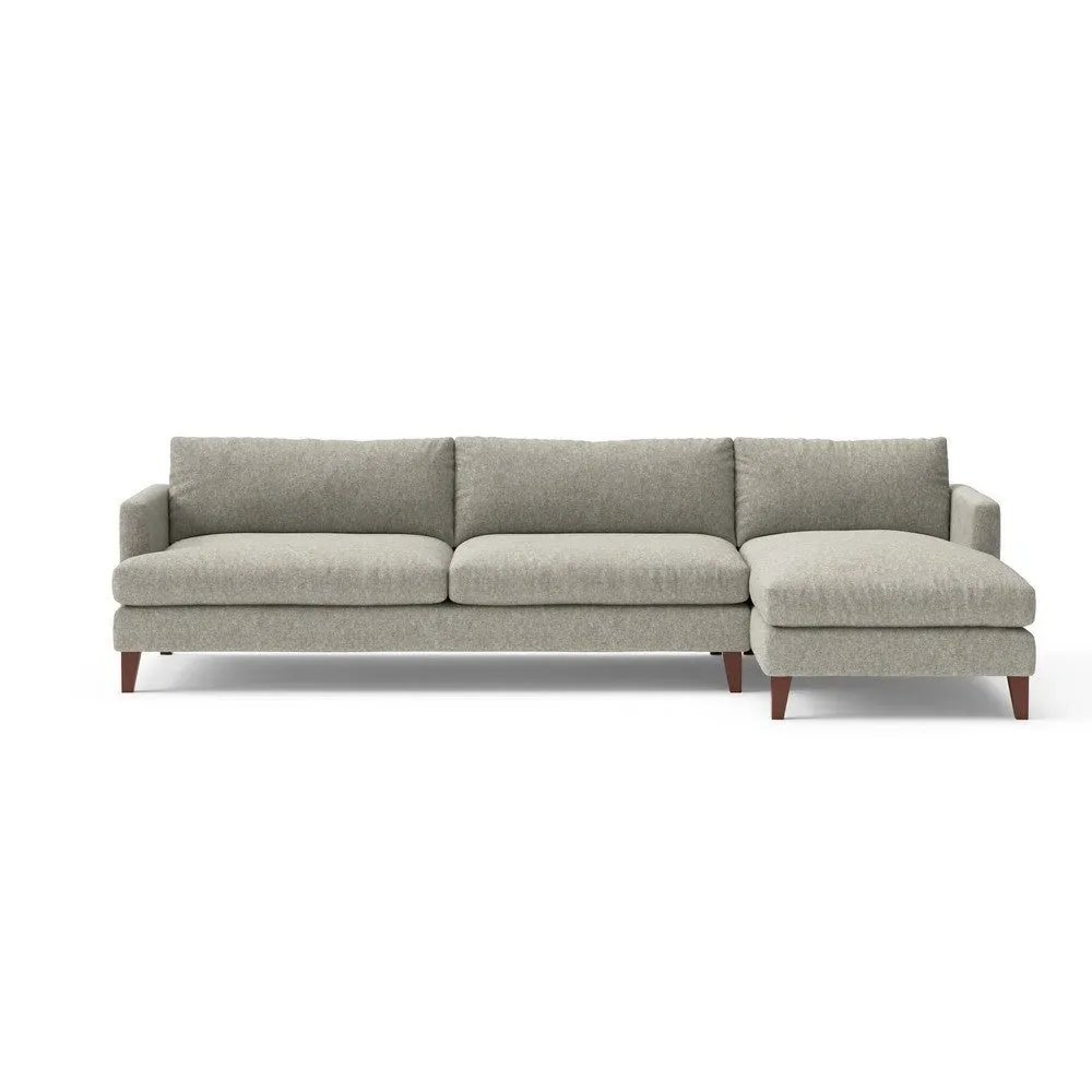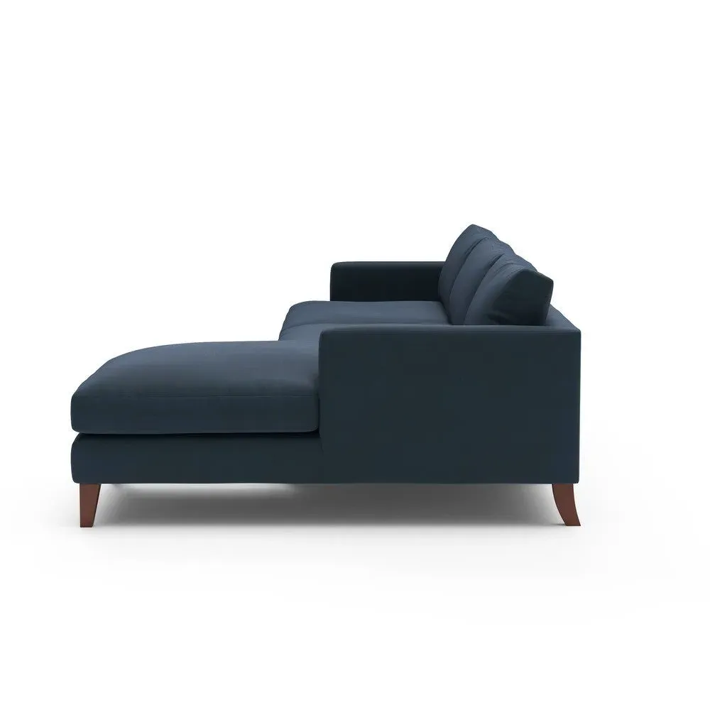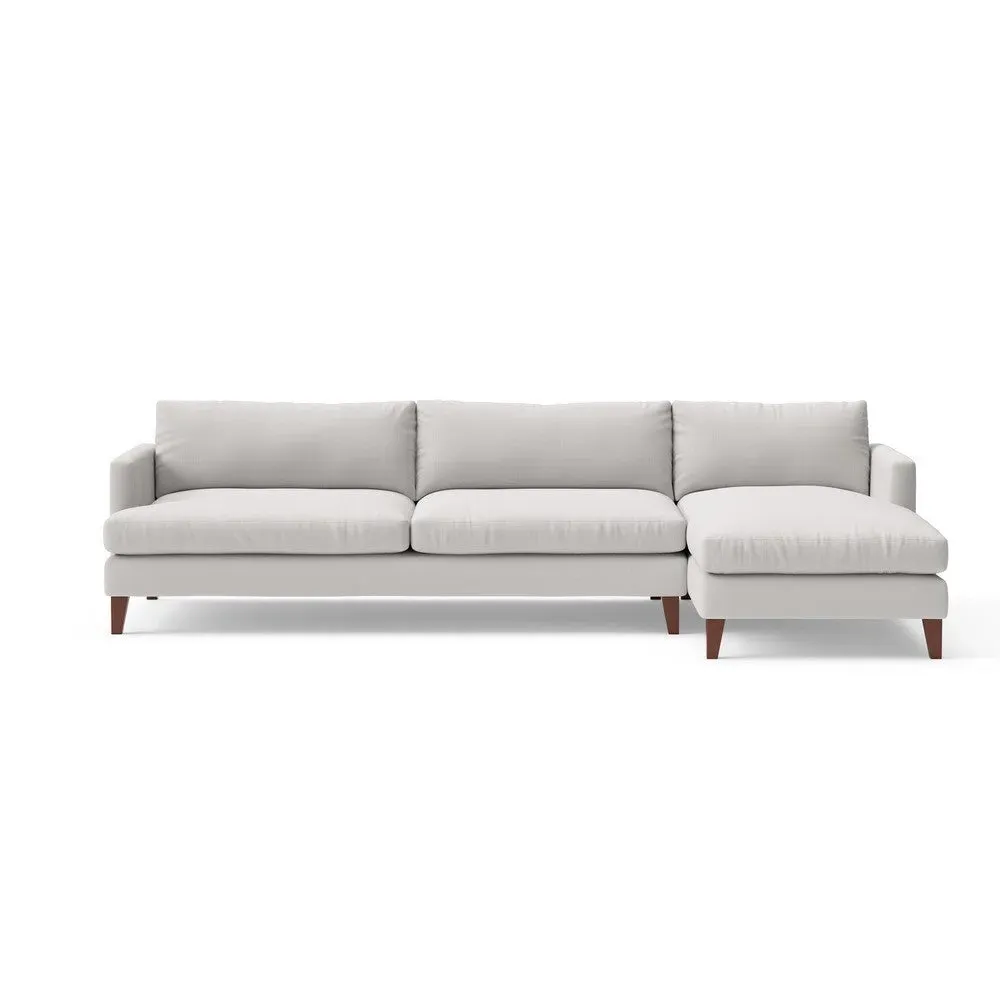 The chaise sofa offers lasting comfort with its smart, clean lines and tall arms. Its generous proportions provide ample seating space, while the house weave fabric adds texture and durability. The left-hand configuration suits various room layouts, and the tall arms ensure excellent support for relaxation.