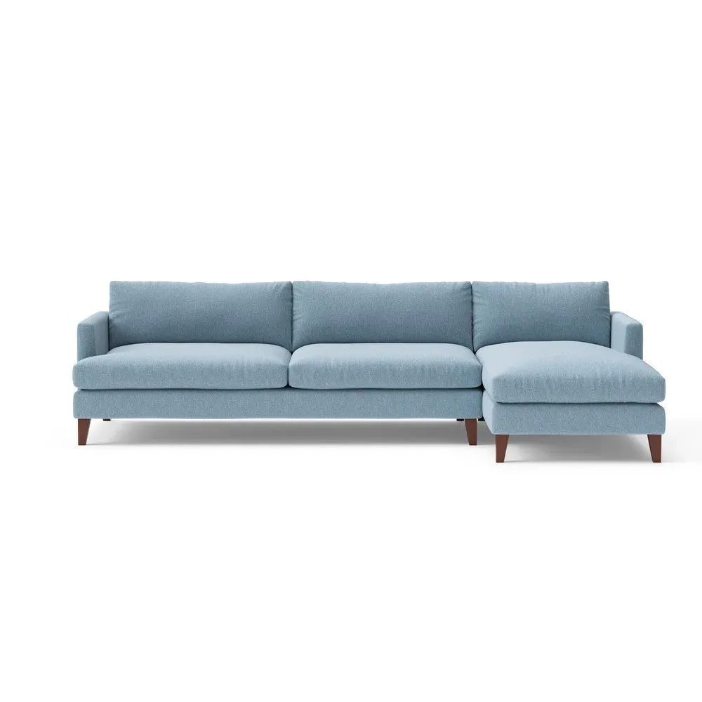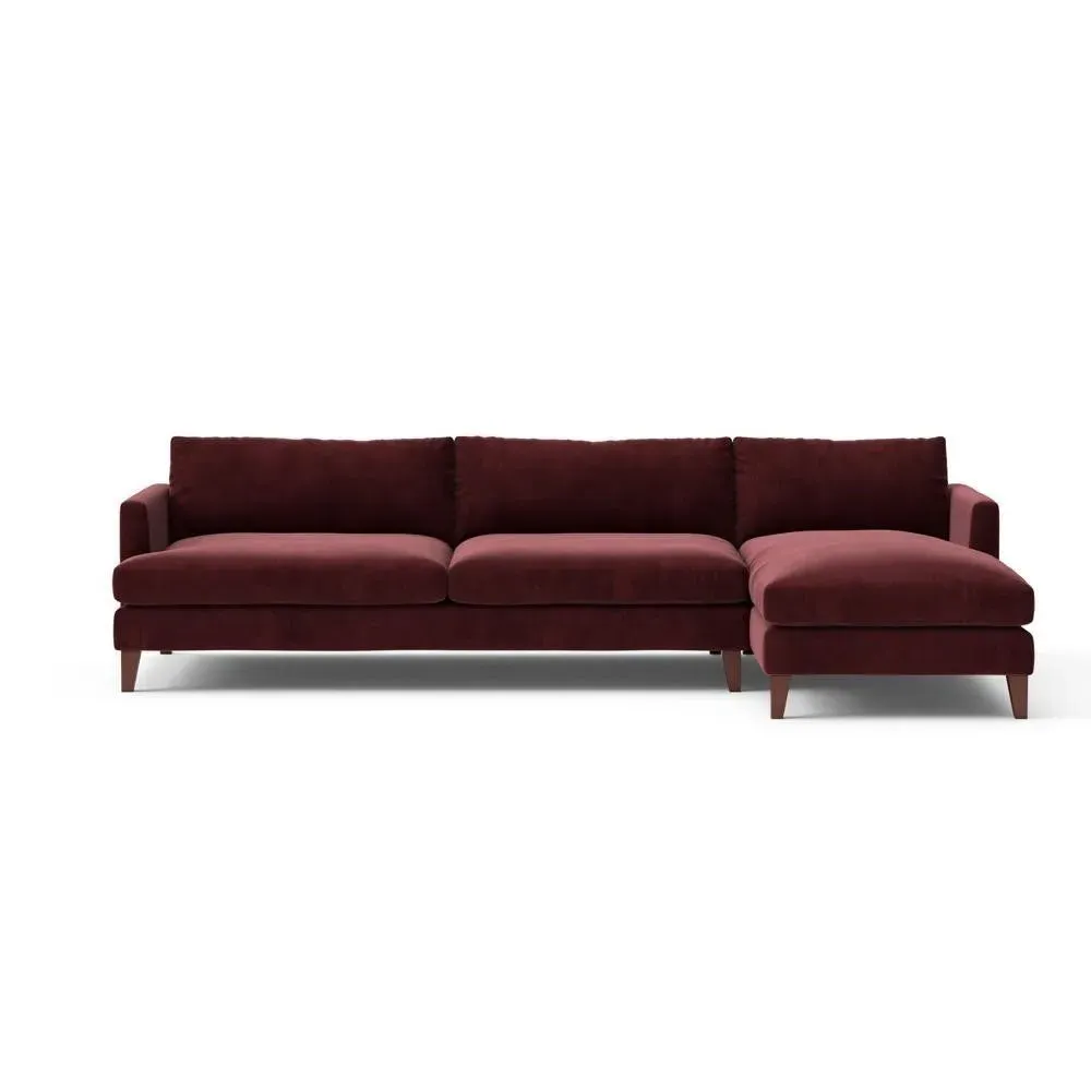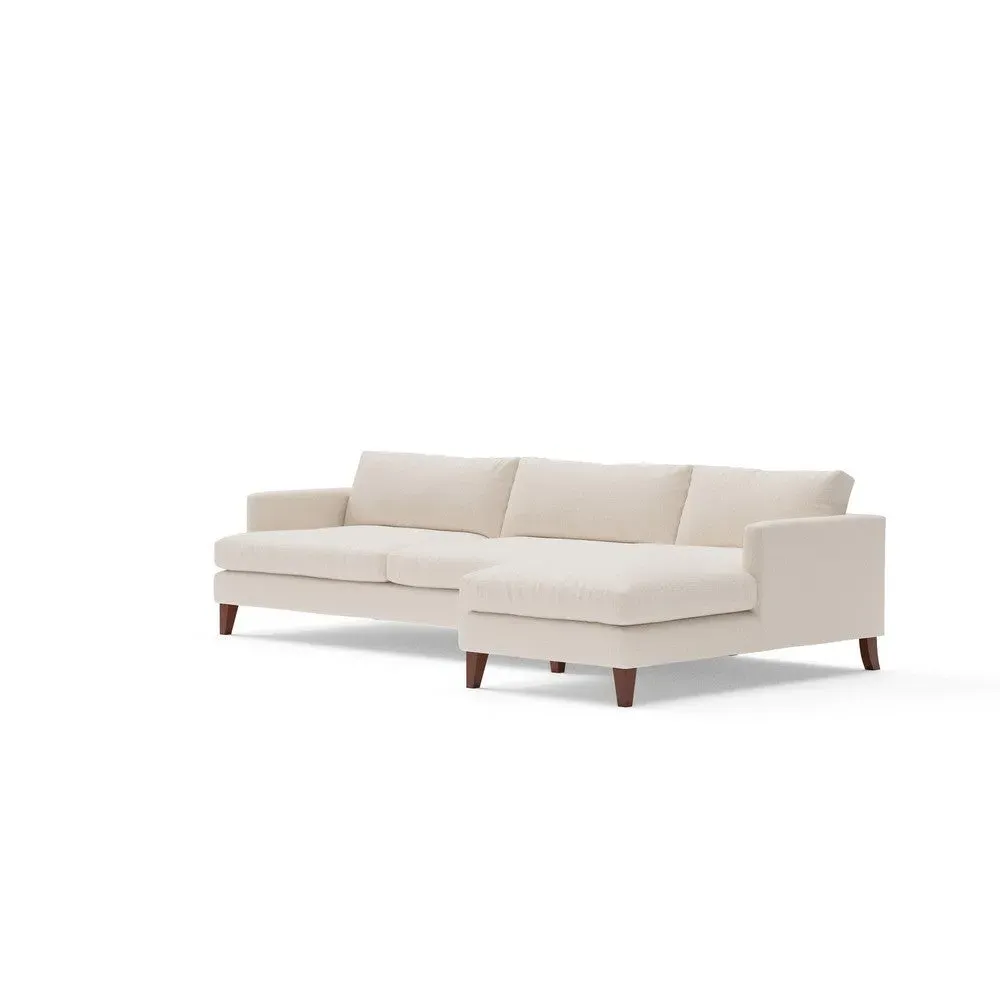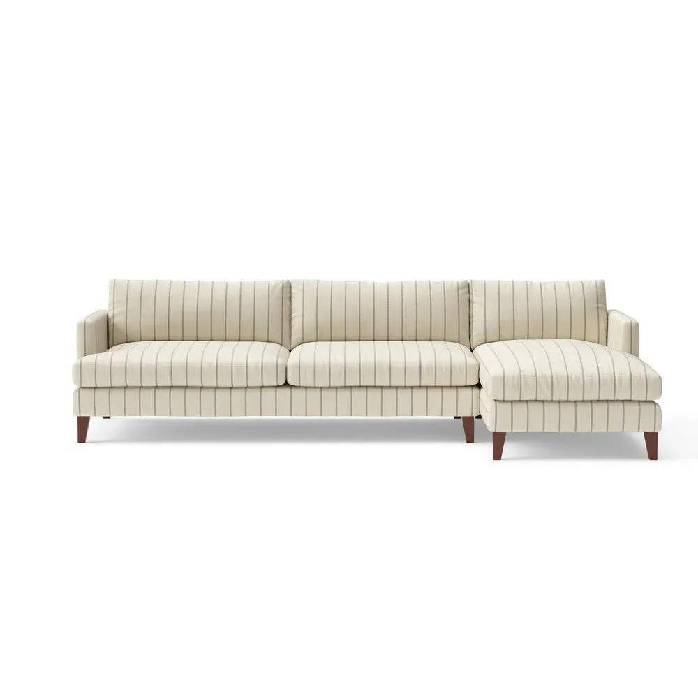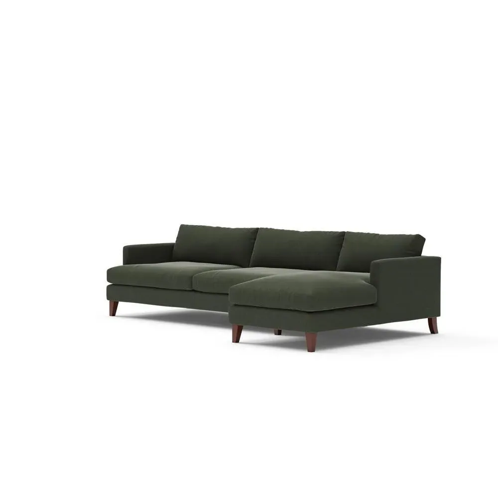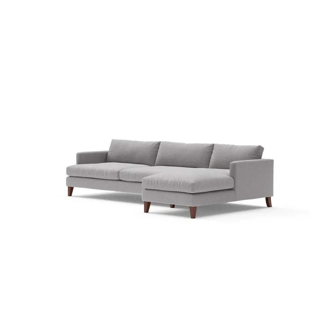 The chaise sofa offers lasting comfort with its smart, clean lines and tall arms. Its generous proportions provide ample seating space, while the house weave fabric adds texture and durability. The left-hand configuration suits various room layouts, and the tall arms ensure excellent support for relaxation.