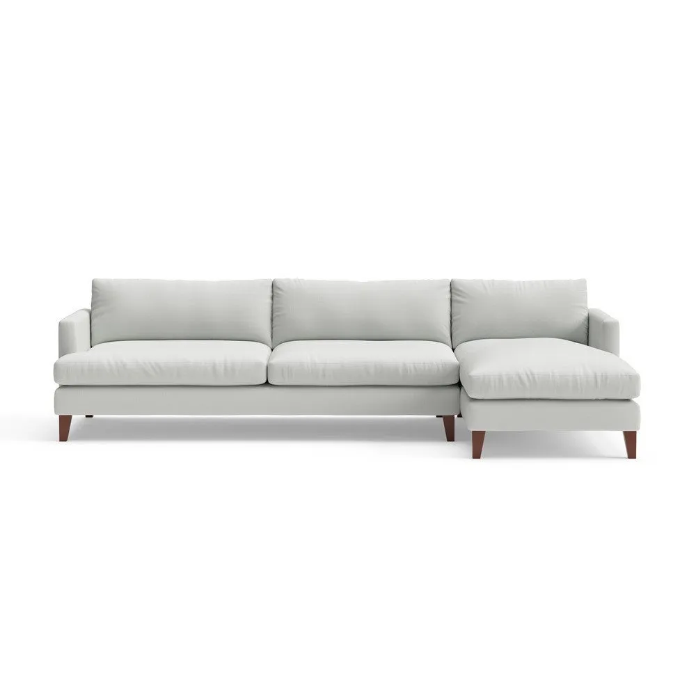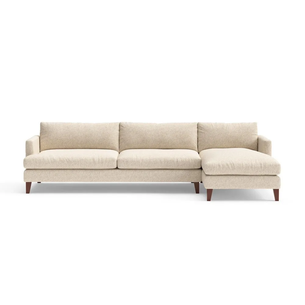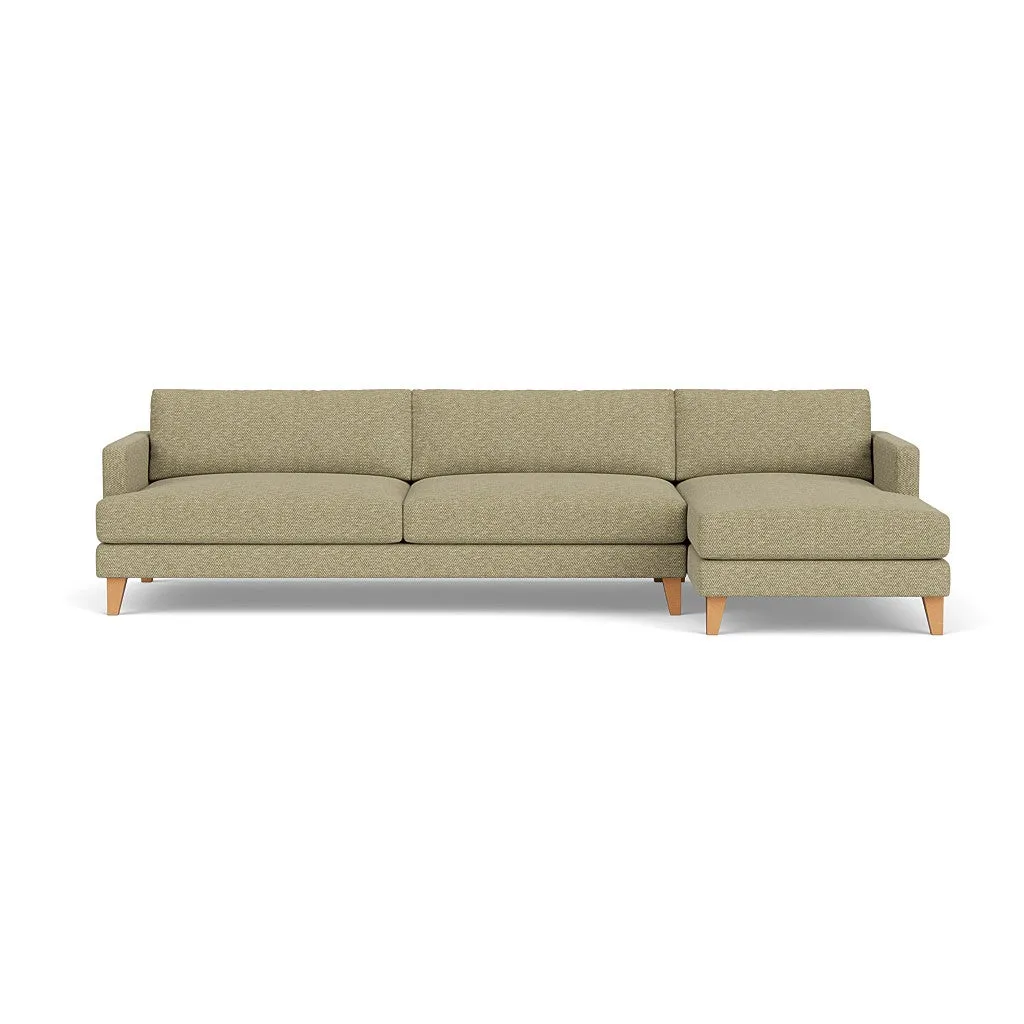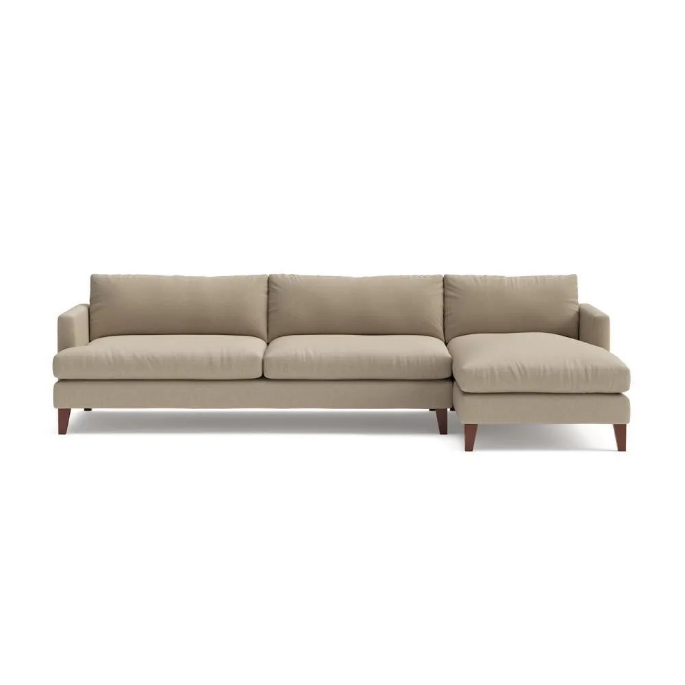 The chaise features clean lines and tall arms that deliver lasting comfort in a timeless design. Its extra large size accommodates multiple users comfortably, while the house weave fabric provides durability and texture. The right-hand configuration maximizes corner space usage, and the robust frame supports daily use.
