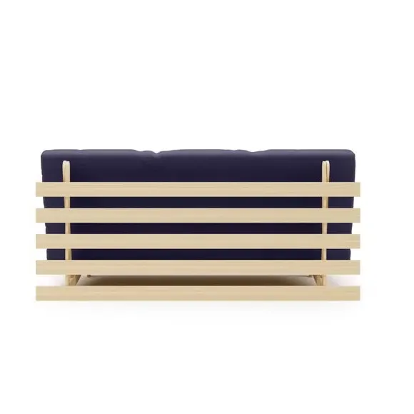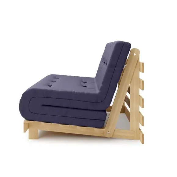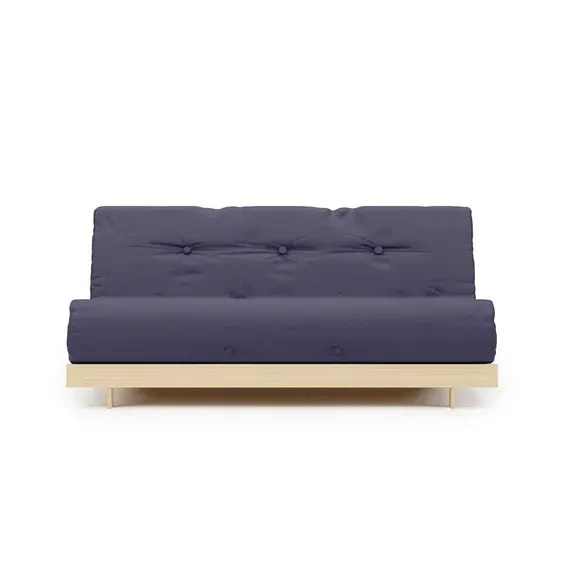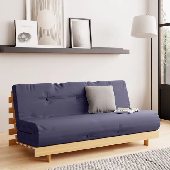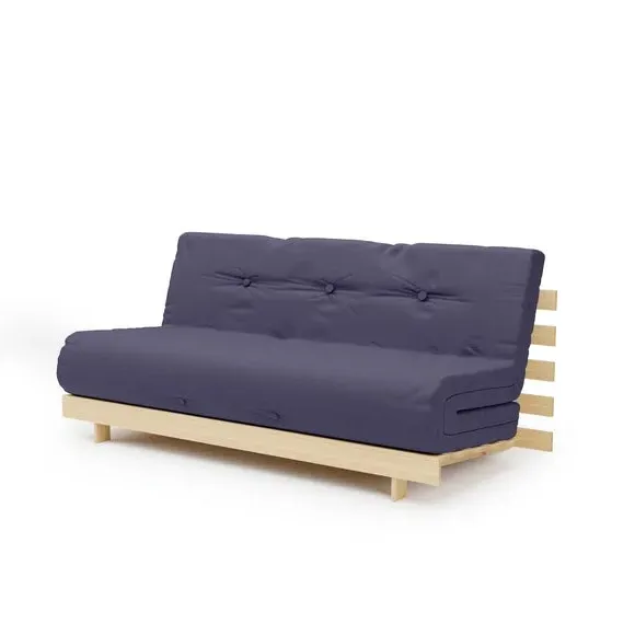 The futon offers versatile seating and sleeping with its fold-out mechanism that converts from seat to bed. Its solid pine construction provides durability, while the included fibre blend mattress features button design detailing for comfort. The space-saving design suits compact living areas, and the sturdy frame ensures reliable support for guests. W135 x D195 cm when open.
