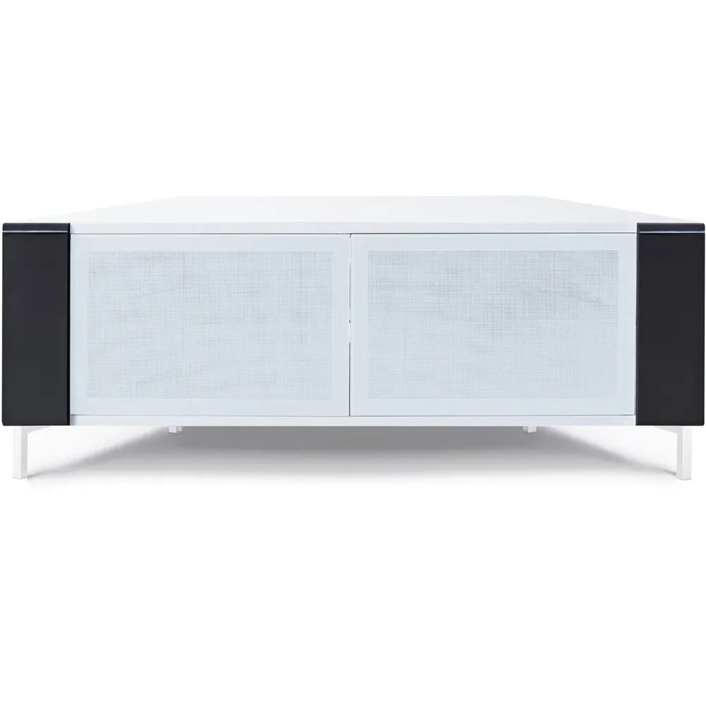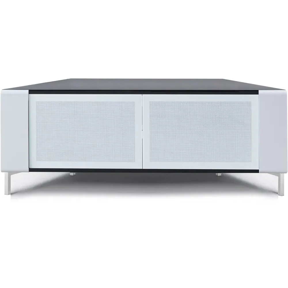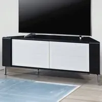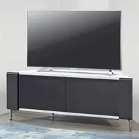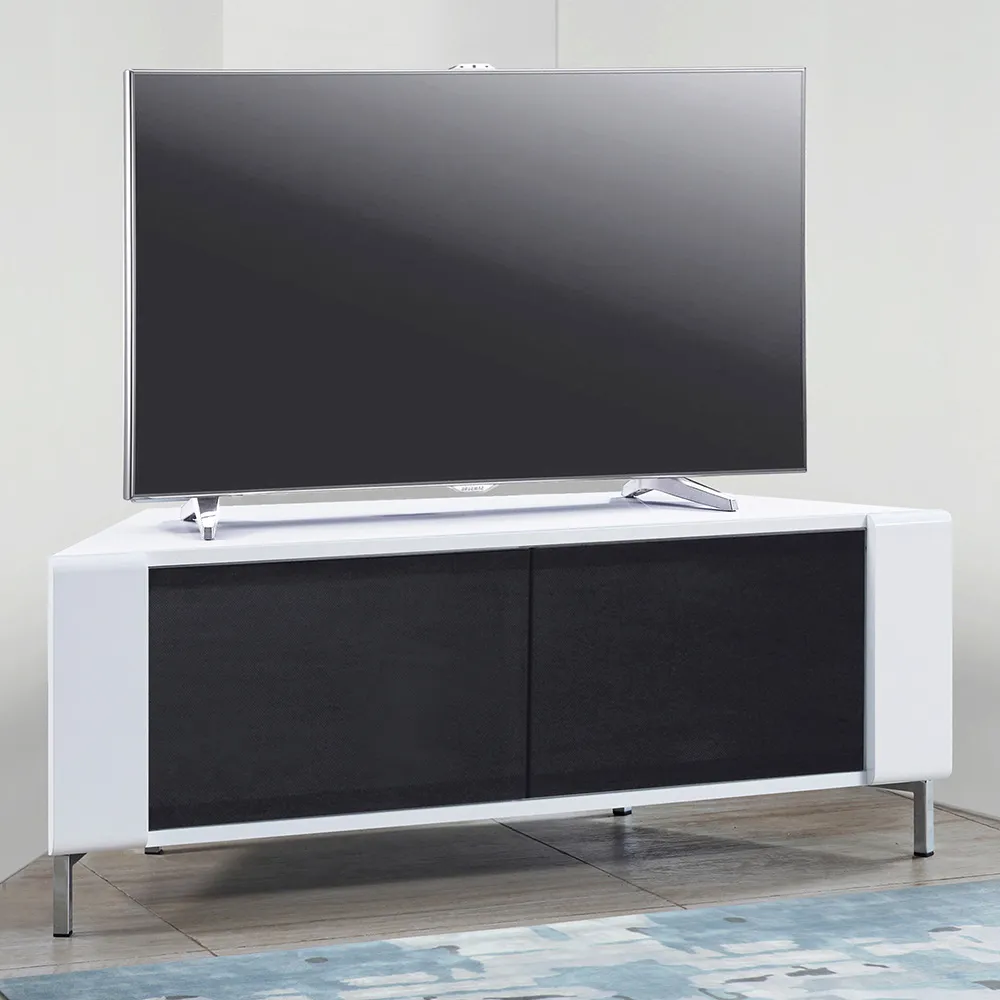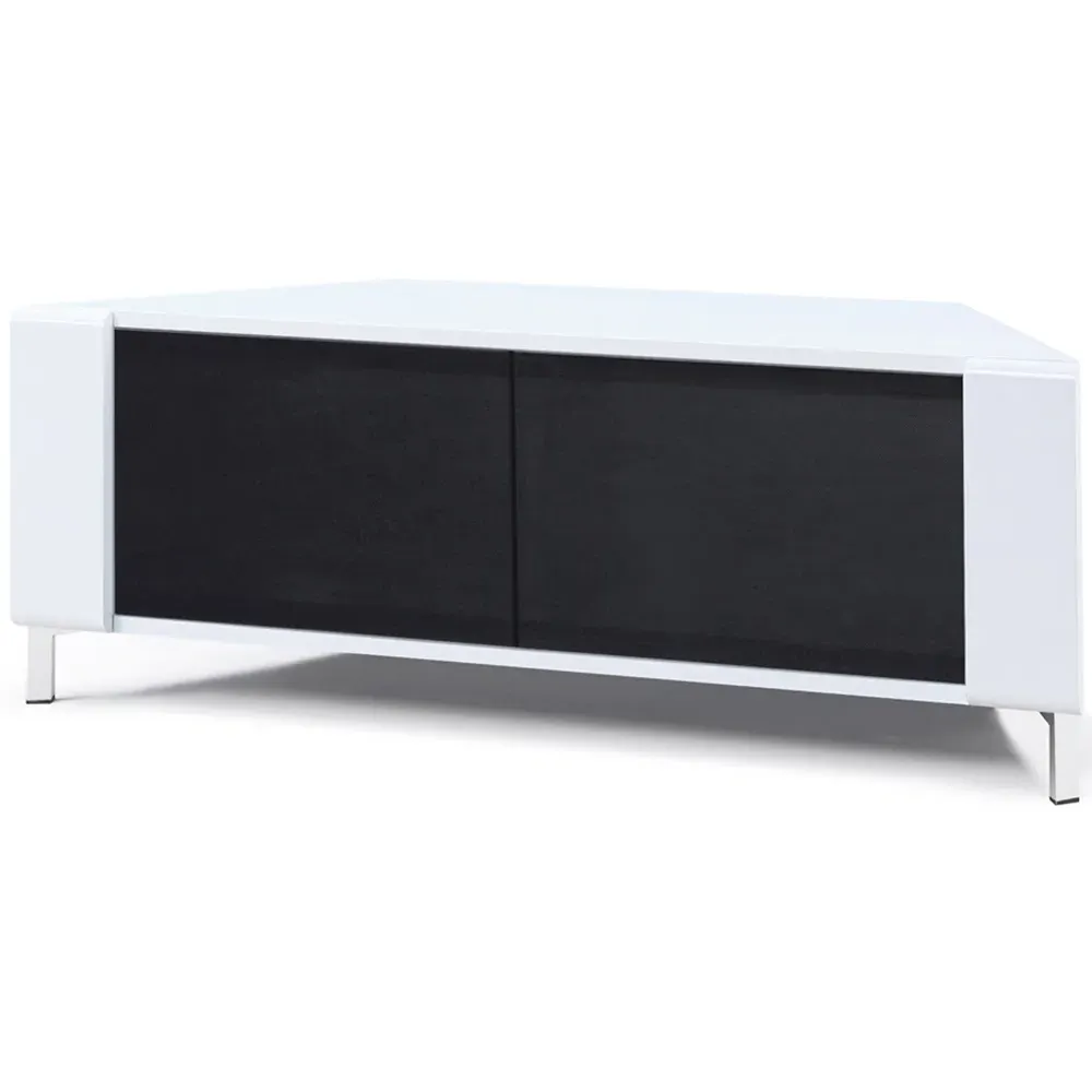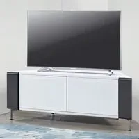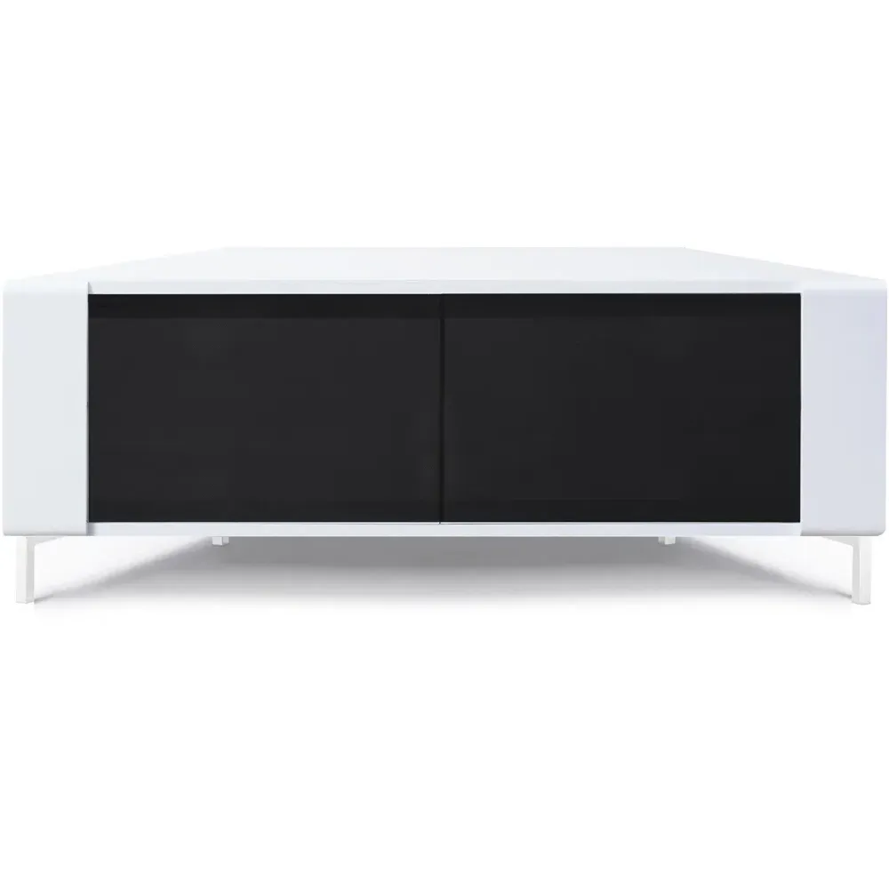 Packed with lots of features. The Corvus is a space-saving corner-positioned cabinet featuring sleek profiling together with remote-friendly doors & cable management. Ample storage can be found inside with adjustable glass shelving. Chrome legs complement the cabinet. The CORVUS comes with the revolutionary BEAMTHRU Remote-Friendly system, to allow remote control singles to pass through the glass and operate your equipment with ease. Finished in high gloss piano black/white with contrasting chrome legs. This stylish design will look perfect in any living room environment complimenting modern screens perfectly. It comes complete with cable management to hide unsightly wires at the rear, and clear and concise manuals for easy self-assembly.