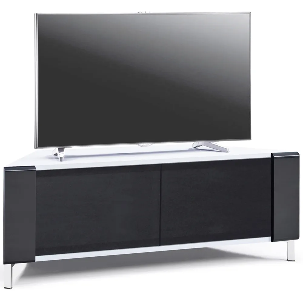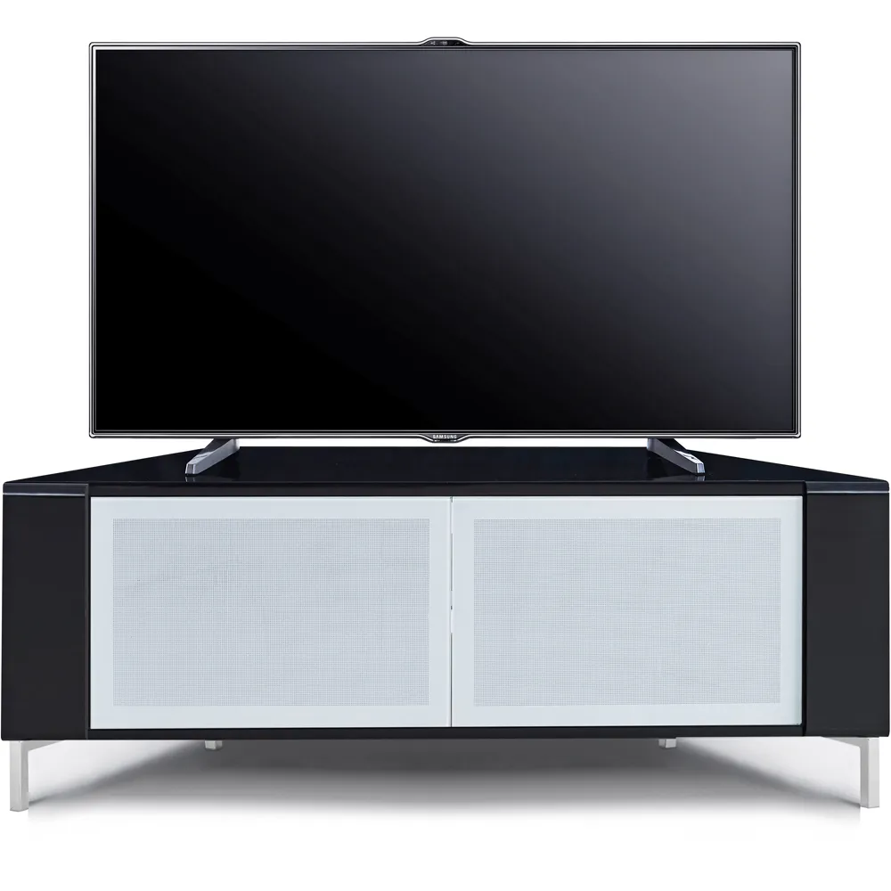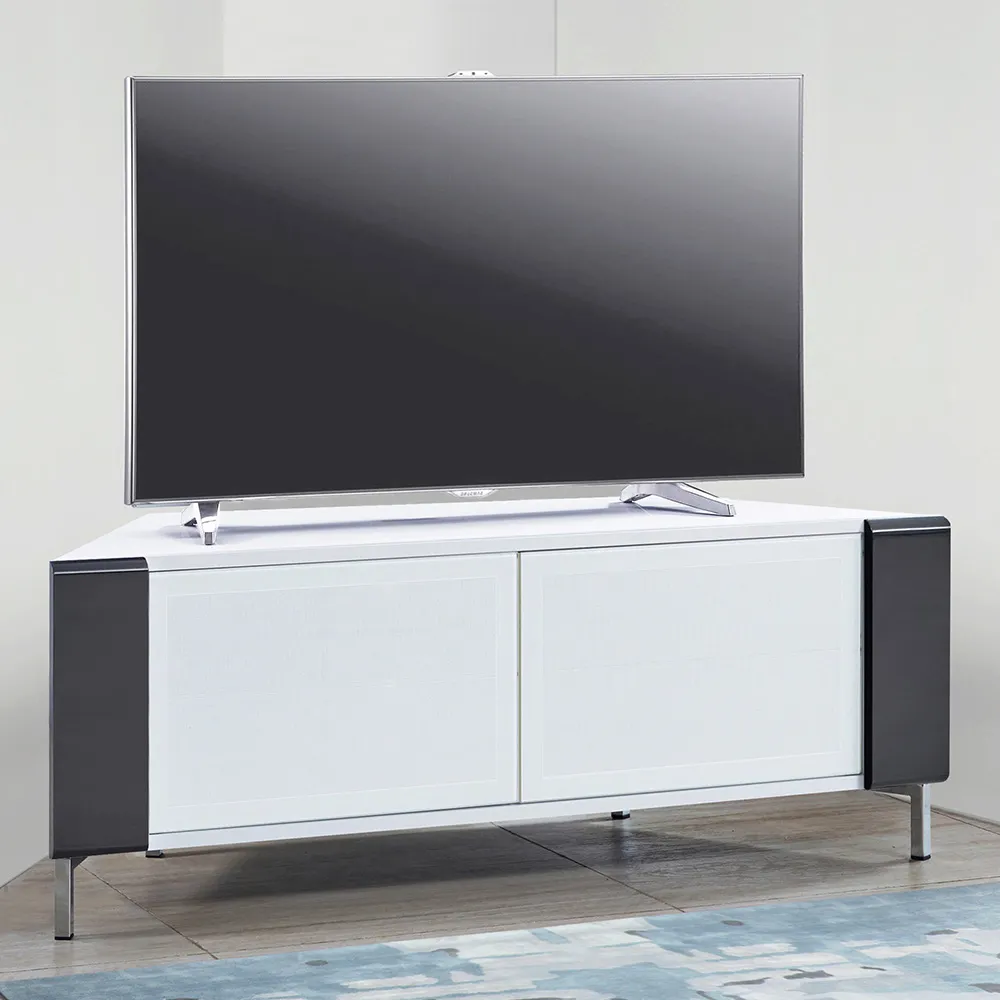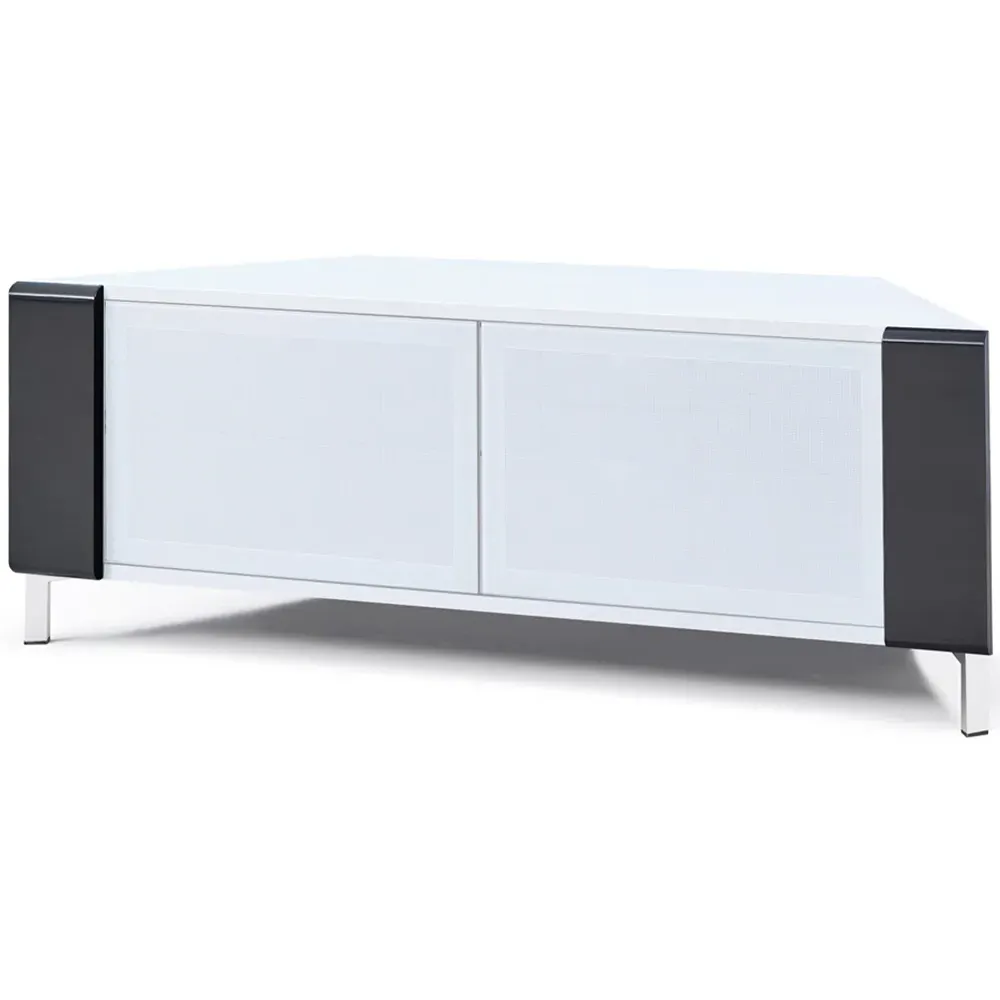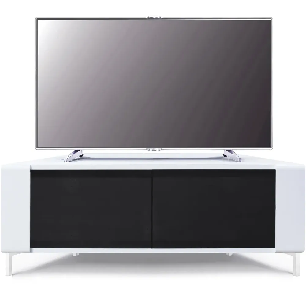 Packed with lots of features. The Corvus is a space-saving corner-positioned cabinet featuring sleek profiling together with remote-friendly doors & cable management. Ample storage can be found inside with adjustable glass shelving. Chrome legs complement the cabinet. The CORVUS comes with the revolutionary BEAMTHRU Remote-Friendly system, to allow remote control singles to pass through the glass and operate your equipment with ease. Finished in high gloss piano black/white with contrasting chrome legs. This stylish design will look perfect in any living room environment complimenting modern screens perfectly. It comes complete with cable management to hide unsightly wires at the rear, and clear and concise manuals for easy self-assembly.