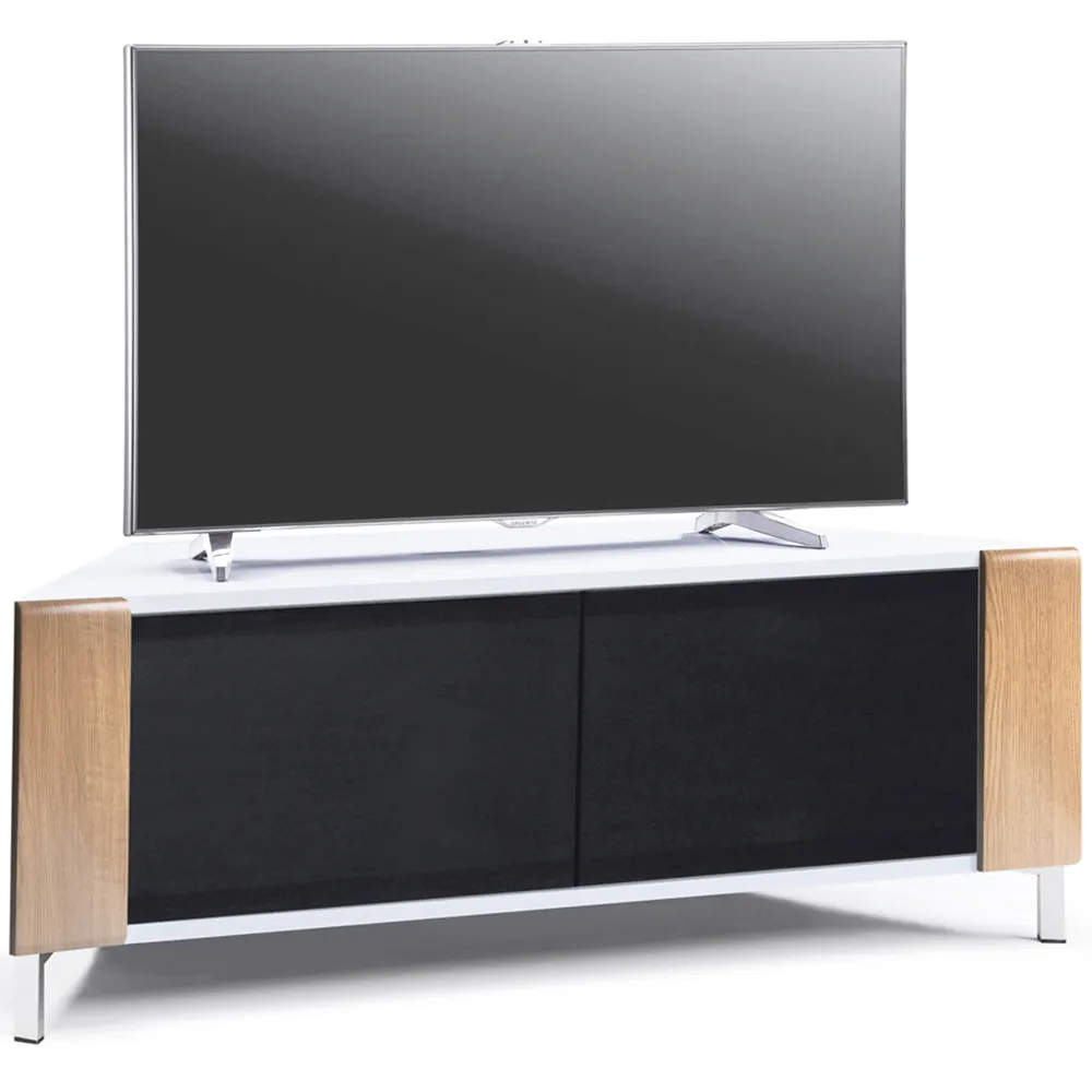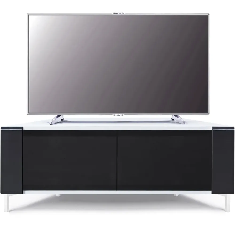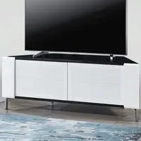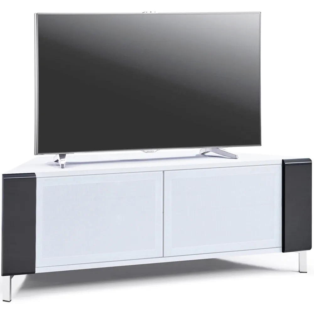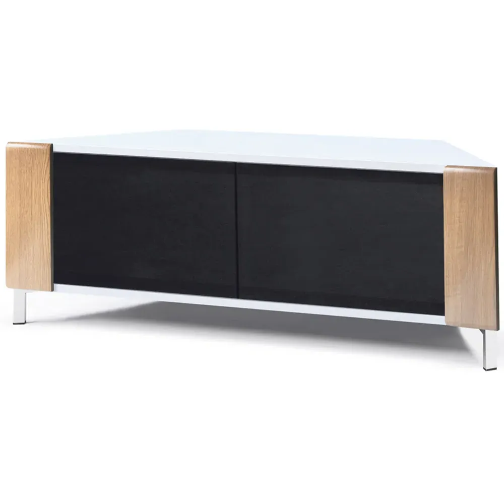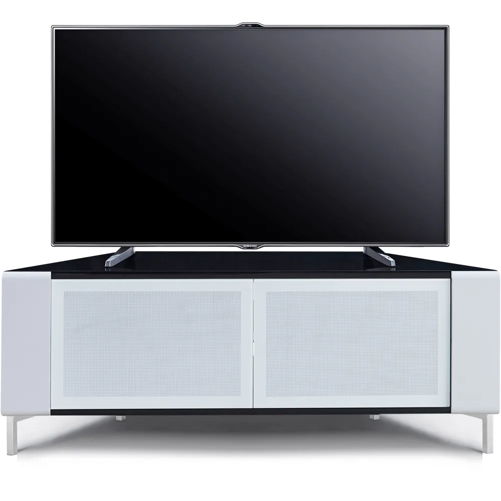 Packed with lots of features. The Corvus is a space-saving corner-positioned cabinet featuring sleek profiling together with remote-friendly doors & cable management. Ample storage can be found inside with adjustable glass shelving. Chrome legs complement the cabinet. The CORVUS comes with the revolutionary BEAMTHRU Remote-Friendly system, to allow remote control singles to pass through the glass and operate your equipment with ease. Finished in high gloss piano black/white with contrasting chrome legs. This stylish design will look perfect in any living room environment complimenting modern screens perfectly. It comes complete with cable management to hide unsightly wires at the rear, and clear and concise manuals for easy self-assembly.