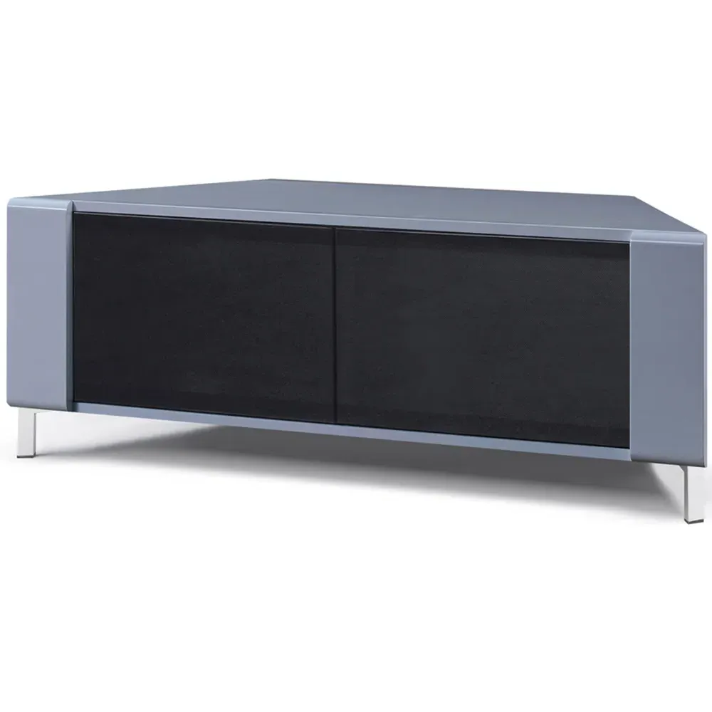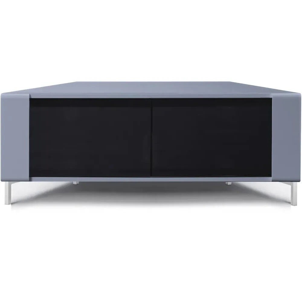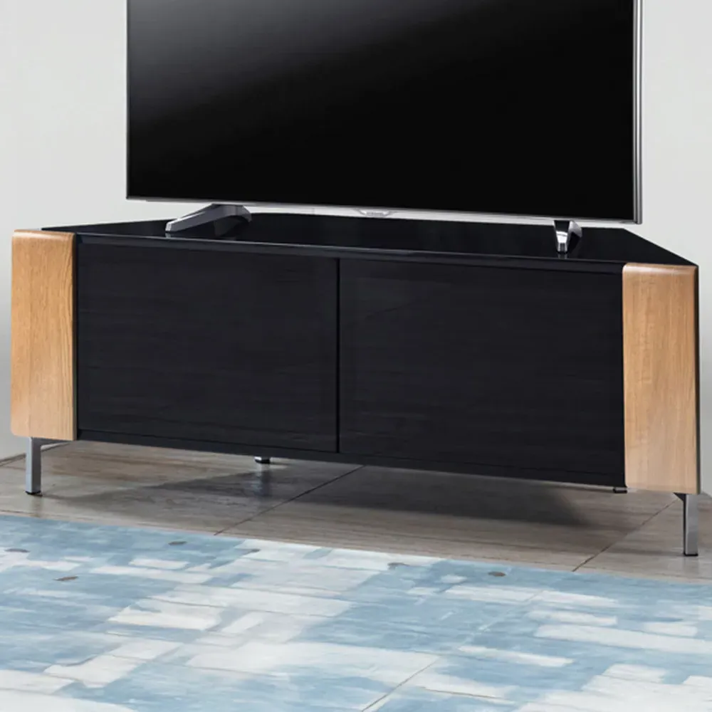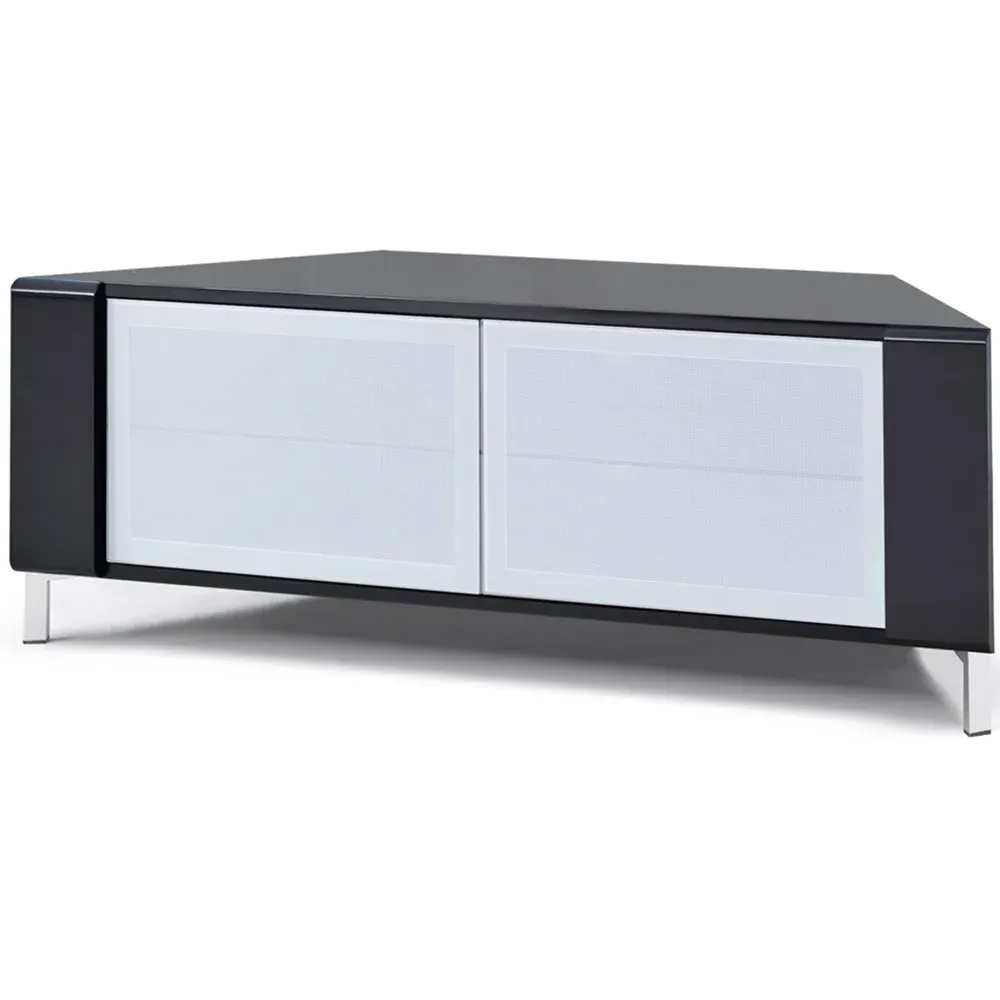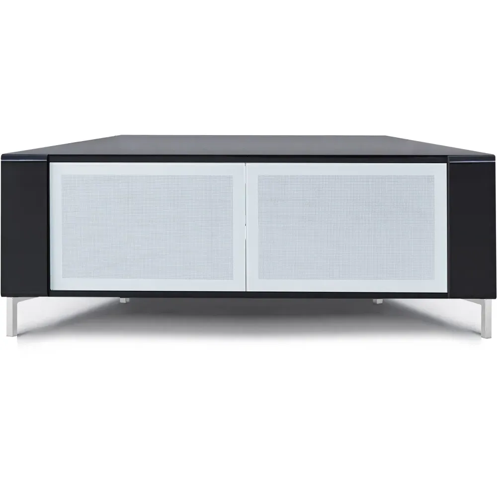 The Corvus TV cabinet offers space-saving corner positioning with remote-friendly doors and integrated cable management. Its adjustable glass shelving provides ample storage, while the BEAMTHRU system allows remote control signals to pass through the glass doors. The high gloss piano black finish combines with contrasting chrome legs for durability and visual appeal.
