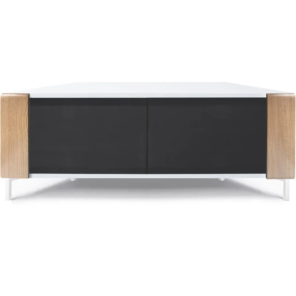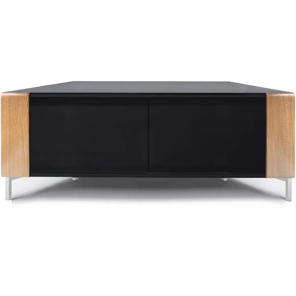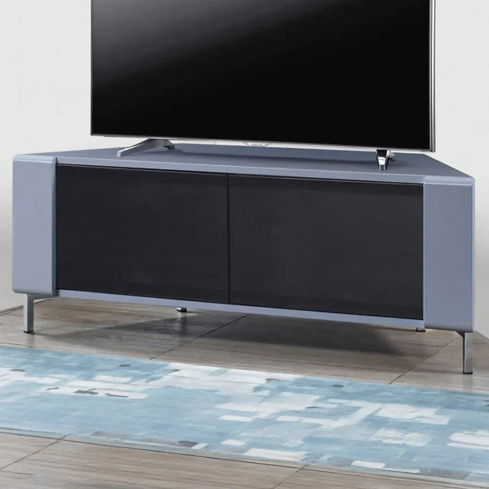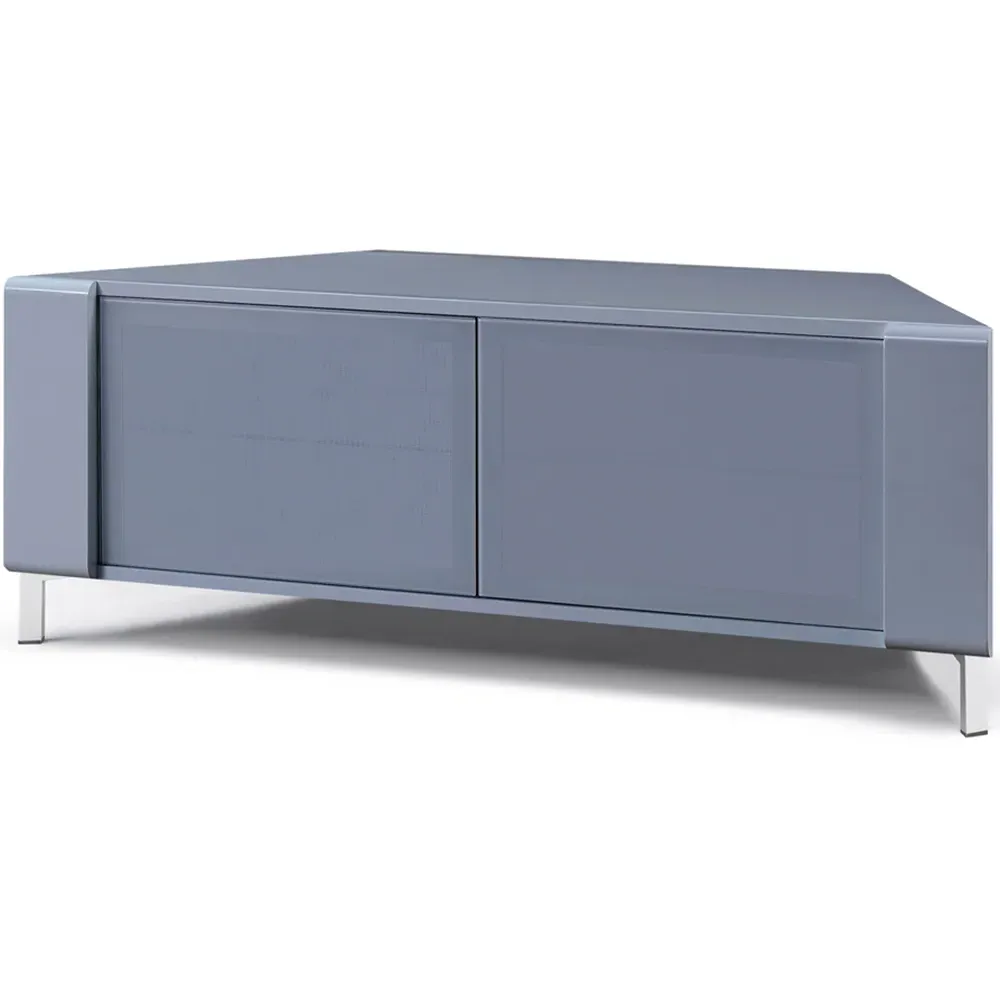 The Corvus TV cabinet offers space-saving corner positioning with remote-friendly doors and integrated cable management. Its adjustable glass shelving provides ample storage, while the BEAMTHRU system allows remote control signals to pass through the glass doors. The high gloss piano black finish combines with contrasting chrome legs for durability and visual appeal.