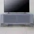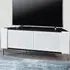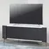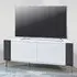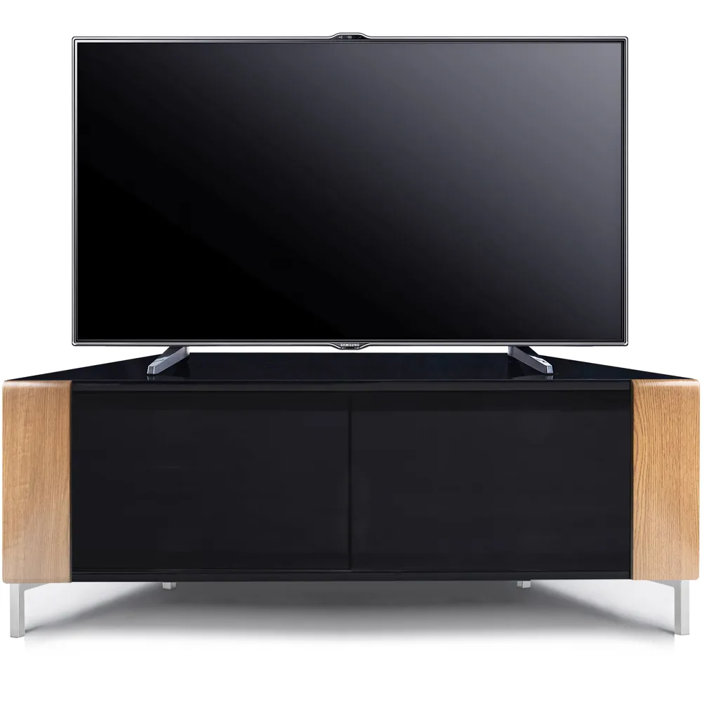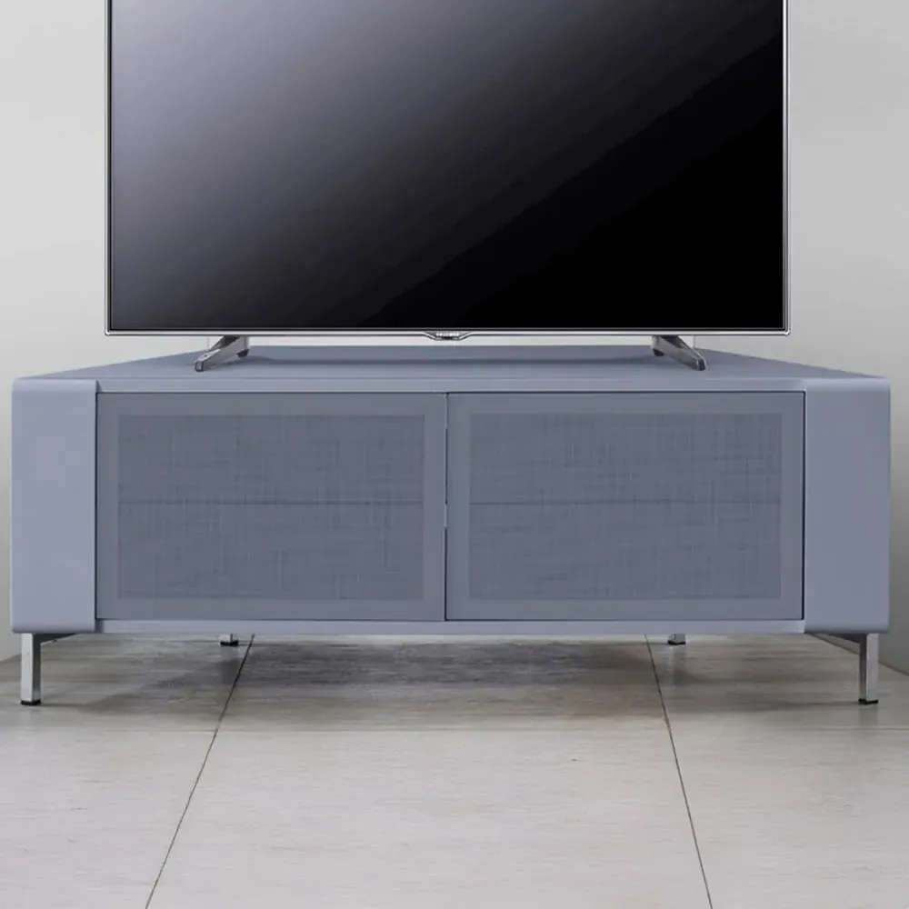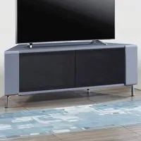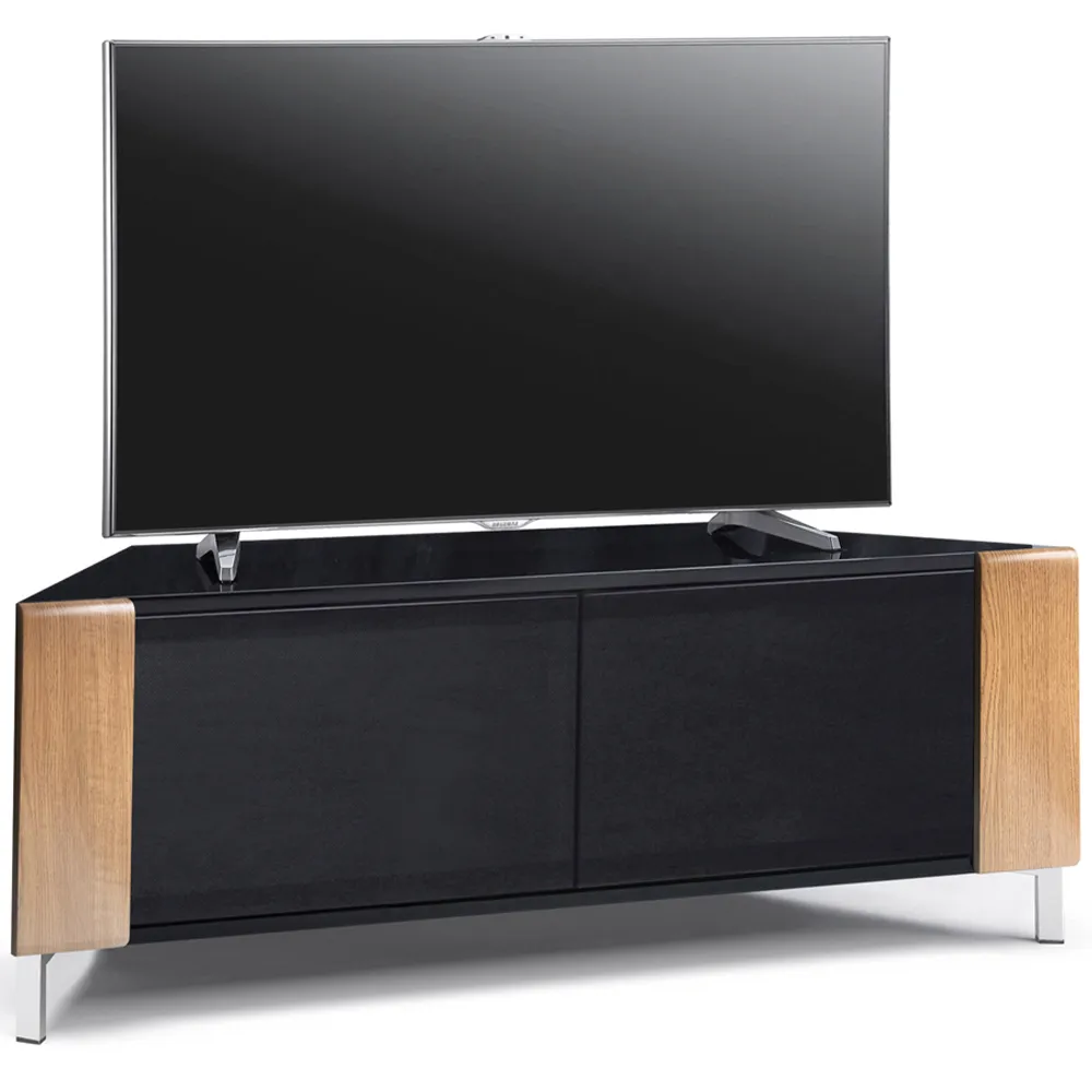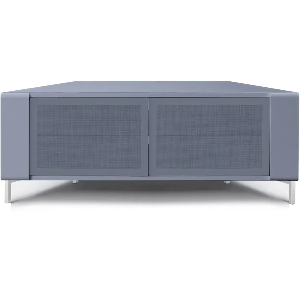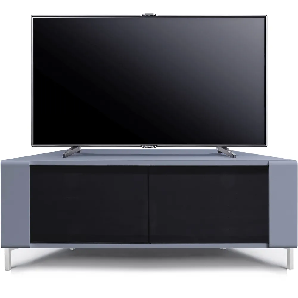 The Corvus TV cabinet offers space-saving corner positioning with remote-friendly doors and integrated cable management. Its adjustable glass shelving provides ample storage, while the BEAMTHRU system allows remote control signals to pass through the glass doors. The high gloss piano black finish combines with contrasting chrome legs for durability and visual appeal.