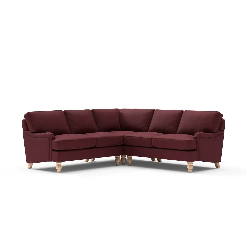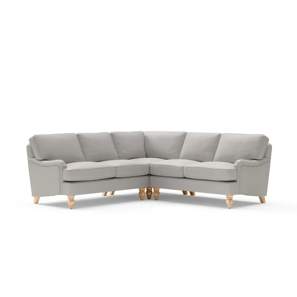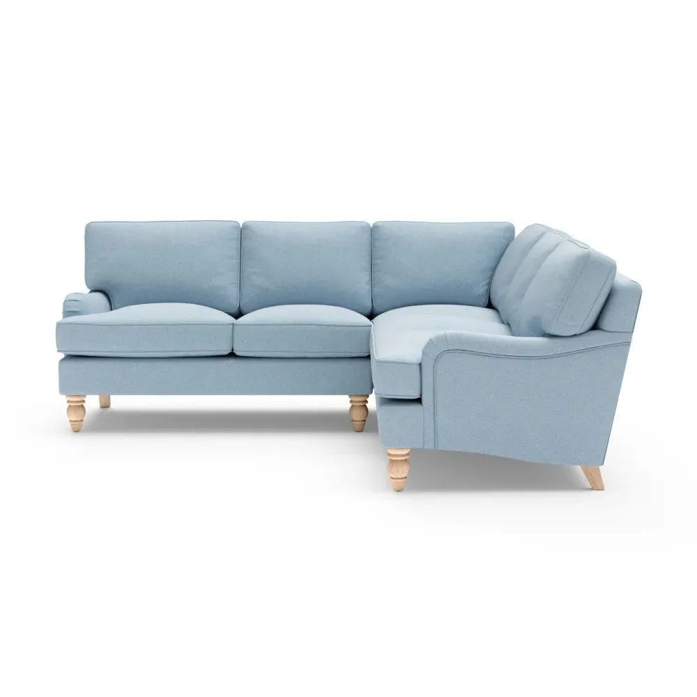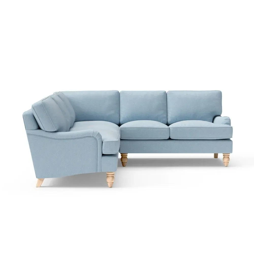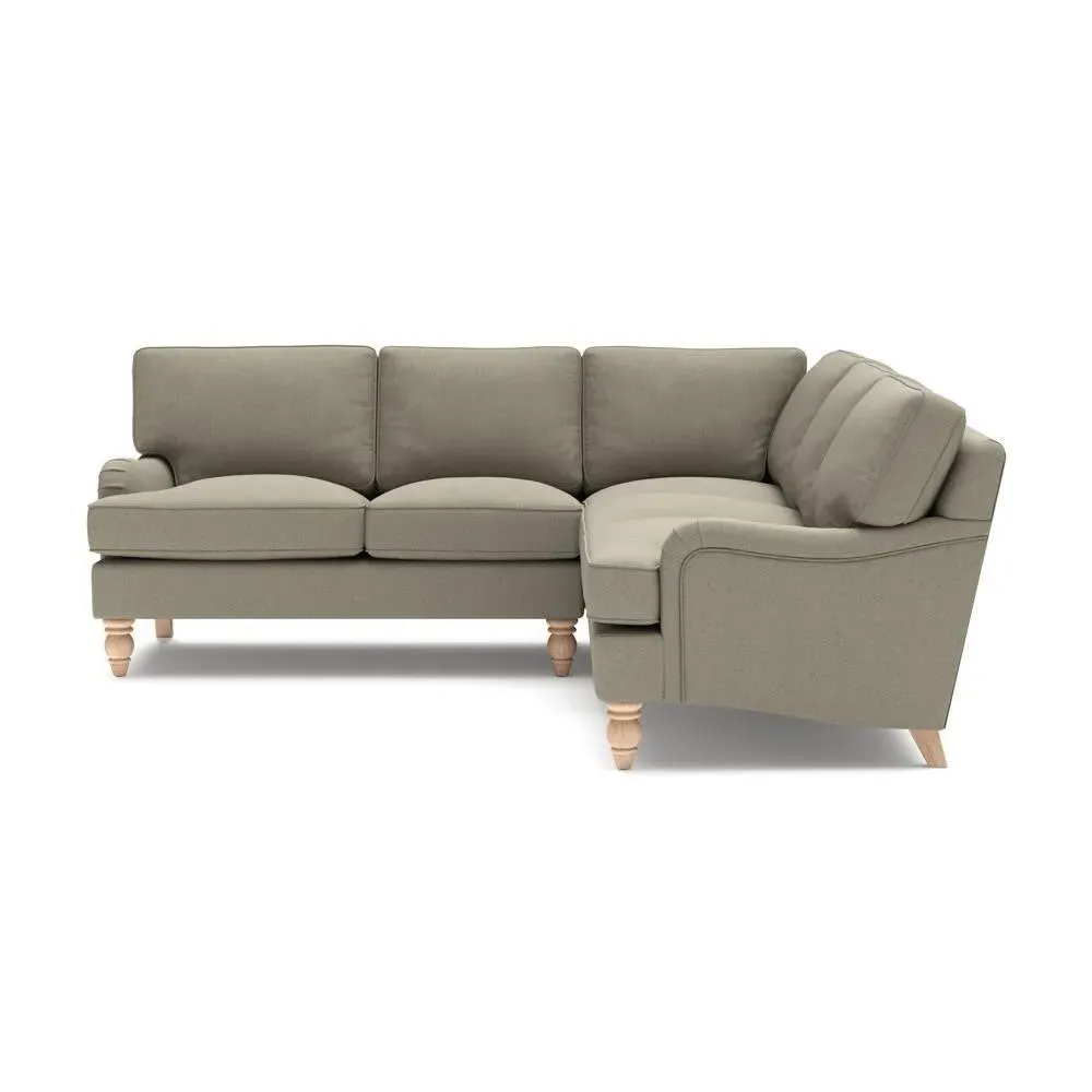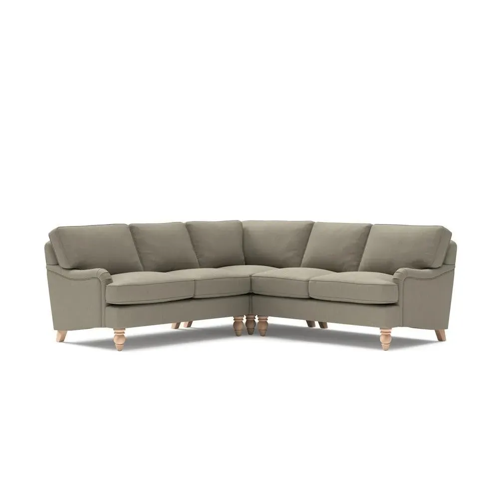 The corner sofa offers sink-in comfort with its low arms that accommodate stretching out with feet up. Its relaxed design features house linen mix upholstery, while the construction provides both luxurious feather and low maintenance interior options. The low-profile arms suit lounging, and the corner configuration maximizes seating space.