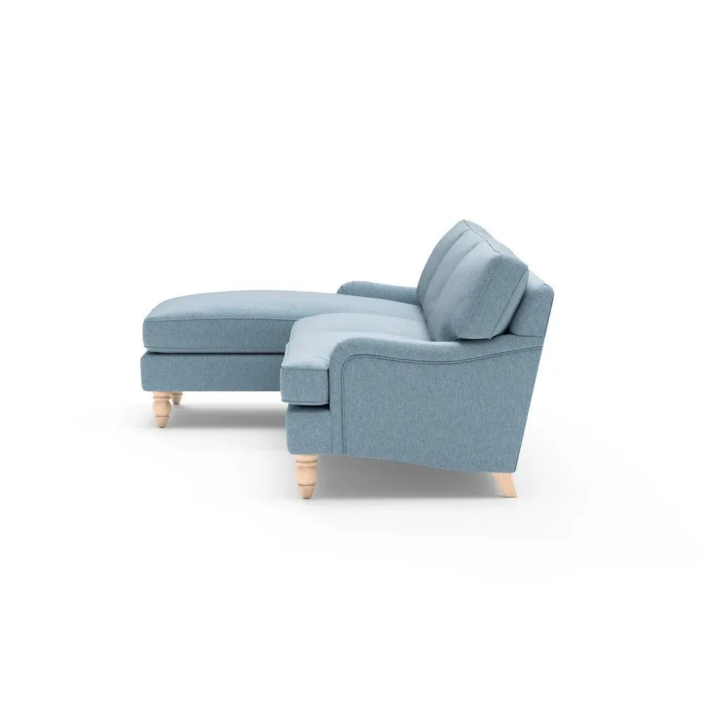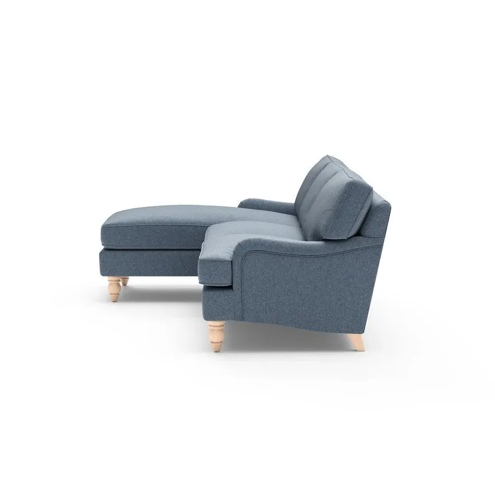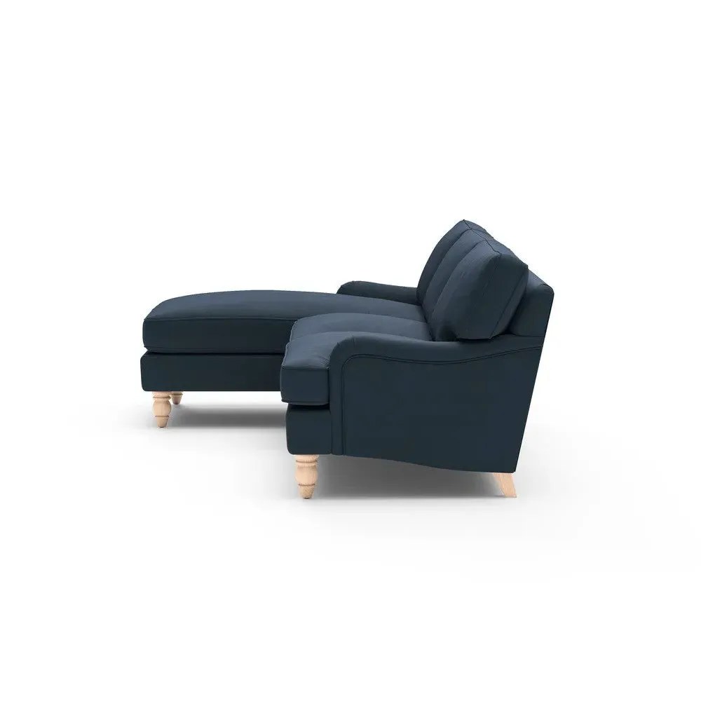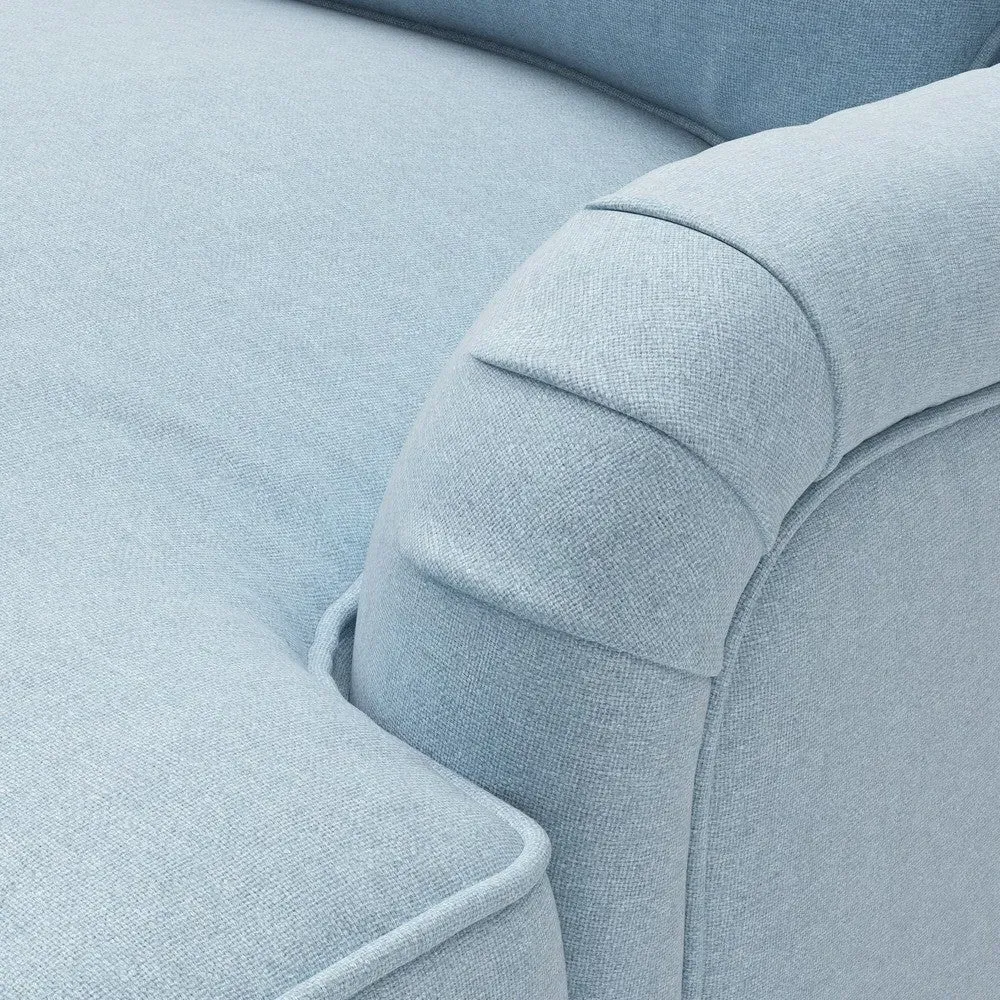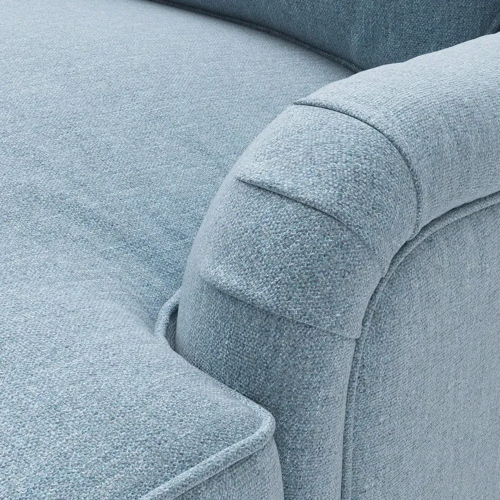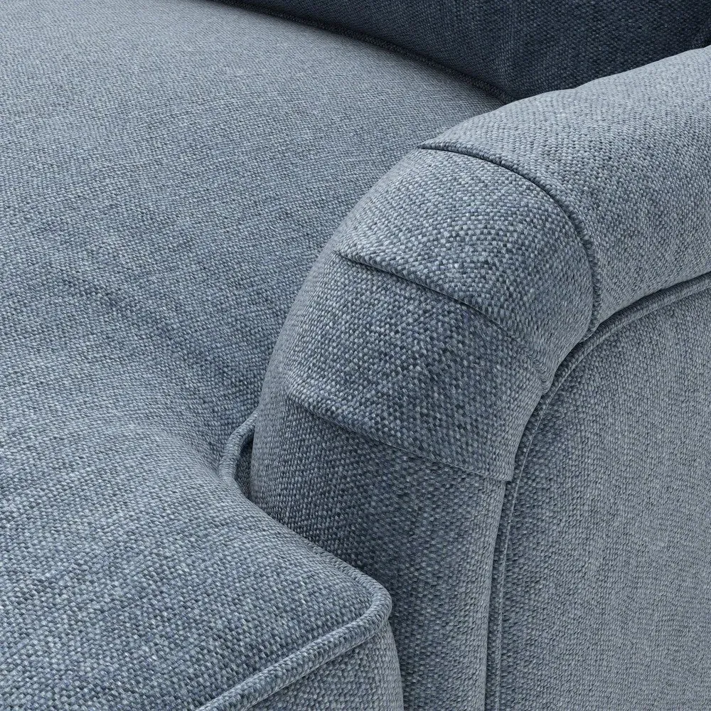 The chaise sofa offers sink-in comfort with its low arms that accommodate stretching out with feet up. Its relaxed design features luxurious feather or low maintenance interior options, while the construction draws from English design principles. The low-profile arms provide versatile lounging positions, and the substantial build ensures lasting comfort.