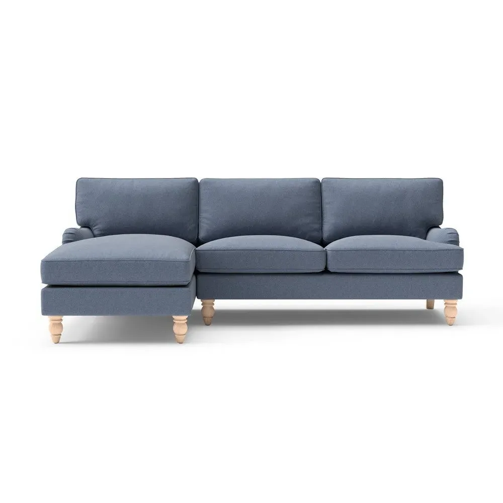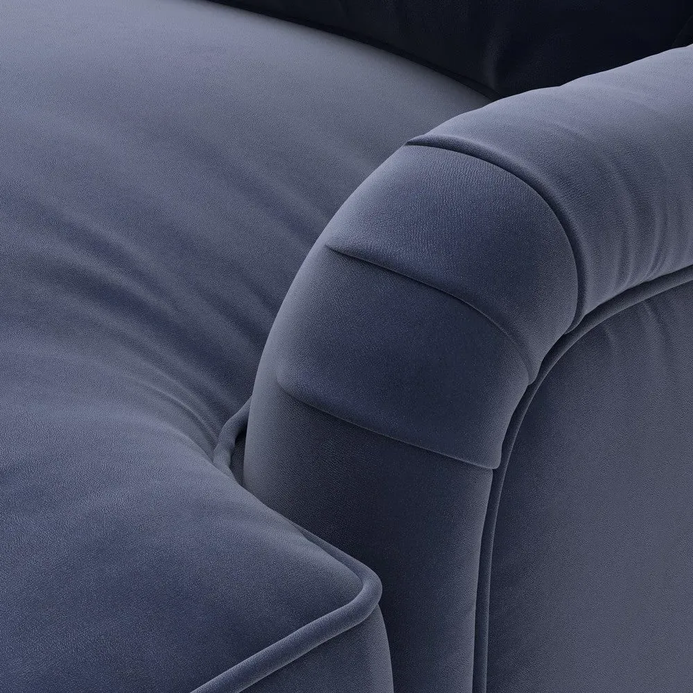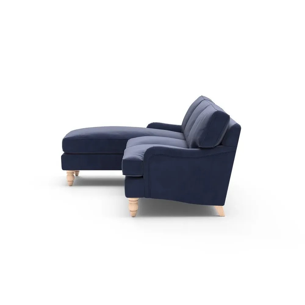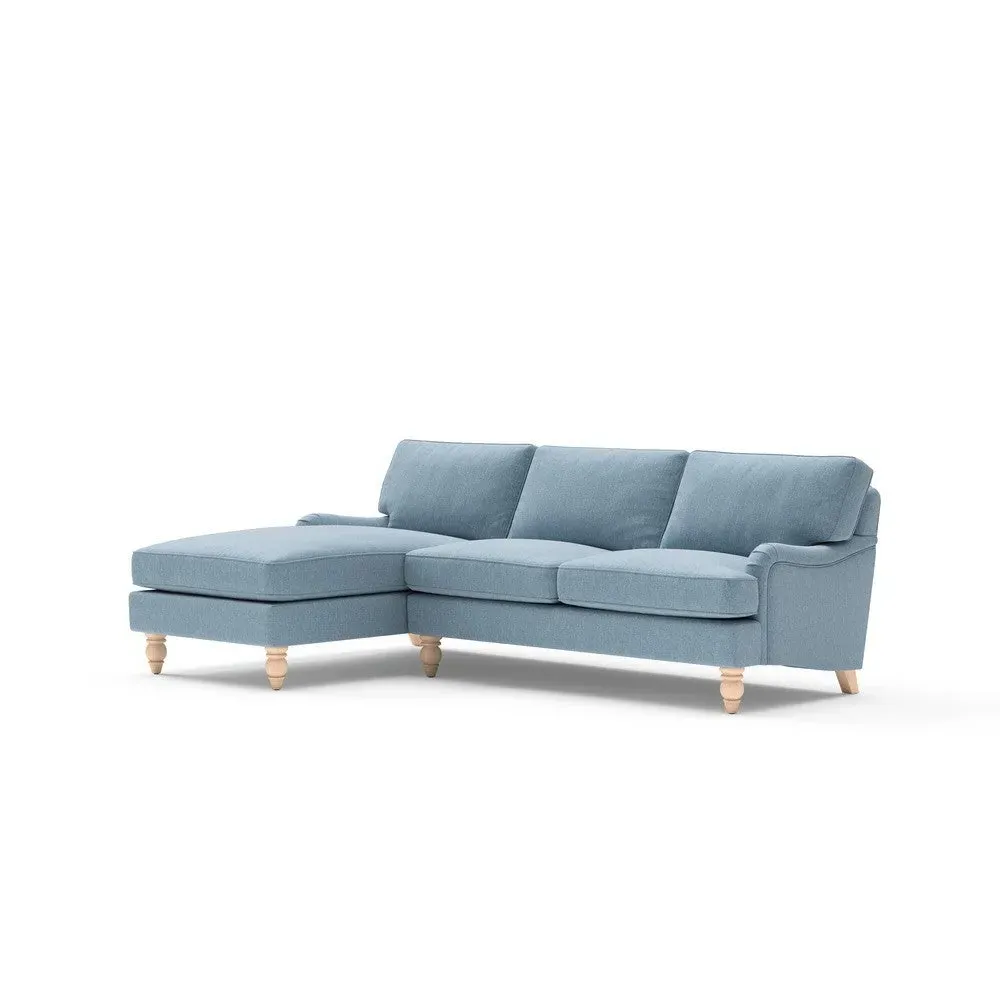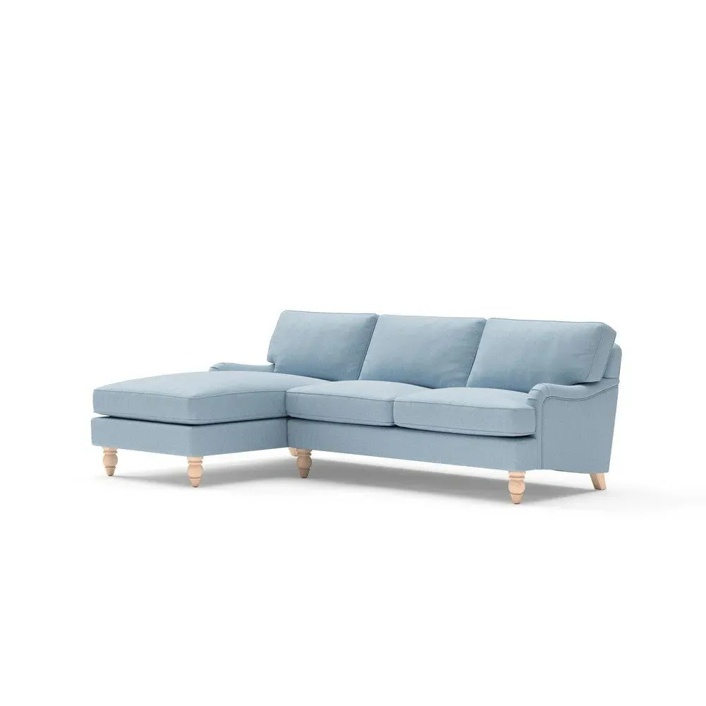 The chaise sofa offers sink-in comfort with its low arms that accommodate stretching out with feet up. Its relaxed design features luxurious feather or low maintenance interior options, while the construction draws from English design principles. The low-profile arms provide versatile lounging positions, and the substantial build ensures lasting comfort.