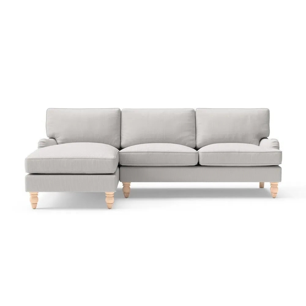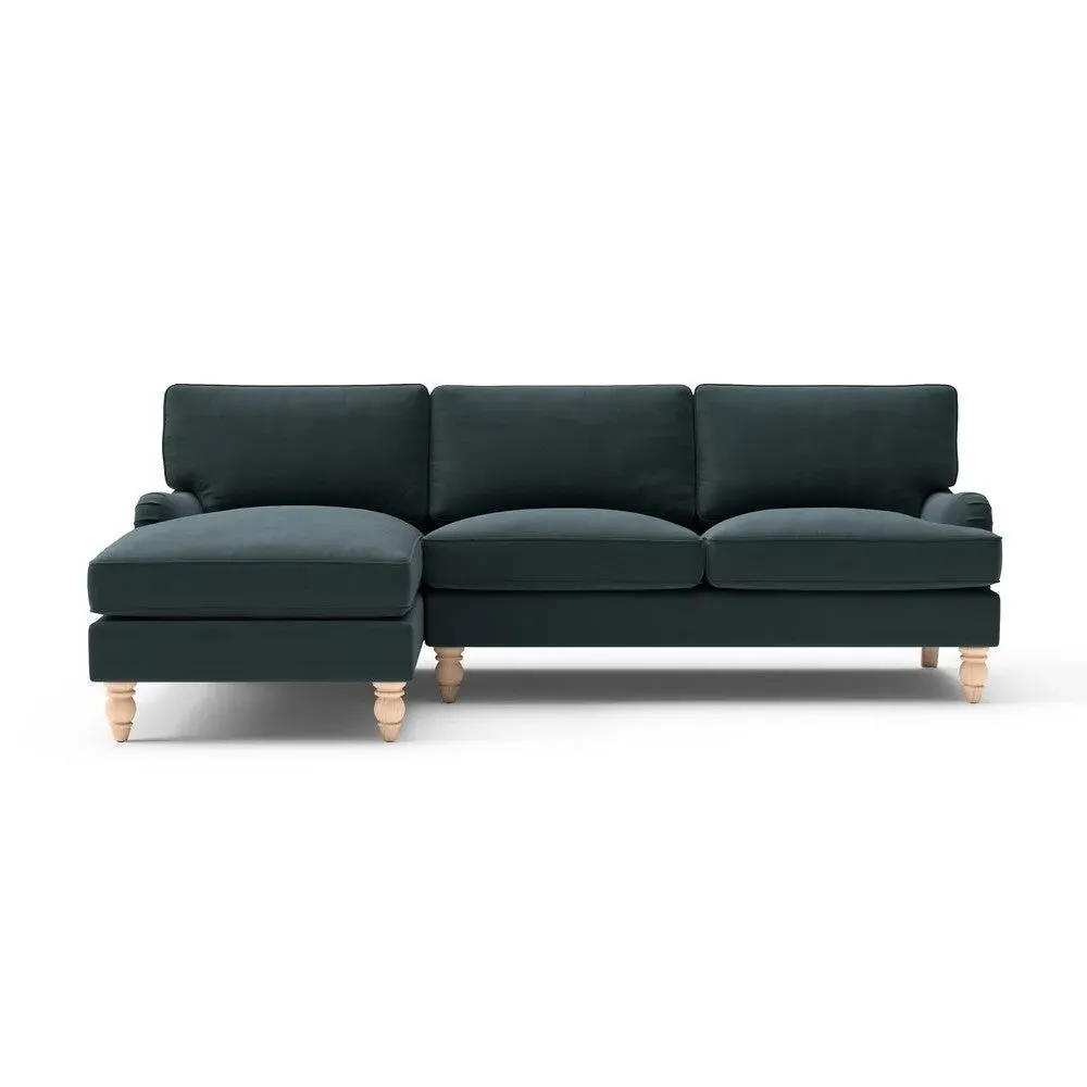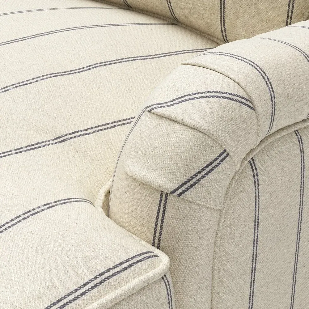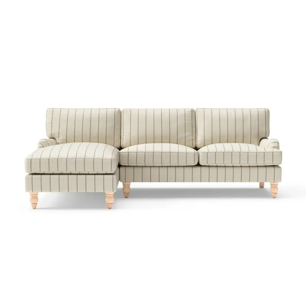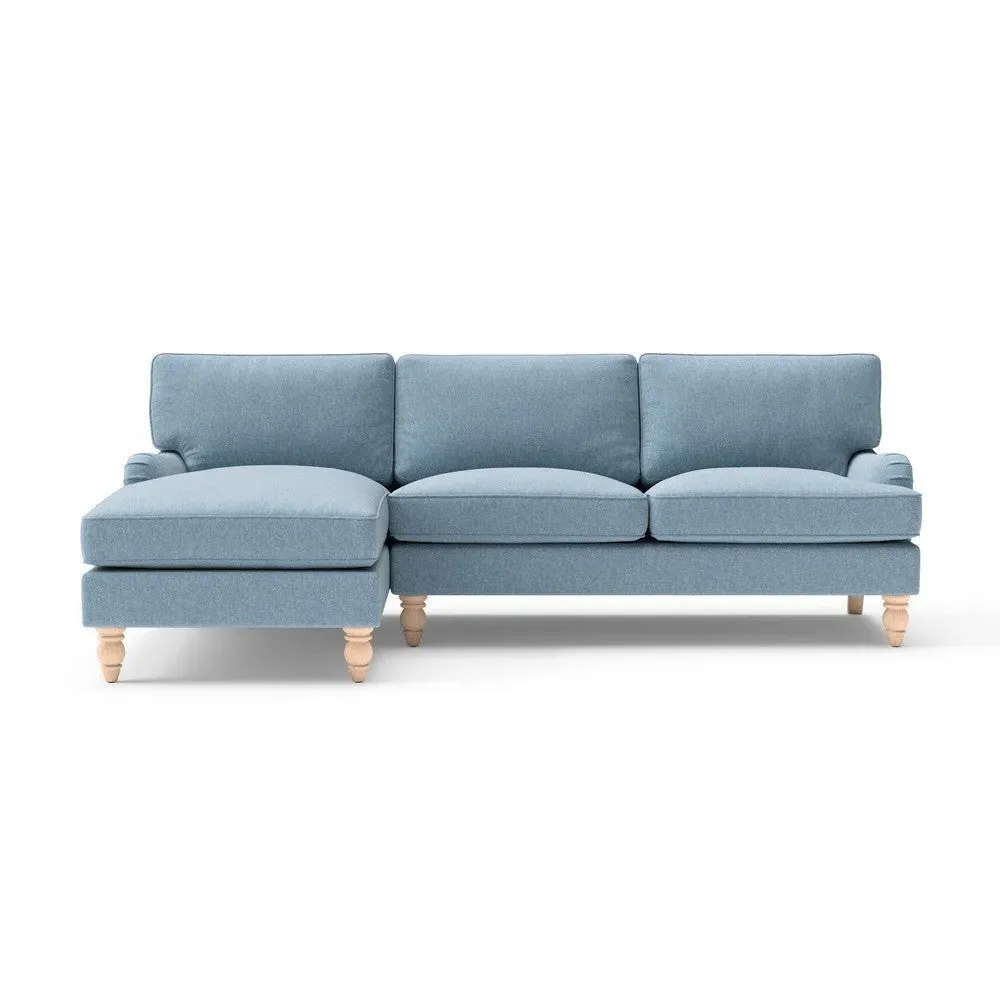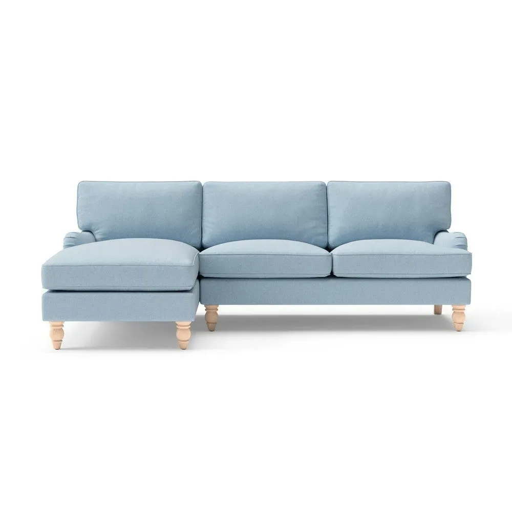 The chaise sofa offers sink-in comfort with its low arms that accommodate stretching out with feet up. Its relaxed design features luxurious feather or low maintenance interior options, while the construction draws from English design principles. The low-profile arms provide versatile lounging positions, and the substantial build ensures lasting comfort.