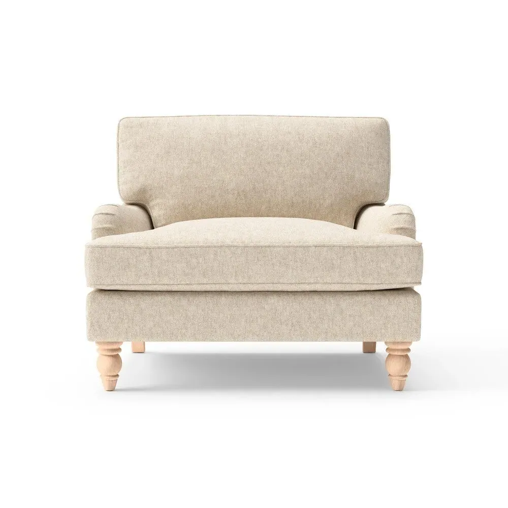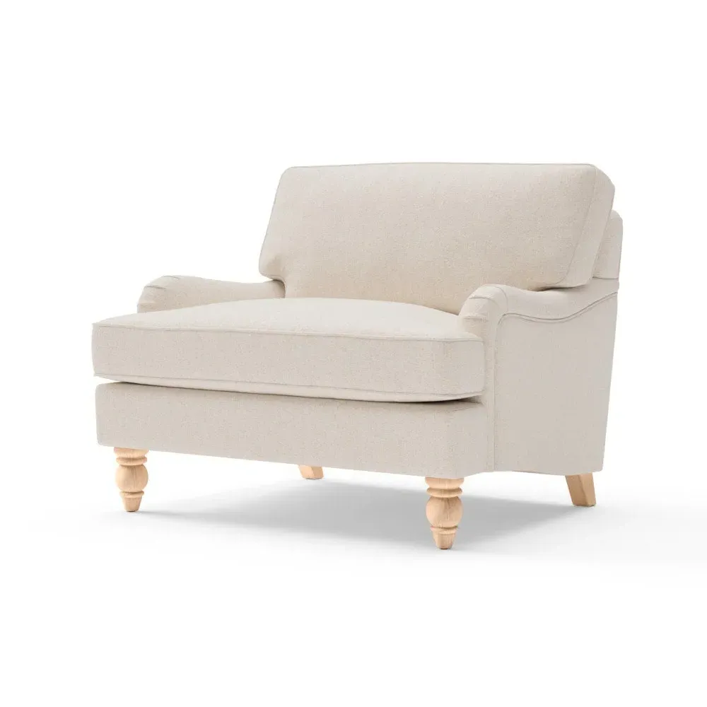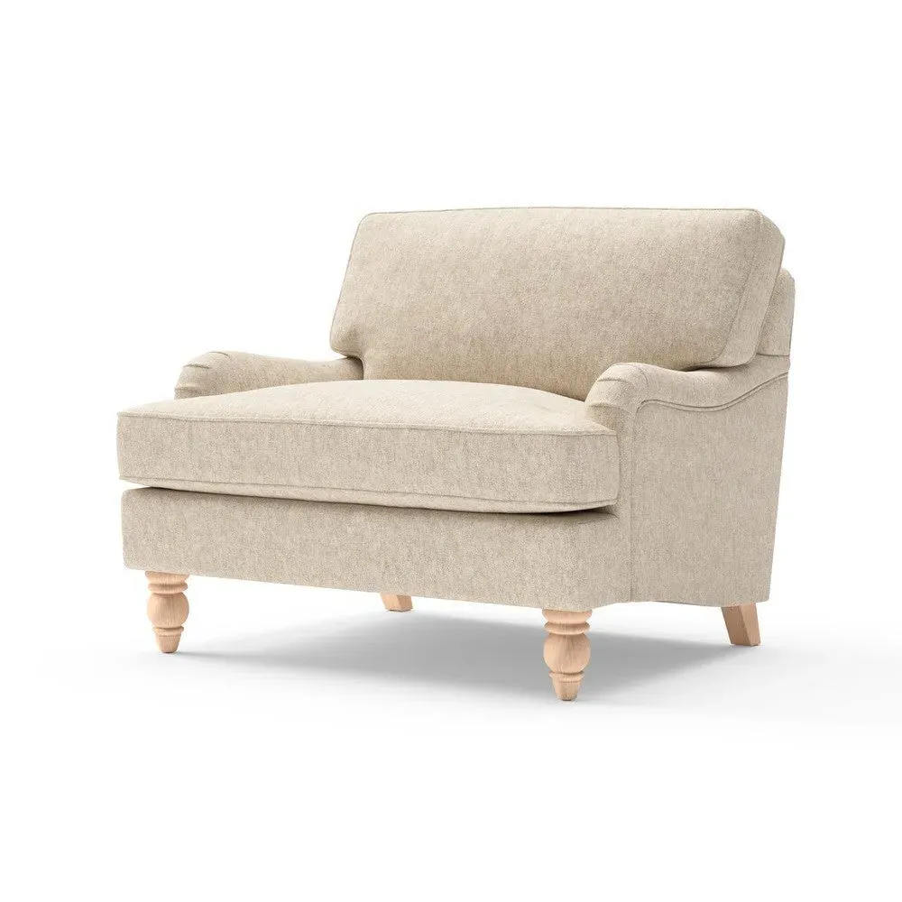 The Love Seat combines sink-in comfort with low arms designed for relaxed lounging. Its traditional English-inspired styling features natural House Weave fabric, while the construction offers both feather and low maintenance interior options. The design complements other pieces in the collection for coordinated room styling.