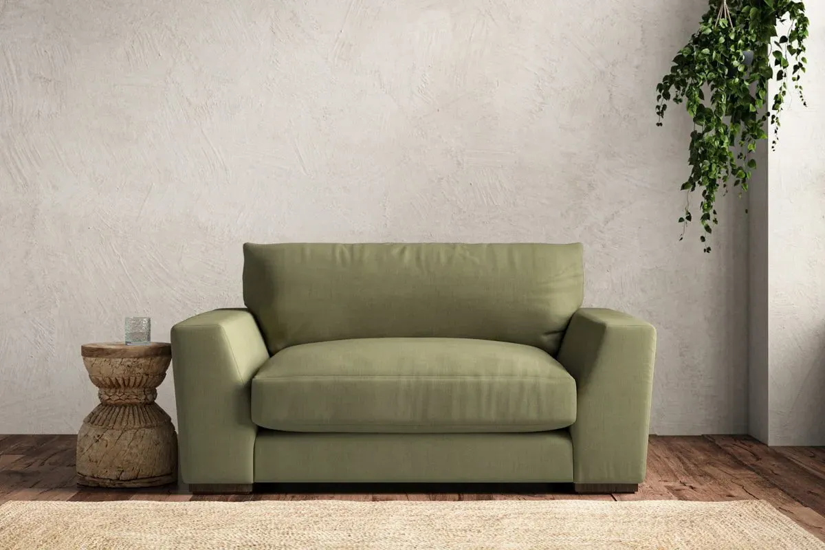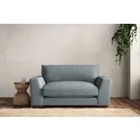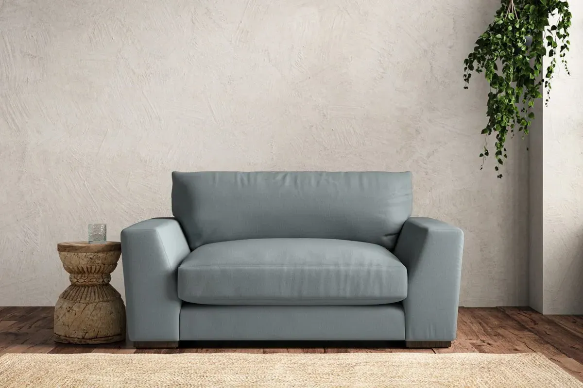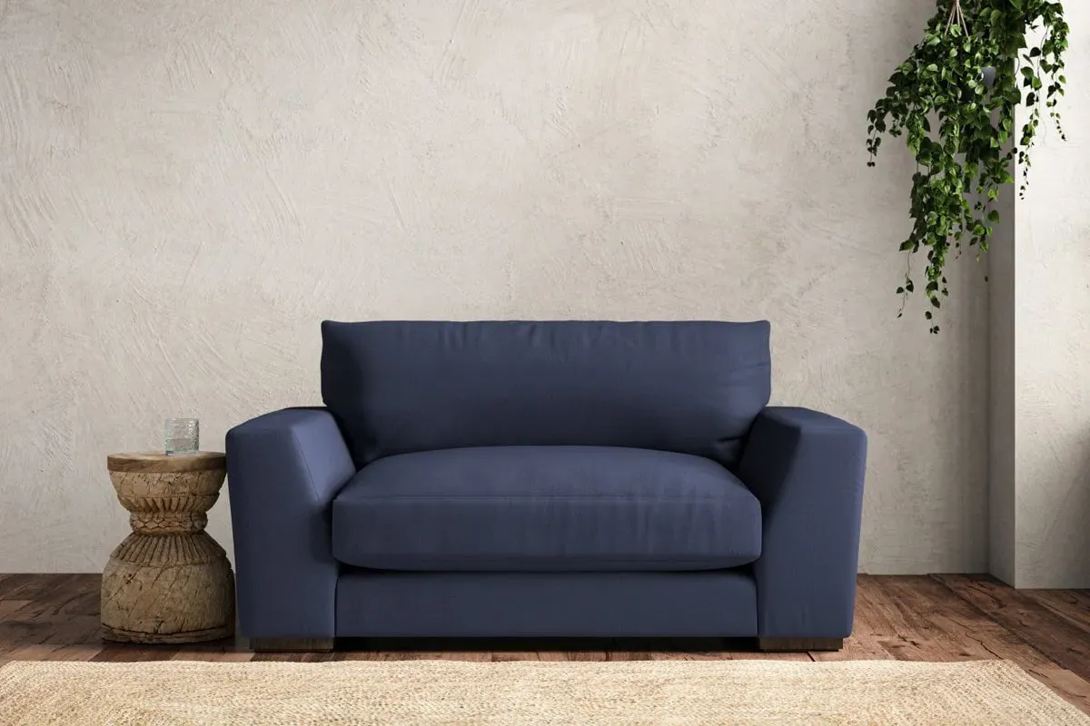 The Guddu Love Seat offers comfortable seating with its compact two-person design, upholstered in sustainable recycled cotton fabric. The airforce colorway provides a sophisticated blue-grey tone, while the tailored construction ensures lasting durability. This made-to-order piece features quality craftsmanship with attention to detail in every stitch.