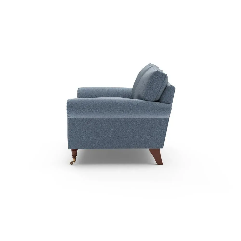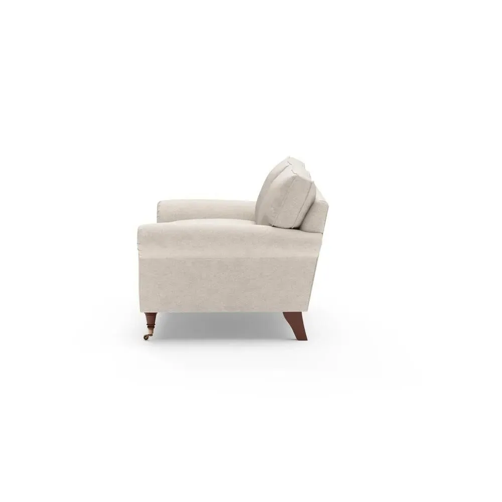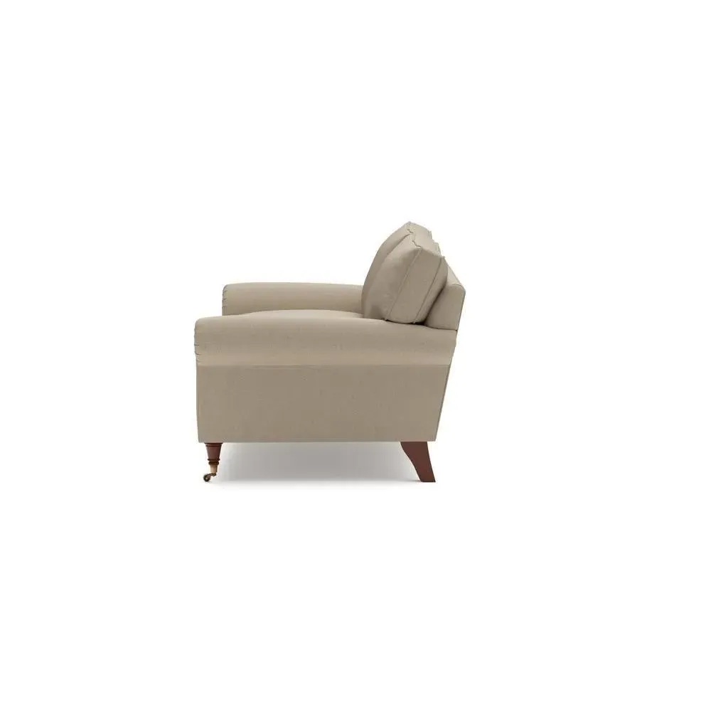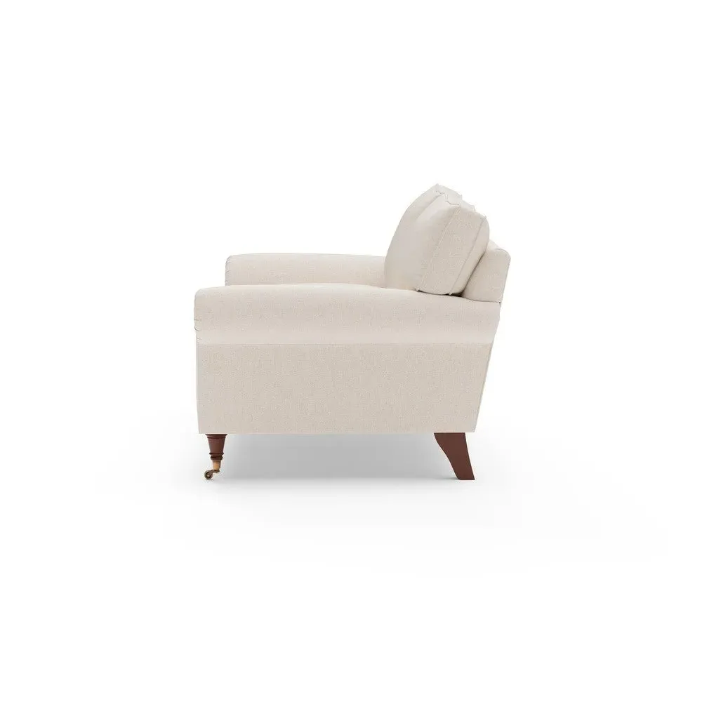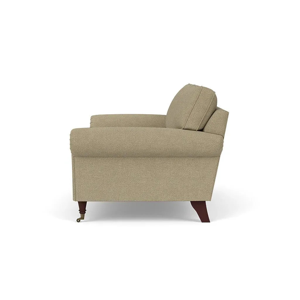 The sofa combines comfort with pleated detailing and classic castor feet. Its open arms provide easy resting space, while the house weave upholstery adds texture and durability. Available in luxurious feather or low maintenance interior options to suit different preferences.
