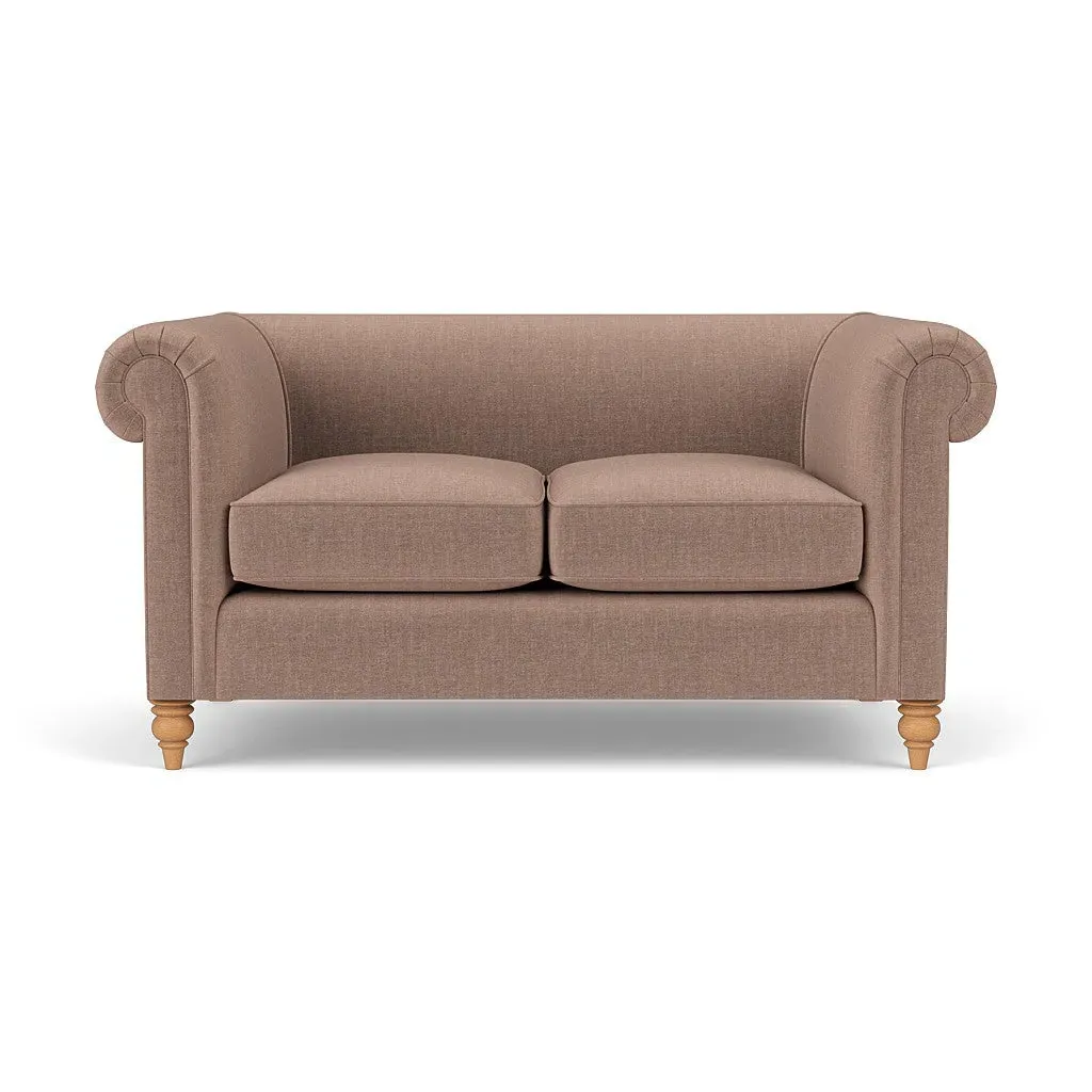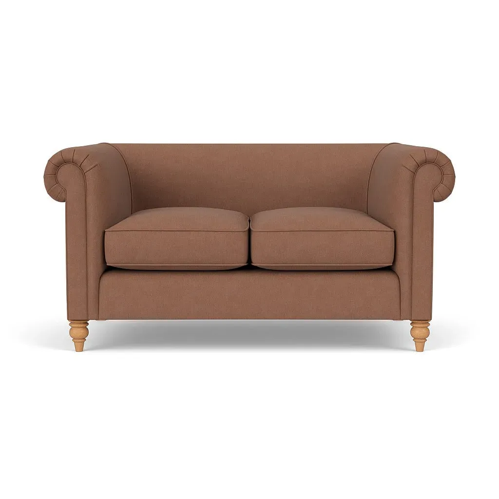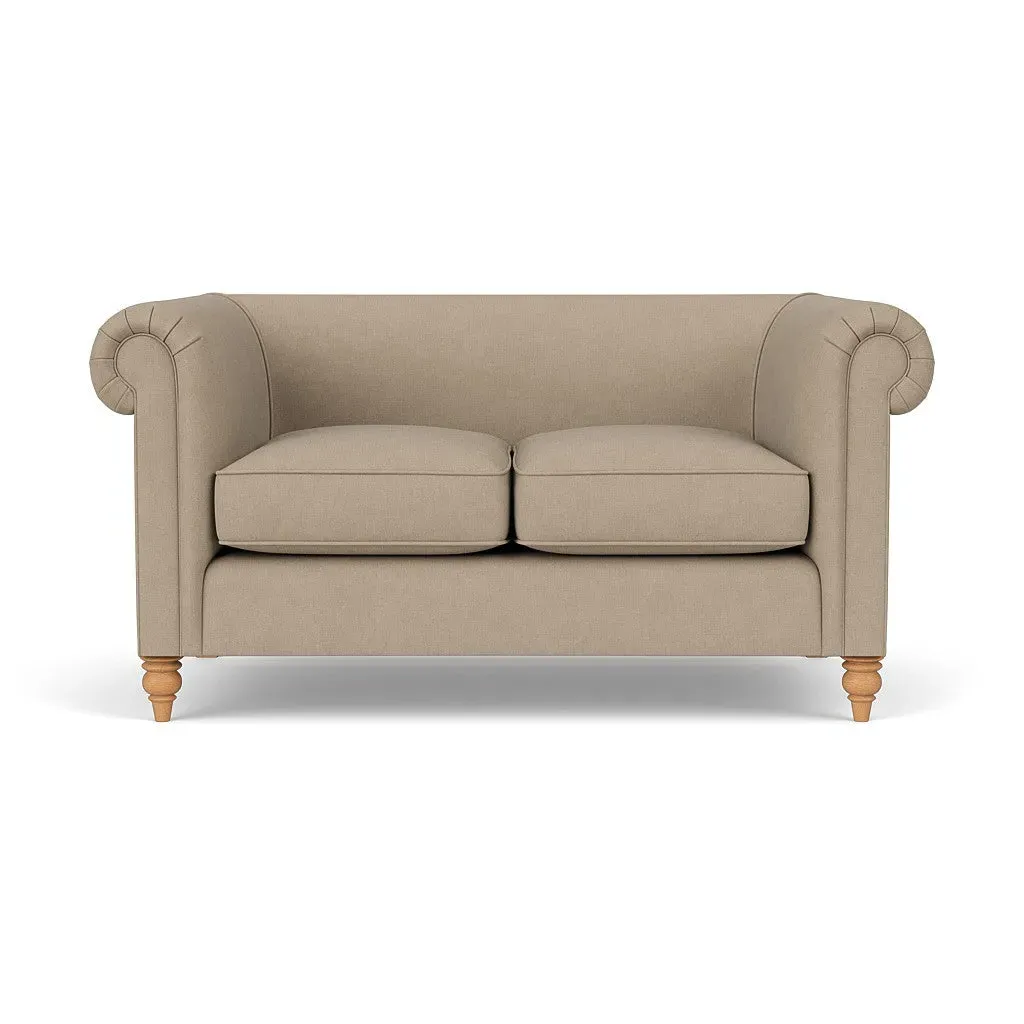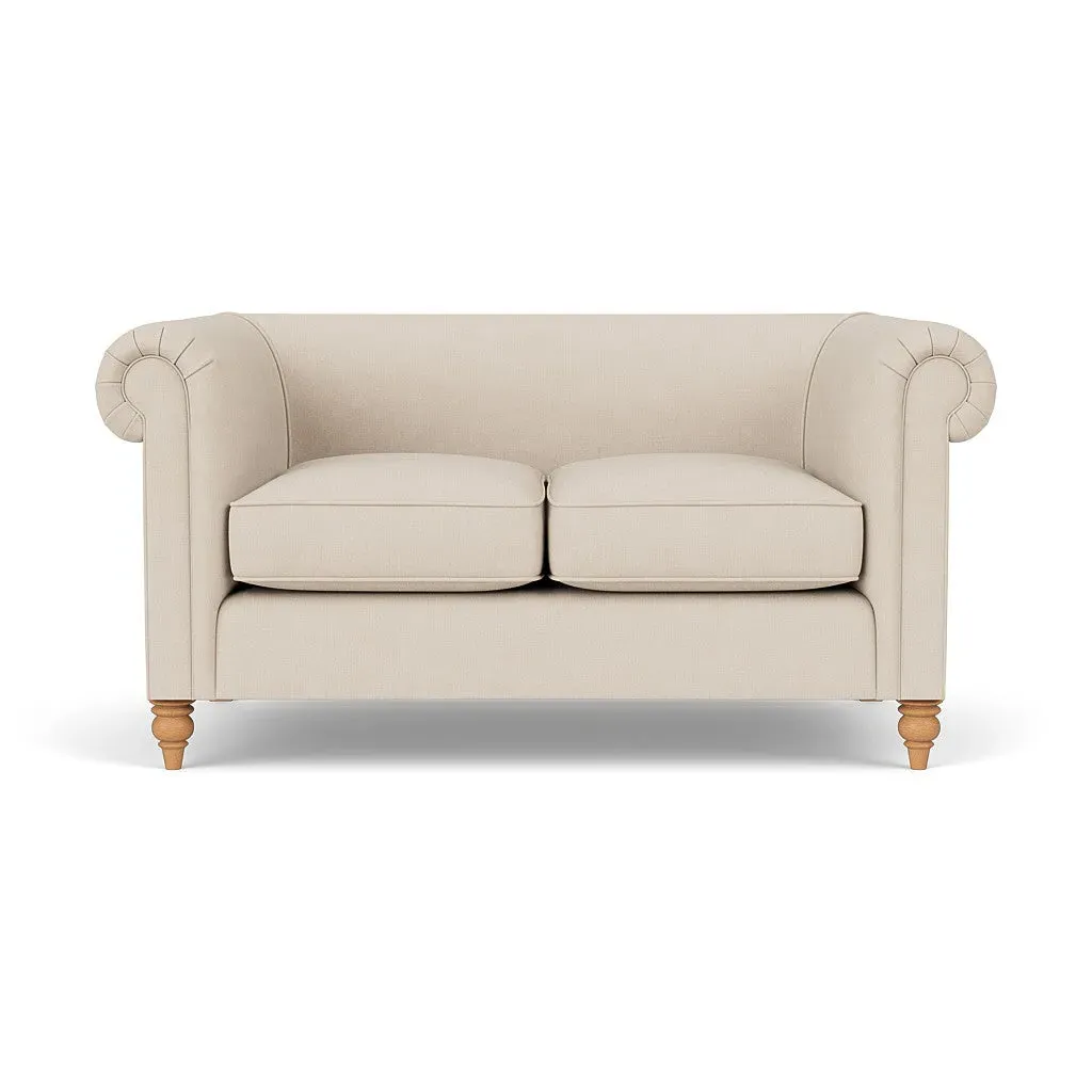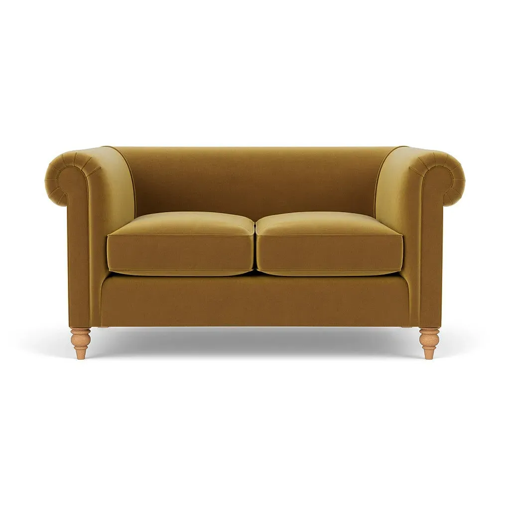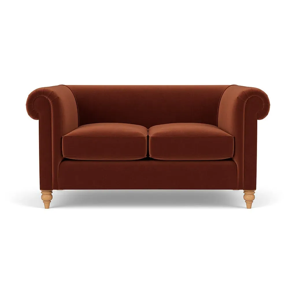 The 2-seater sofa offers Chesterfield-inspired comfort with its low back and gently scrolled arms. Piping along the seat cushions and arms provides a tailored finish, while the beautifully turned feet add character. The deep, sink-in design suits relaxed seating, and the choice of feather or fibre fillings ensures personalized comfort.