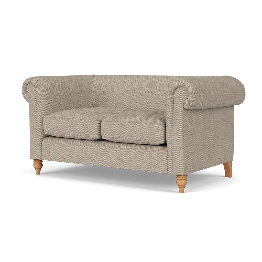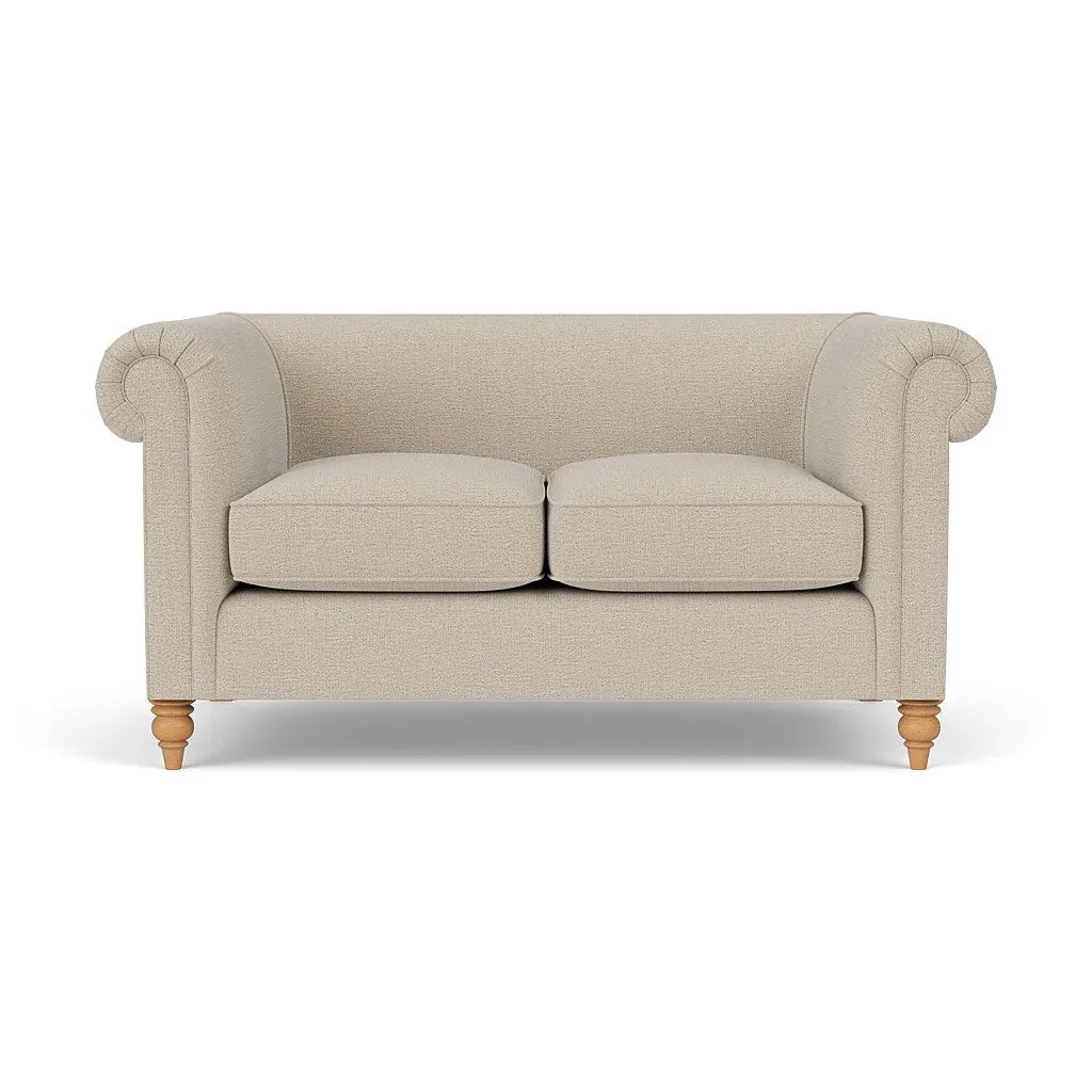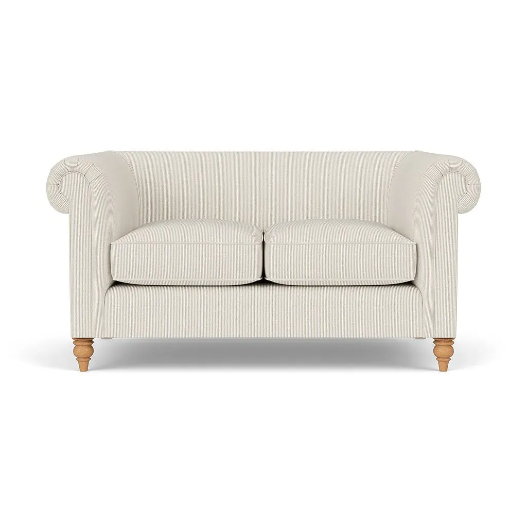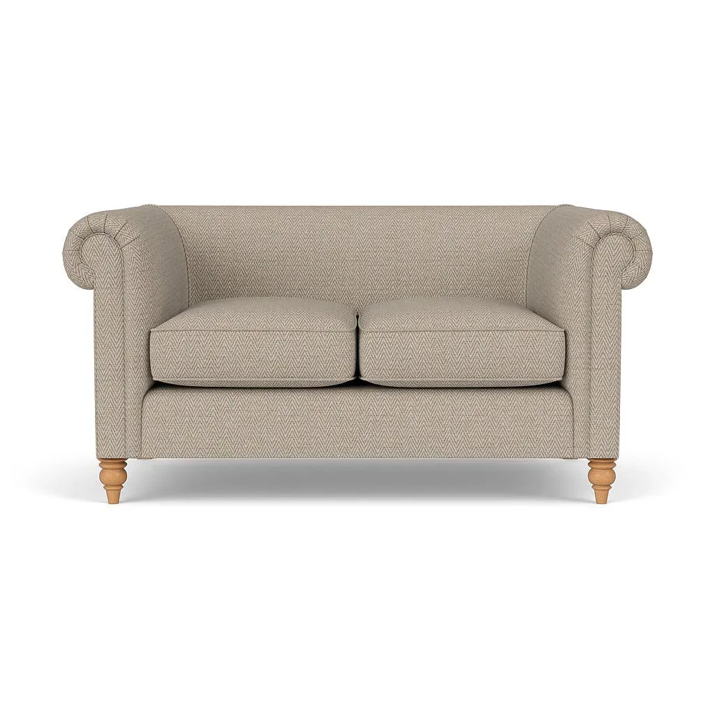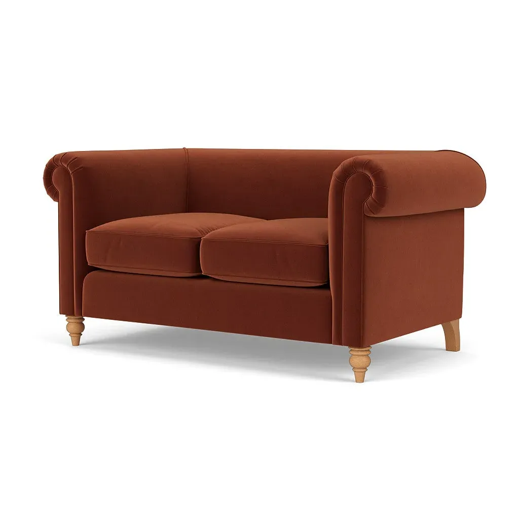 The 2-seater sofa offers Chesterfield-inspired comfort with its low back and gently scrolled arms. Piping along the seat cushions and arms provides a tailored finish, while the beautifully turned feet add character. The deep, sink-in design suits relaxed seating, and the choice of feather or fibre fillings ensures personalized comfort.