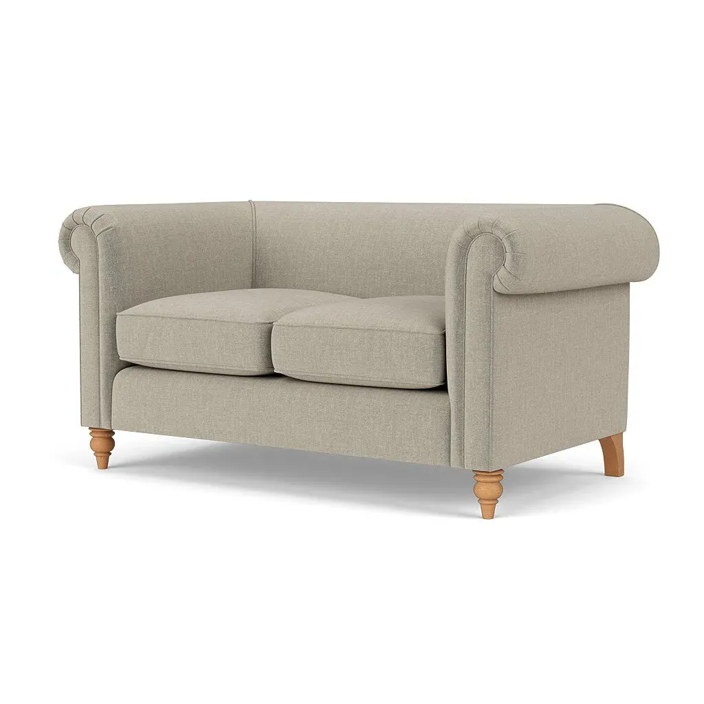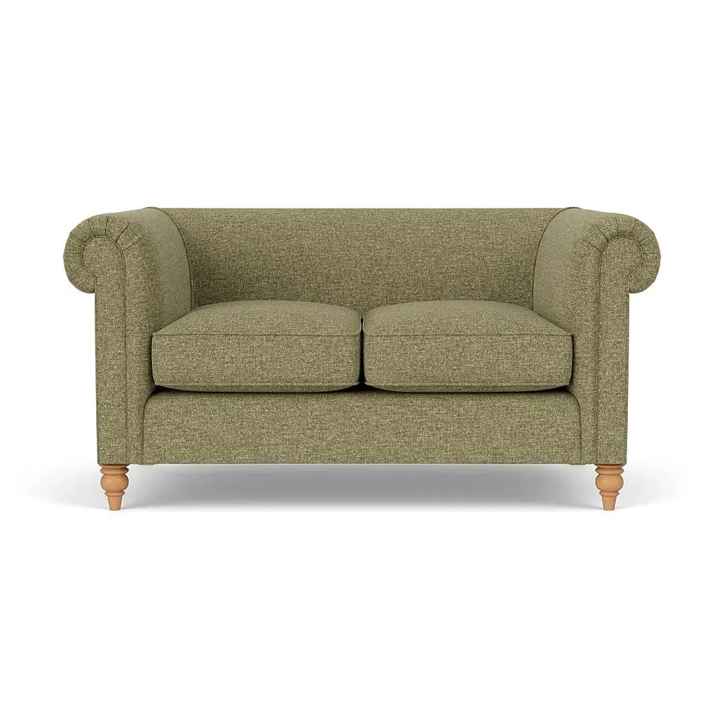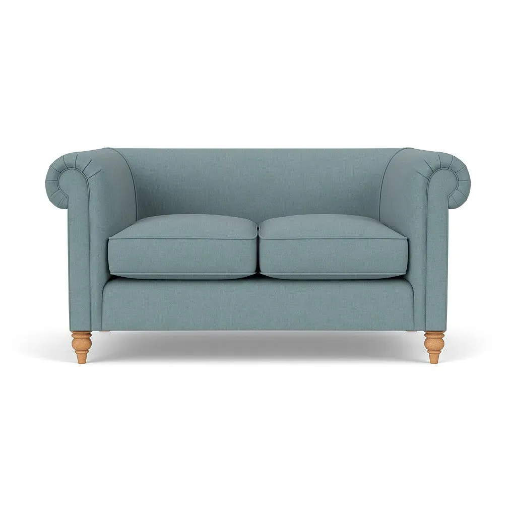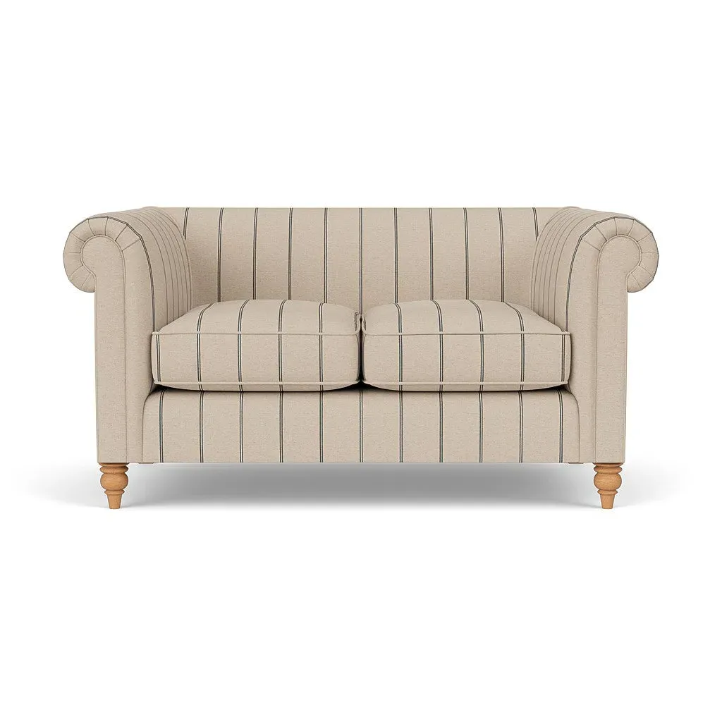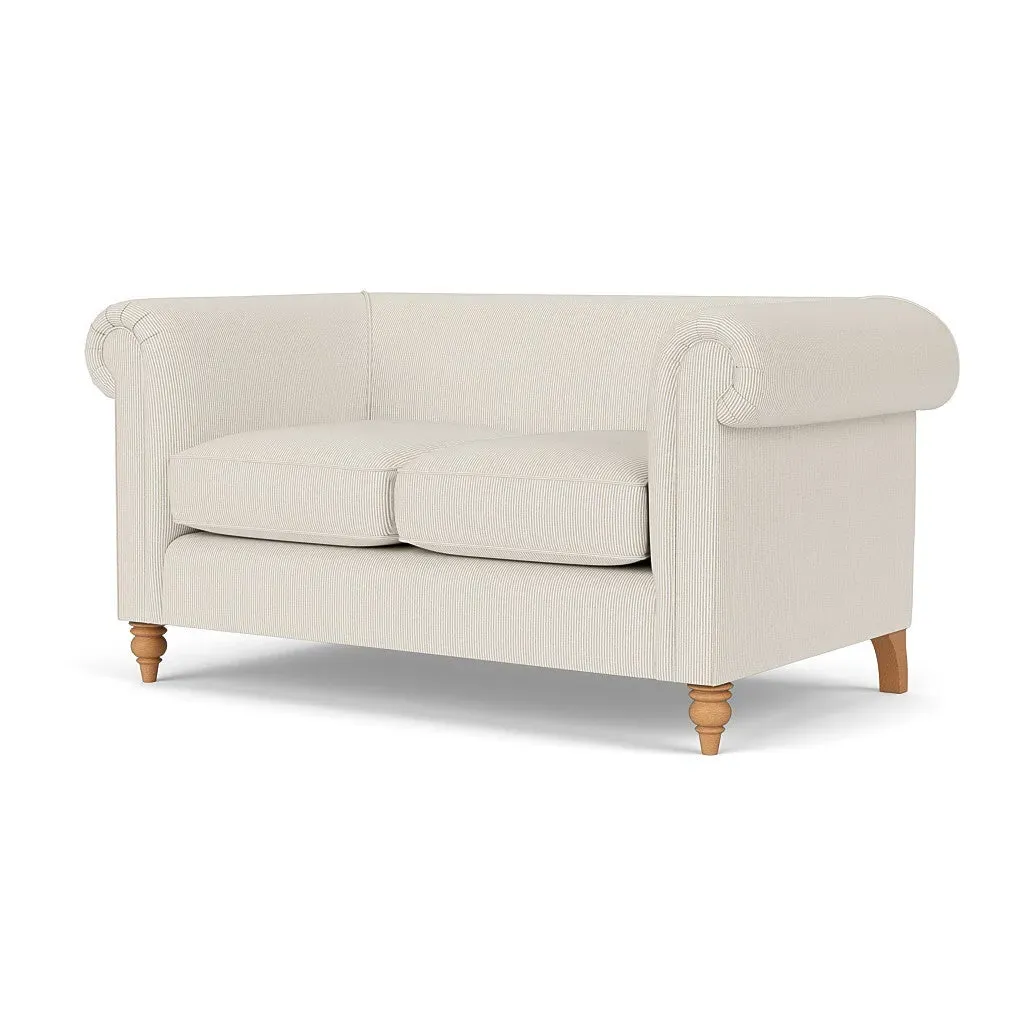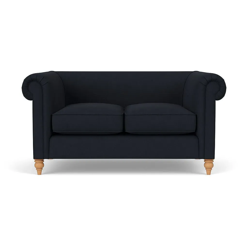 The 2-seater sofa offers Chesterfield-inspired comfort with its low back and gently scrolled arms. Piping along the seat cushions and arms provides a tailored finish, while the beautifully turned feet add character. The deep, sink-in design suits relaxed seating, and the choice of feather or fibre fillings ensures personalized comfort.