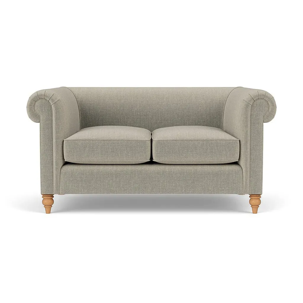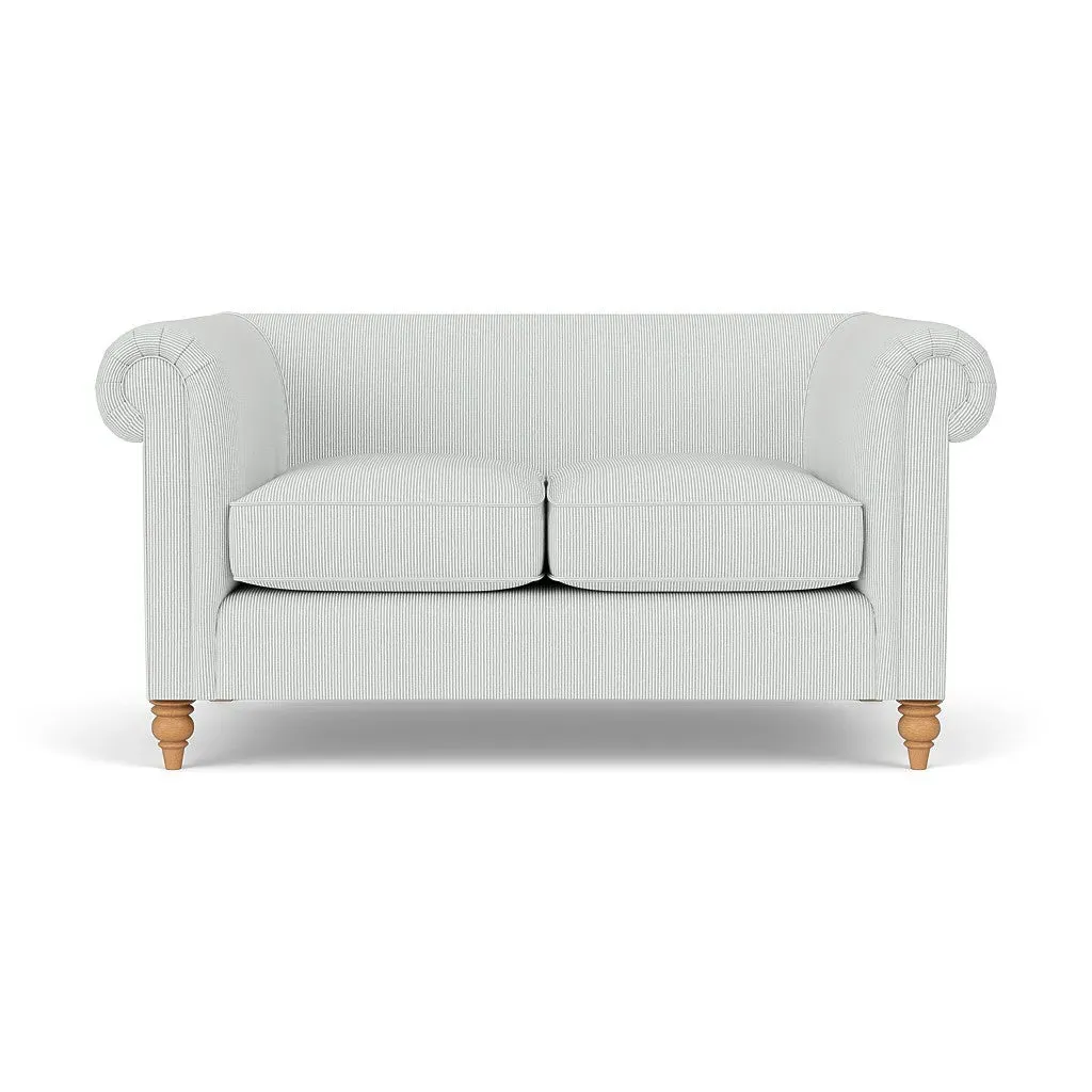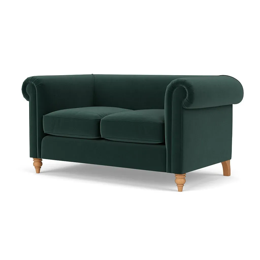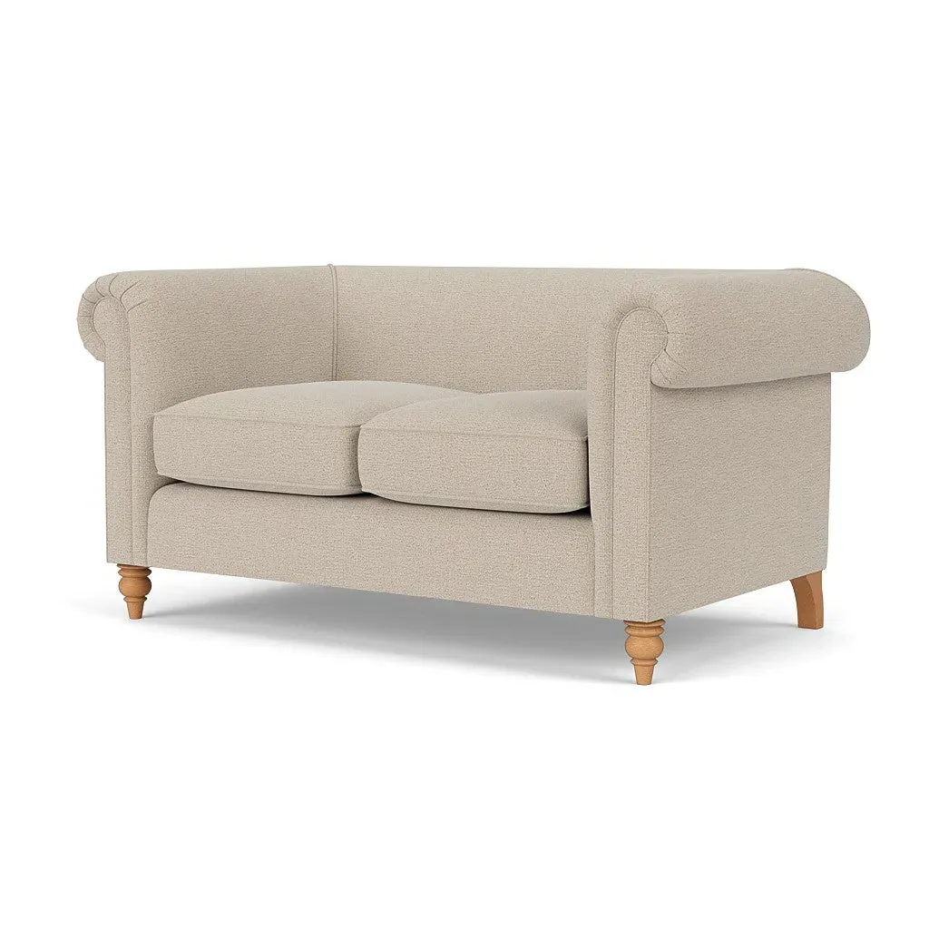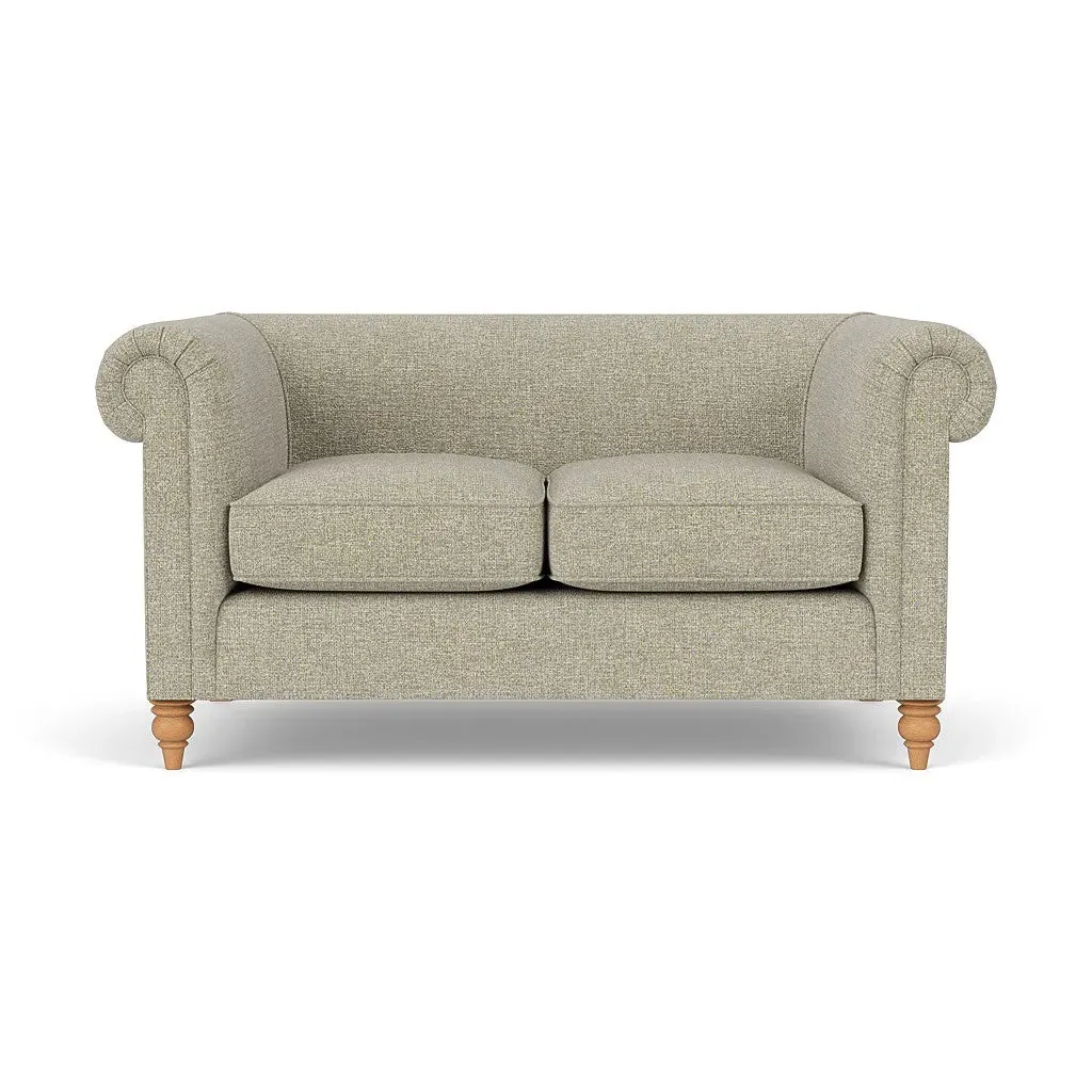 The 2-seater sofa offers Chesterfield-inspired comfort with its low back and gently scrolled arms. Piping along the seat cushions and arms provides a tailored finish, while the beautifully turned feet add character. The deep, sink-in design suits relaxed seating, and the choice of feather or fibre fillings ensures personalized comfort.