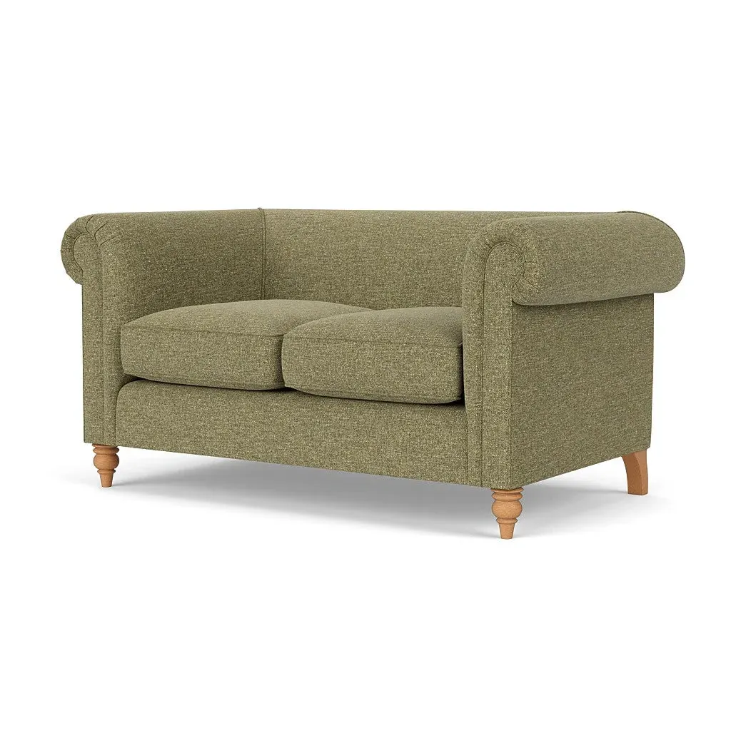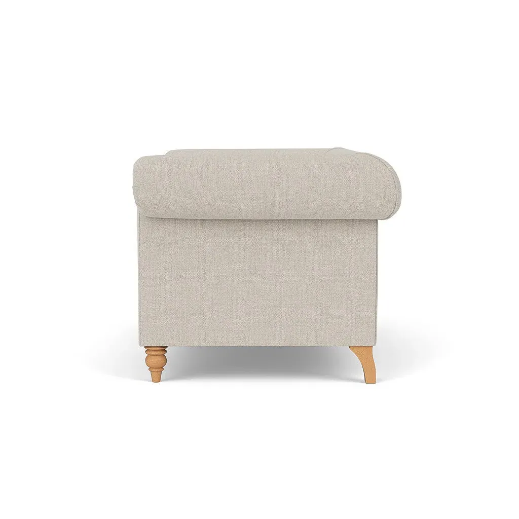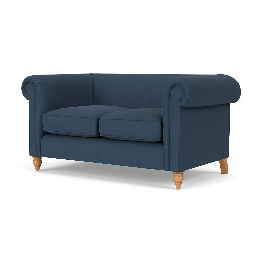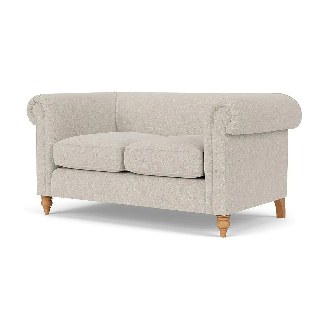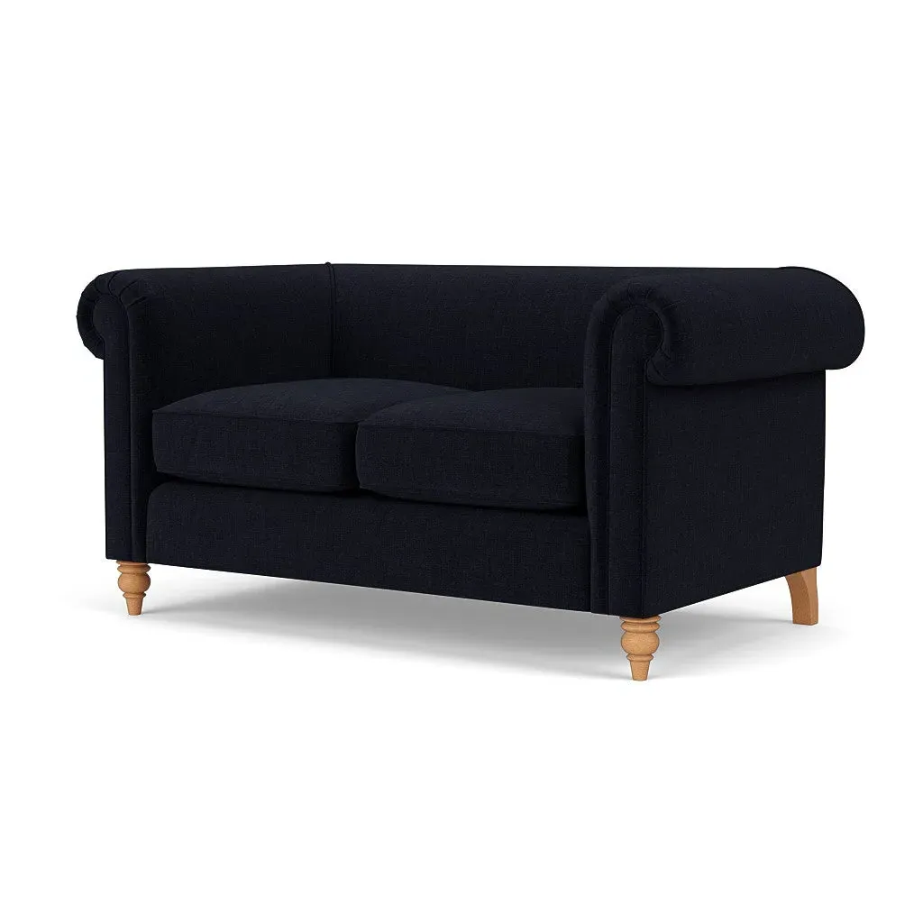 The 2-seater sofa offers Chesterfield-inspired comfort with its low back and gently scrolled arms. Piping along the seat cushions and arms provides a tailored finish, while the beautifully turned feet add character. The deep, sink-in design suits relaxed seating, and the choice of feather or fibre fillings ensures personalized comfort.
