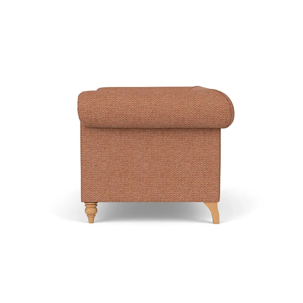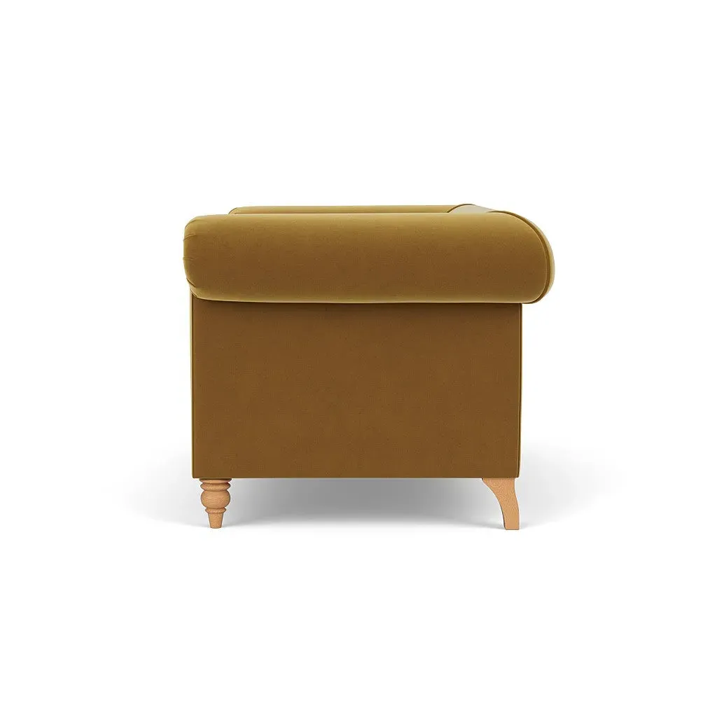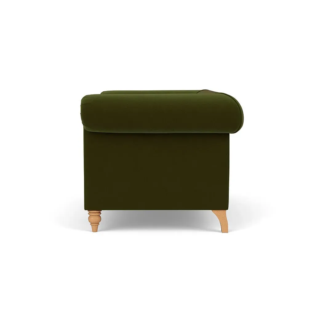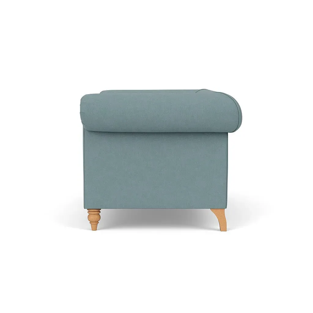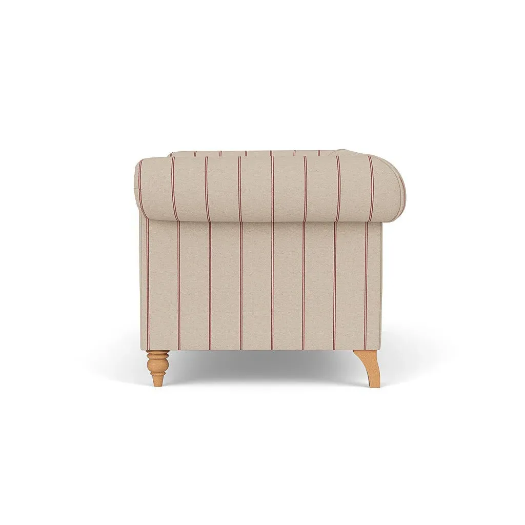 The 2-seater sofa offers Chesterfield-inspired comfort with its low back and gently scrolled arms. Piping along the seat cushions and arms provides a tailored finish, while the beautifully turned feet add character. The deep, sink-in design suits relaxed seating, and the choice of feather or fibre fillings ensures personalized comfort.