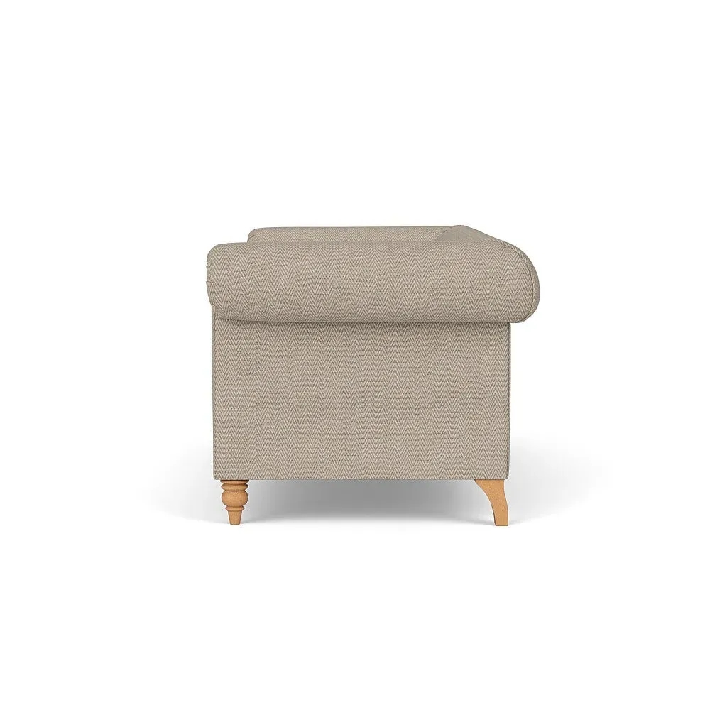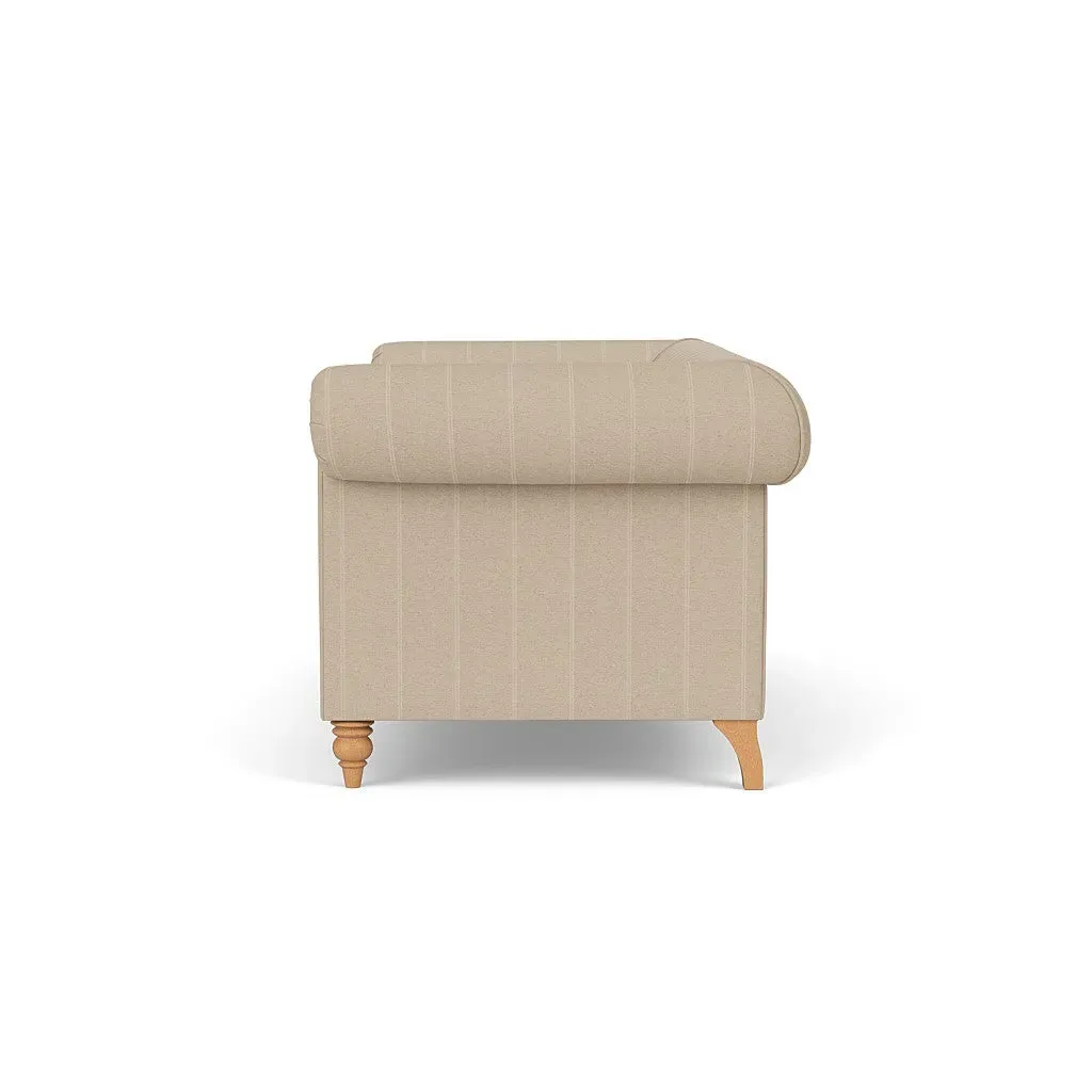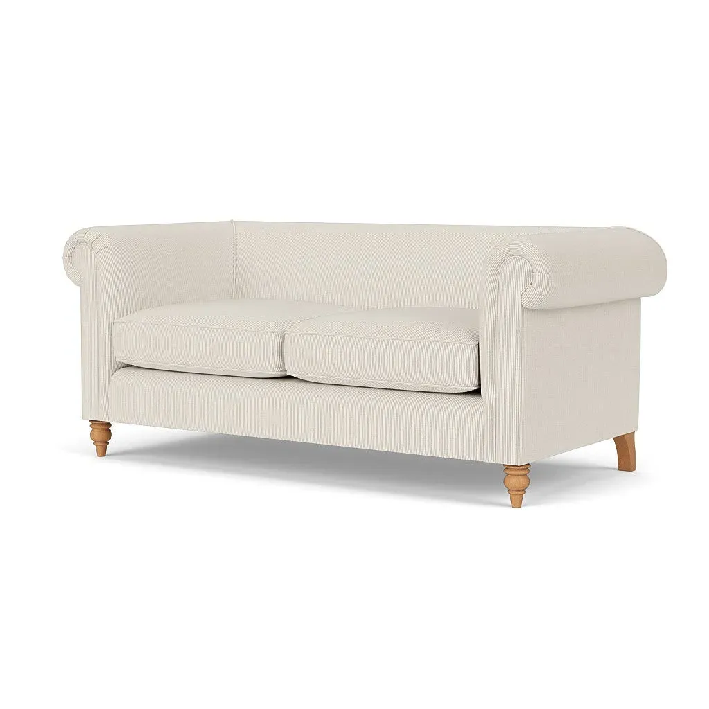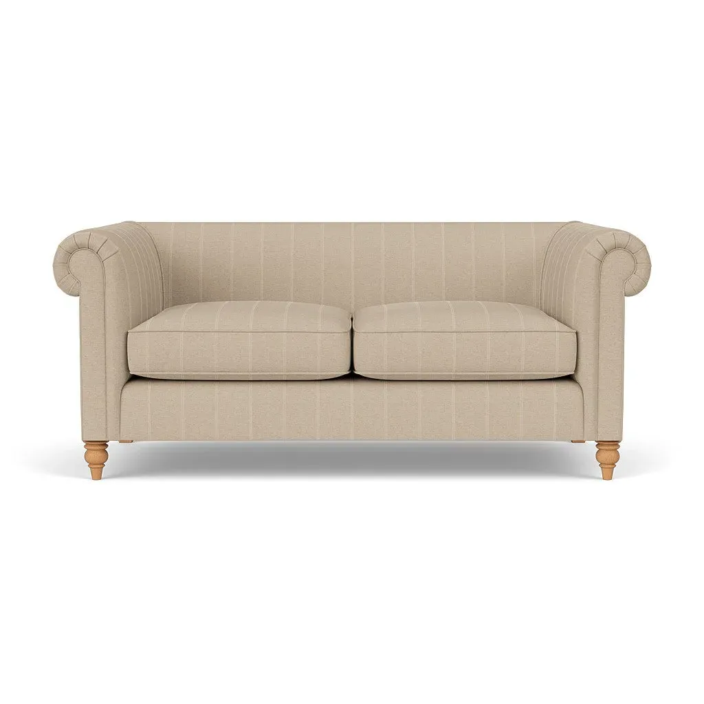 The sofa offers deep, sink-in comfort with its low back and gently scrolled arms, inspired by Chesterfield design. Piping along the seat cushions and arms provides a tailored finish, while the beautifully turned feet add timeless character. Available with a choice of seat fillings for your preferred comfort level, whether cocooning feather filled or supportive, low-maintenance fibre.