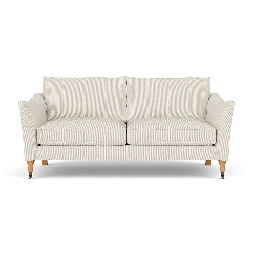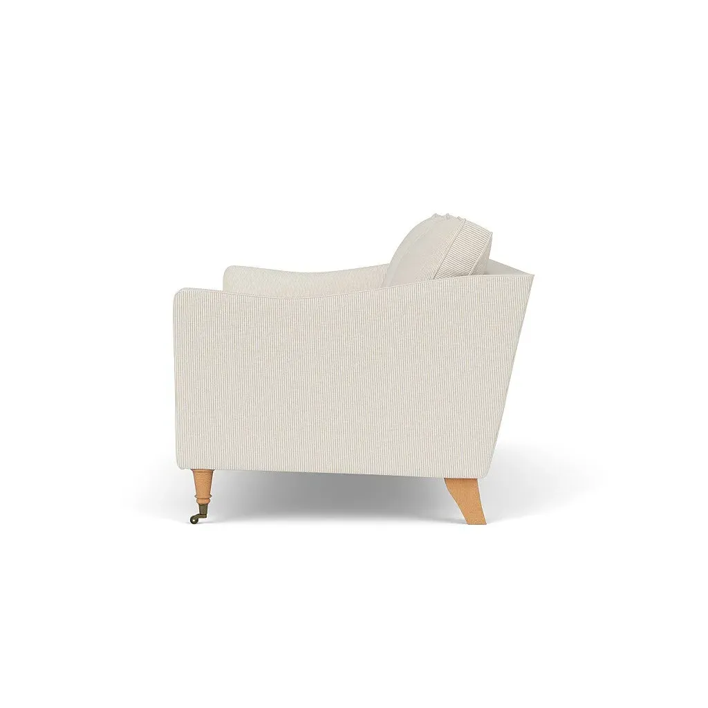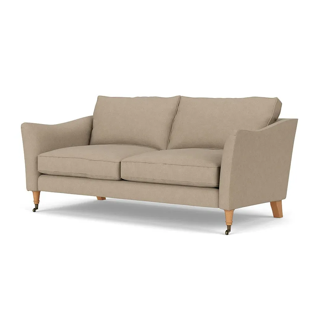 The 3-seater sofa offers balanced comfort with its high, sculpted arms and deep, generous seating area. Its cushions and arms feature piped edge detailing for a tailored appearance, while the castor legs provide both support and style flexibility. The construction allows choice of fillings, from feather-filled comfort to supportive, low-maintenance fibre options.
