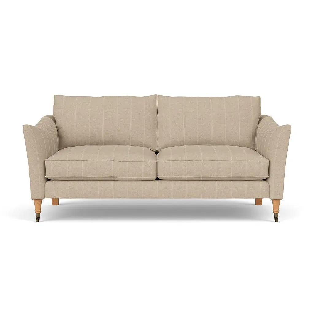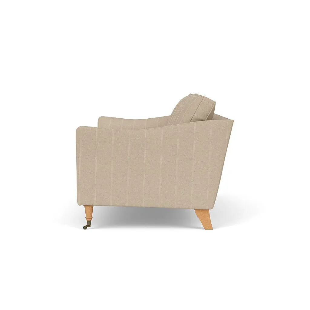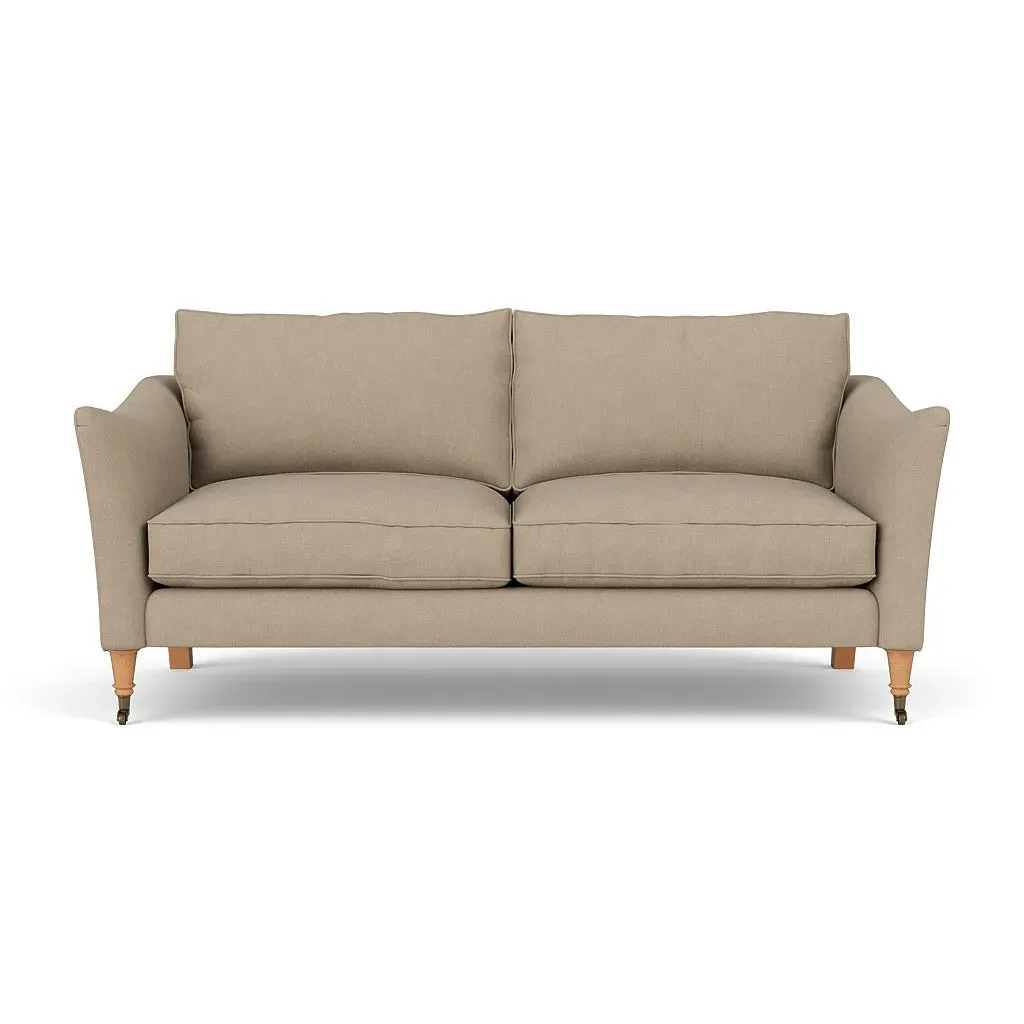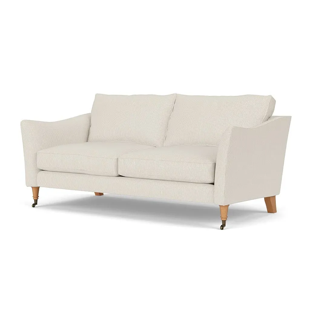 The 3-seater sofa offers balanced comfort with its high, sculpted arms and deep, generous seating area. Its cushions and arms feature piped edge detailing for a tailored appearance, while the castor legs provide both support and style flexibility. The construction allows choice of fillings, from feather-filled comfort to supportive, low-maintenance fibre options.