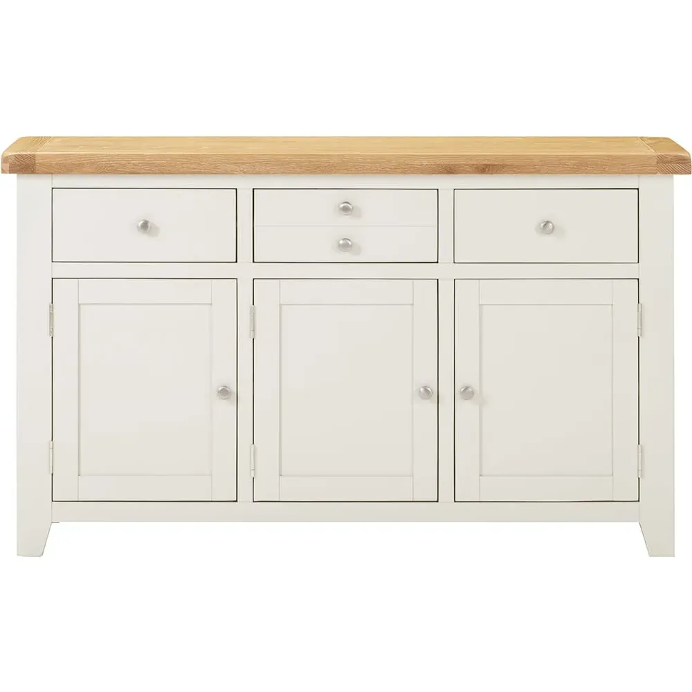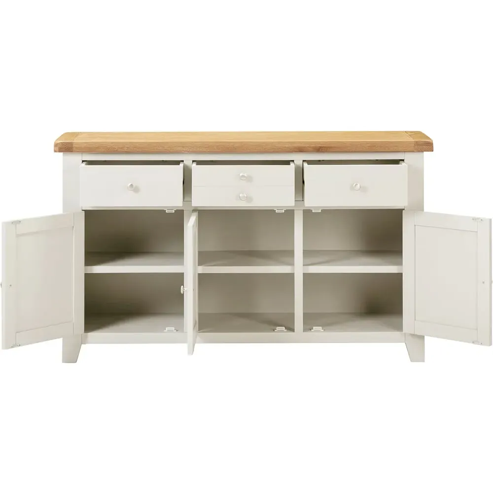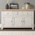 The Windsor sideboard combines practical storage with its two doors and two drawers, featuring a solid oak top paired with an ivory finish. Its soft-close drawers provide smooth operation, while the sturdy metal handles add durability. The two cupboards offer ample storage space, and the compact design ensures versatility in placement.