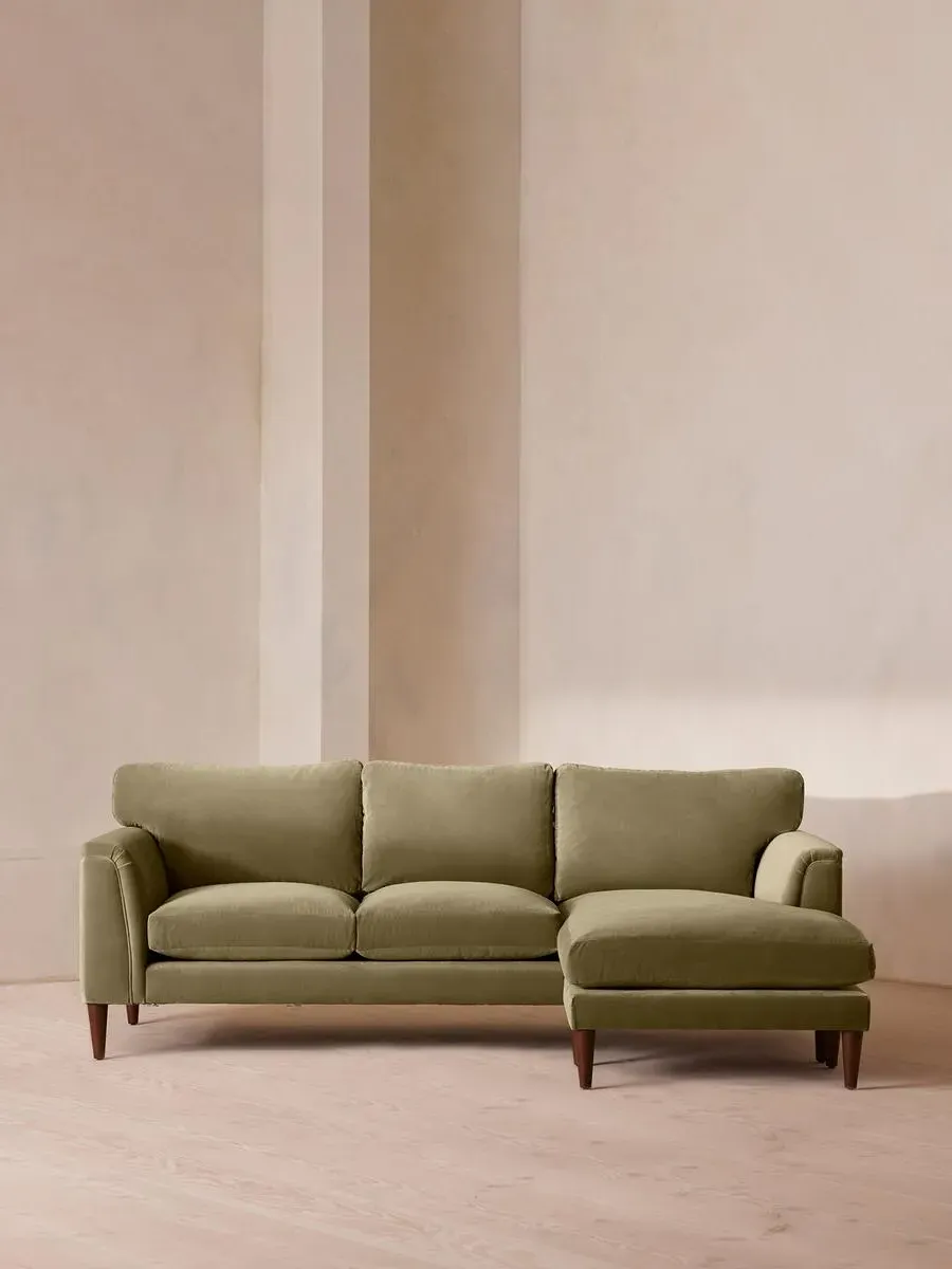 The chaise-end sofa combines deep seats with feather-wrapped cushions and rich velvet upholstery. Its plush construction provides luxurious comfort, while the turned walnut legs create visual space beneath. The deep seating design suits relaxed lounging with generous cushioning throughout.