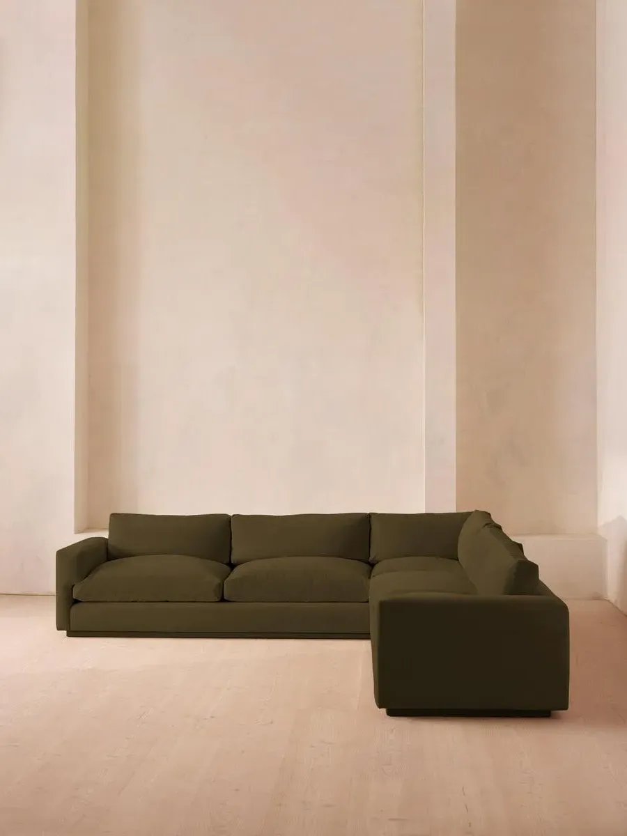 A corner style designed with deep, wide seats and velvet, feather-wrapped cushions built for comfort. With a silhouette that sits close to the floor and deep seats fitted with feather-wrapped cushions, the Mossley sofa is designed for comfort. Its laid-back aesthetic, inspired by the mood of Soho House Rome, is elevated by rich velvet upholstery that comes in our full made-to-order palette.