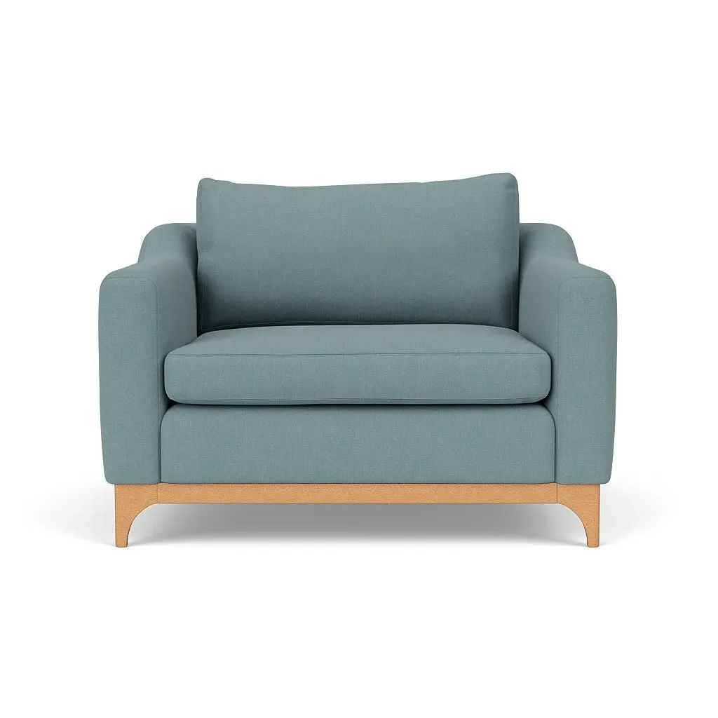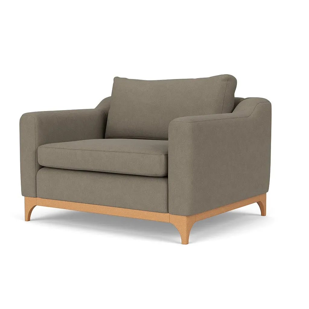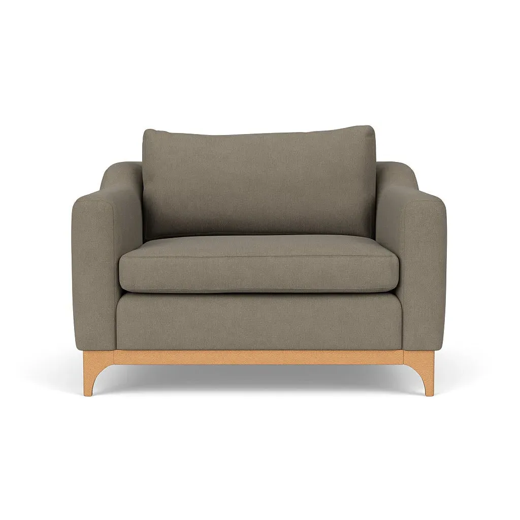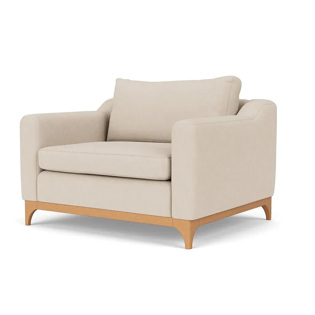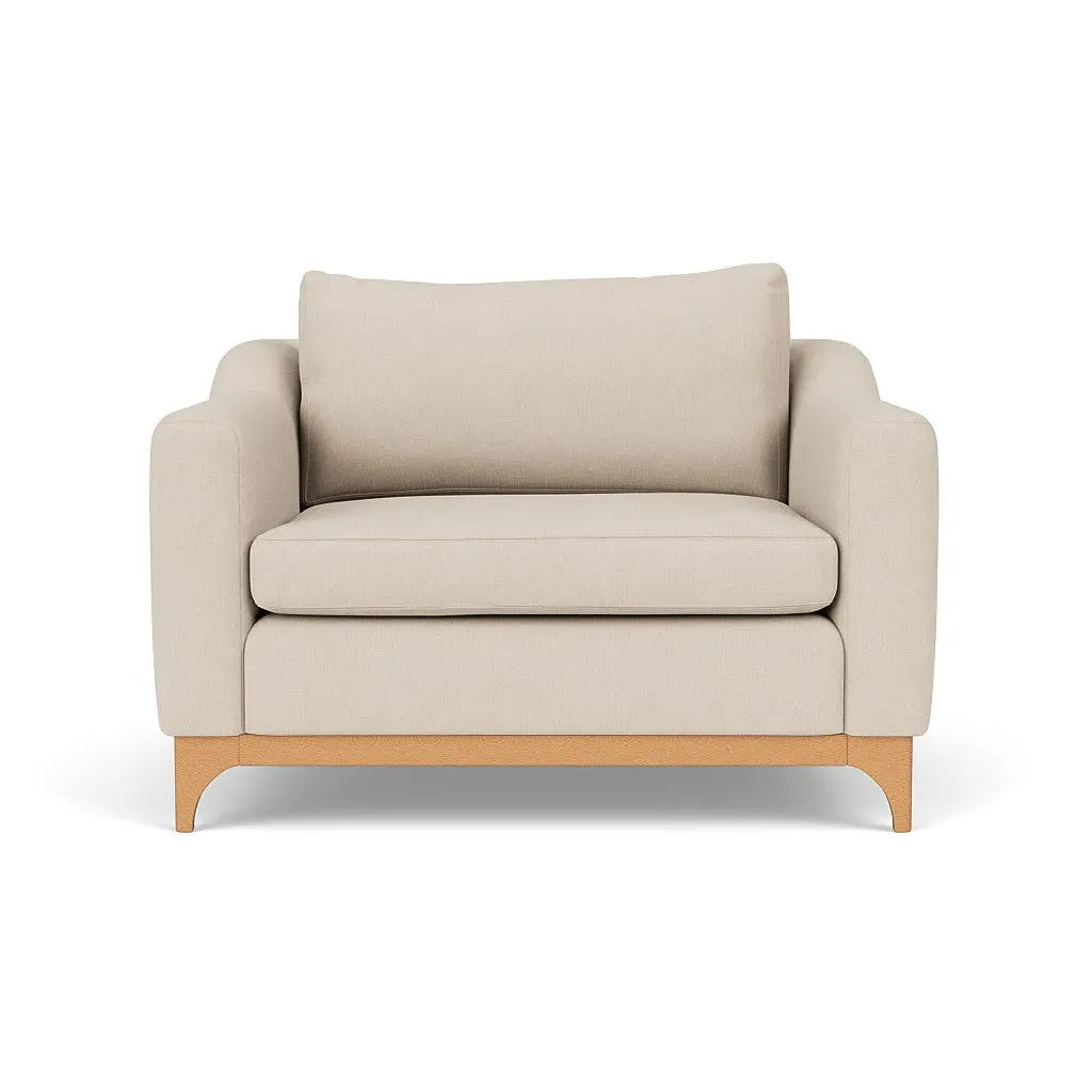 The love seat offers comfort with its deep seating and gently structured shape, set apart by its distinctive wooden base. Available in light, mid or dark wood finishes, the frame complements various décor styles while providing sturdy support. The house linen mix upholstery adds softness and durability, with a choice of feather or fibre fillings to suit your preferred comfort level.