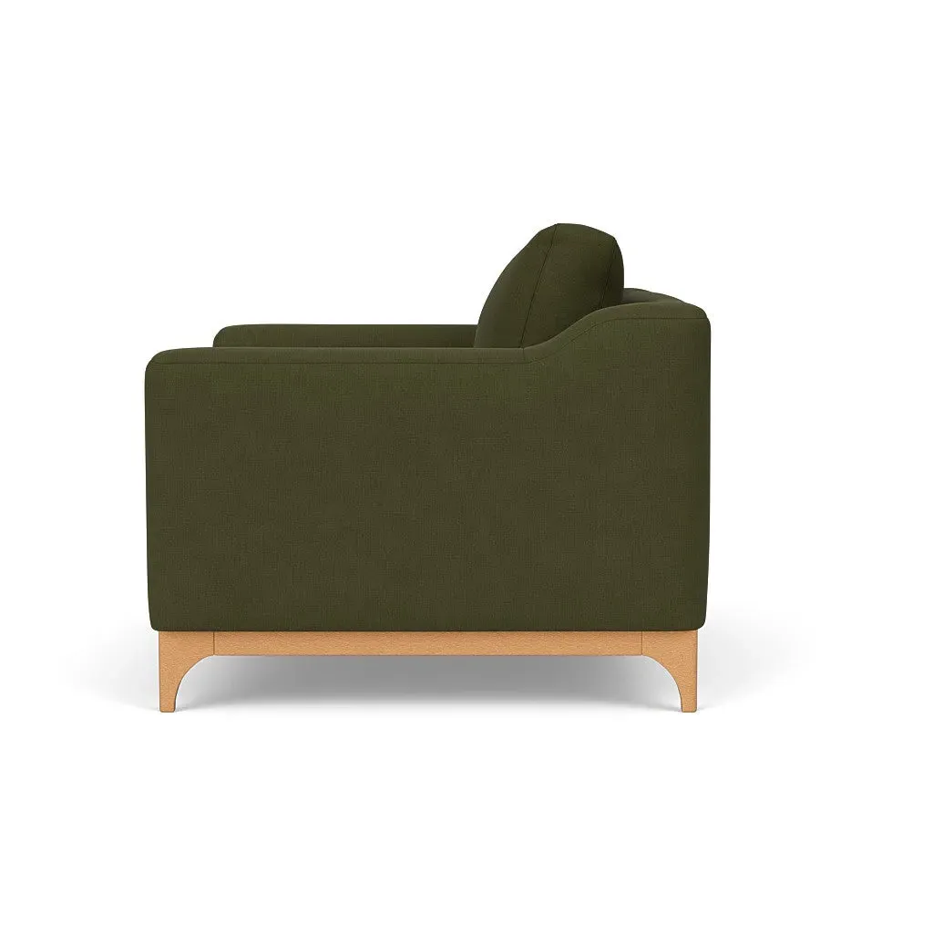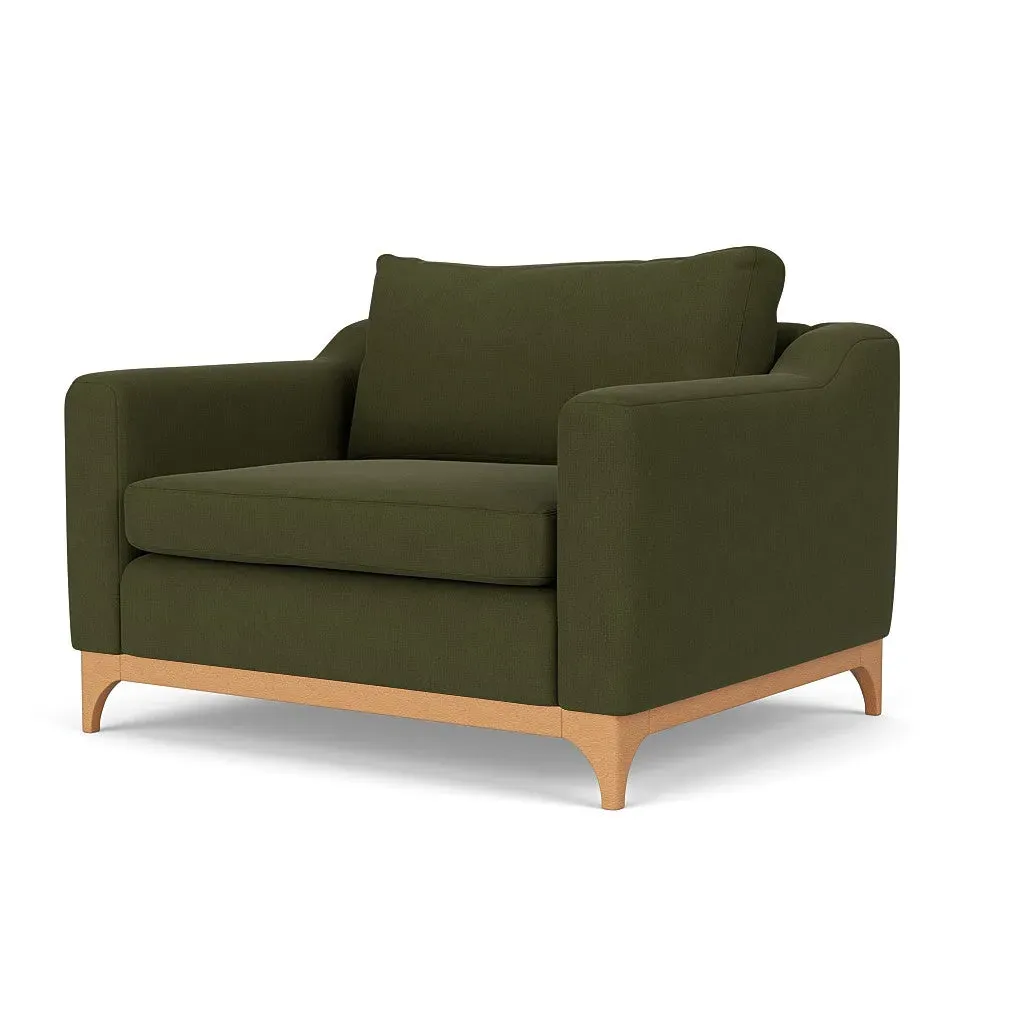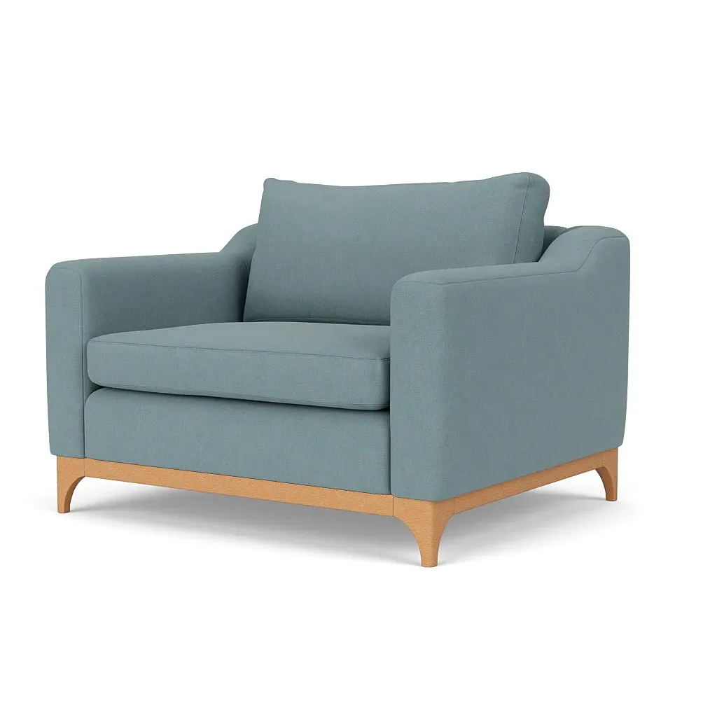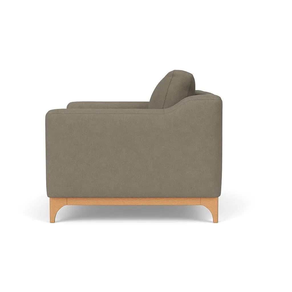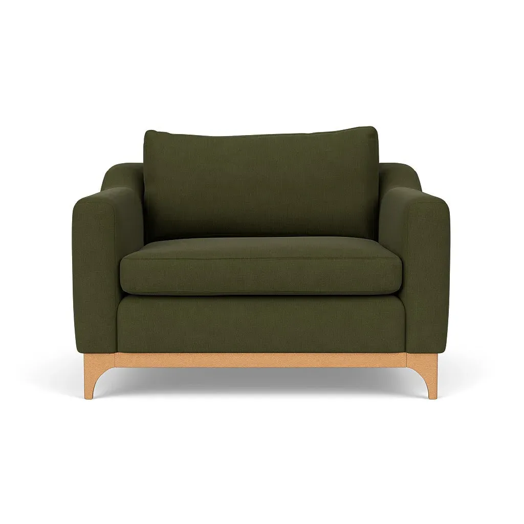 The love seat offers comfort with its deep seating and gently structured shape, set apart by its distinctive wooden base. Available in light, mid or dark wood finishes, the frame complements various décor styles while providing sturdy support. The house linen mix upholstery adds softness and durability, with a choice of feather or fibre fillings to suit your preferred comfort level.