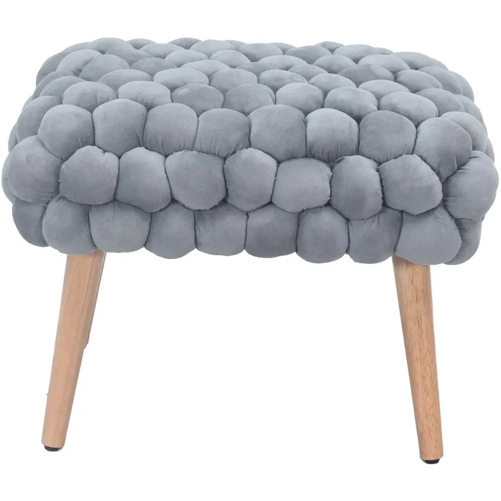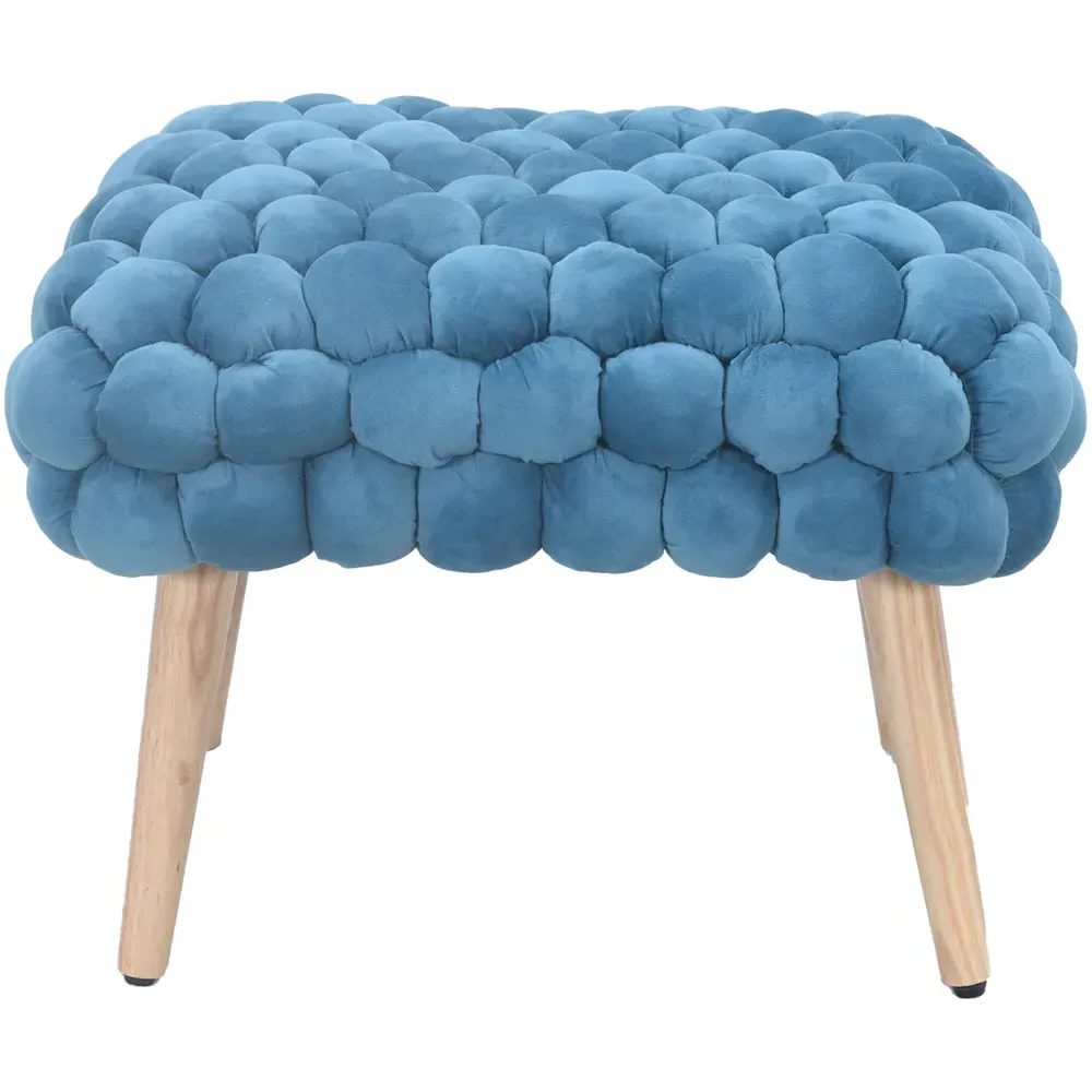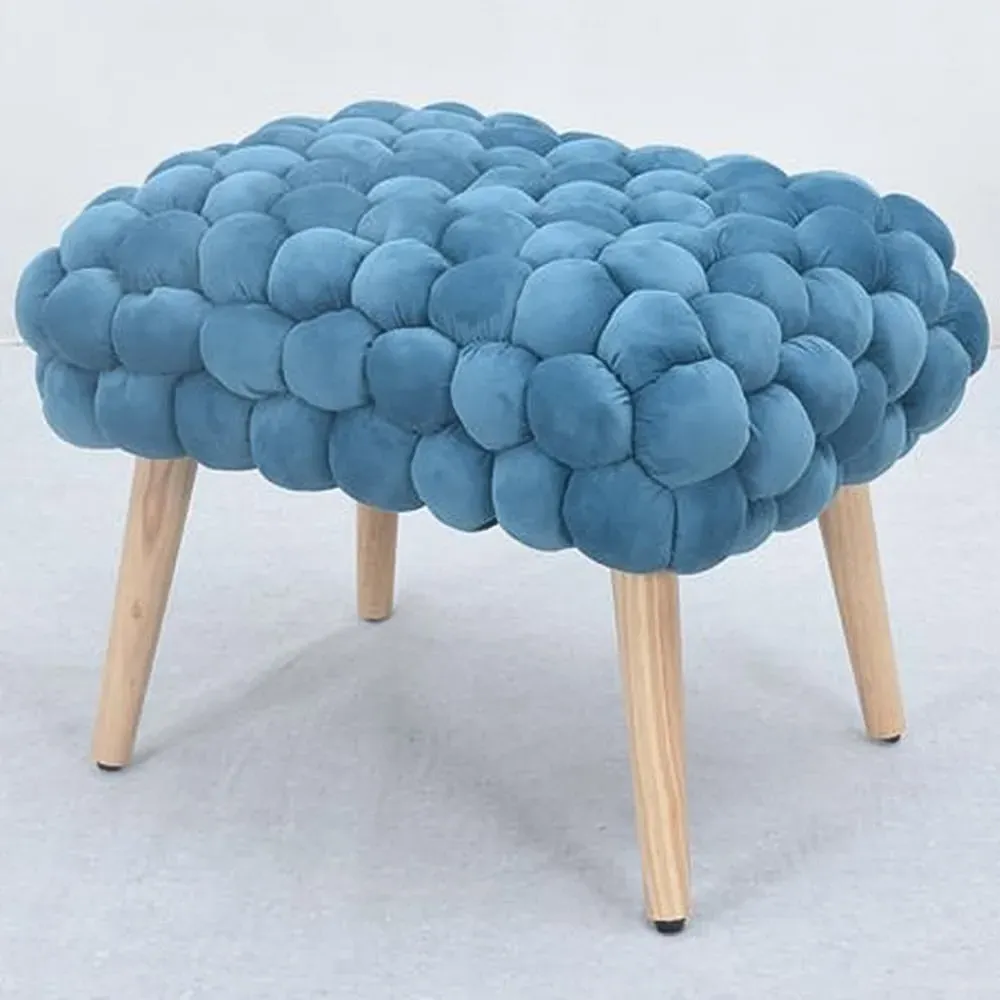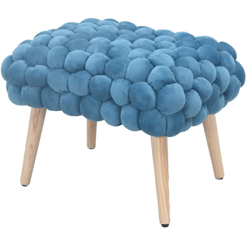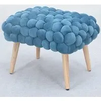 The Cushla footstool combines comfort with distinctive texture through its soft velvet upholstery and hand-finished bobble detailing. The light wooden legs provide stable support while adding Scandinavian-inspired charm to the design. Its compact size makes it versatile for use as a footrest or additional seating, and the plush velvet surface offers both comfort and visual appeal.