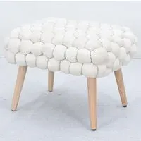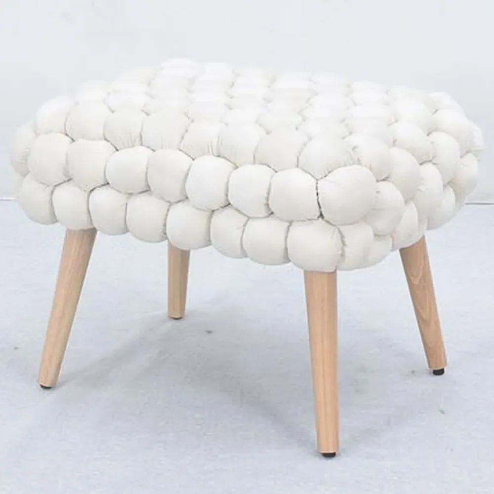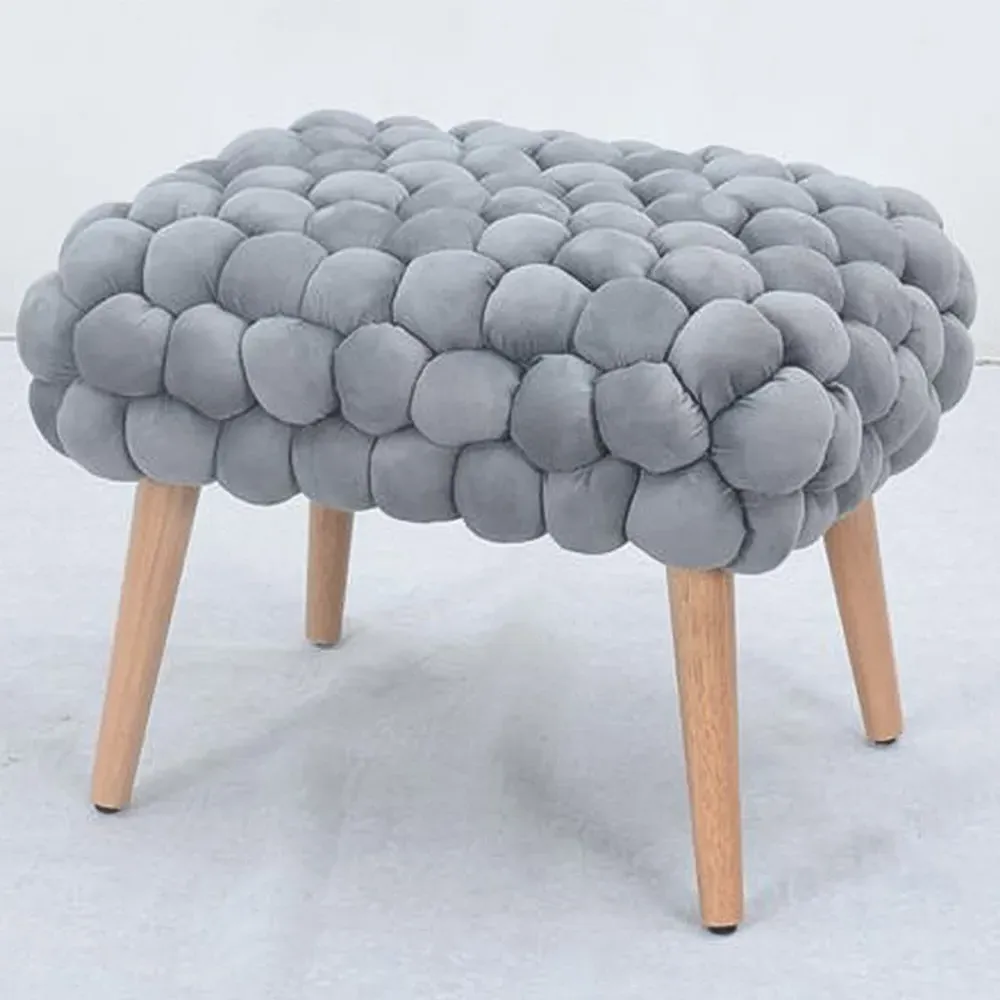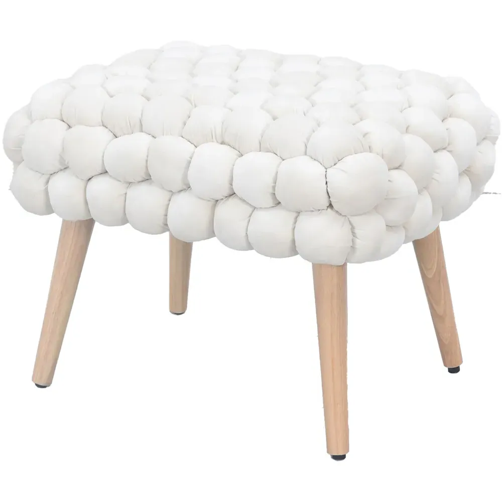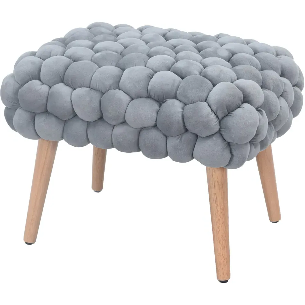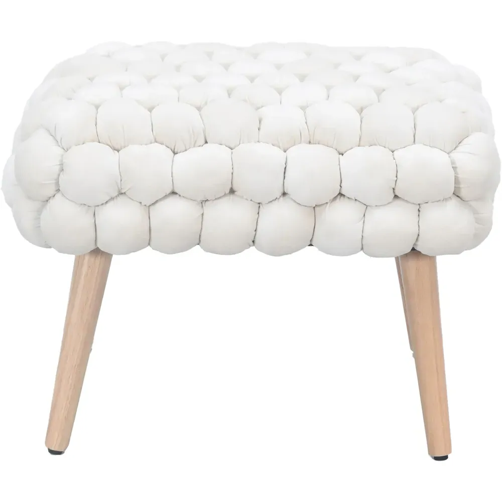 The Cushla footstool combines comfort with distinctive texture through its soft velvet upholstery and hand-finished bobble detailing. The light wooden legs provide stable support while adding Scandinavian-inspired charm to the design. Its compact size makes it versatile for use as a footrest or additional seating, and the plush velvet surface offers both comfort and visual appeal.