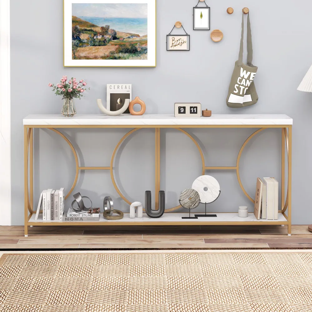 The console table offers sophistication with its faux marble tabletop, supported by a geometric gold metal frame. Its sturdy construction provides ample display space for books and ornaments, while the anti-toppling device ensures safety and durability. The table suits various placements from living rooms to entryways. W110 x D30 cm.