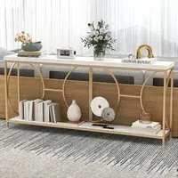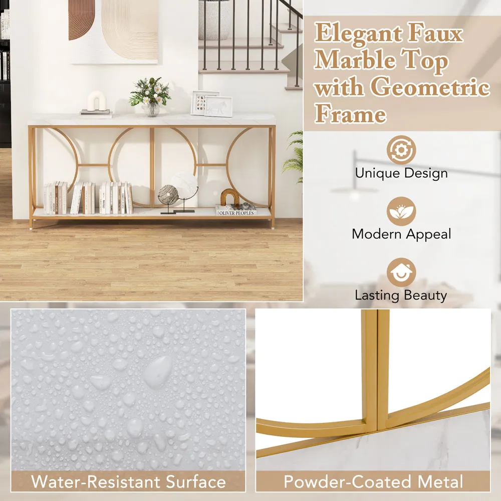 Elevate your home decor with the Costway Gold and White Faux Marble Console Table. This elegant table features a faux marble tabletop that radiates sophistication and a geometric gold metal frame that adds a contemporary touch. This elegant piece is not only a visual delight but also offers practical functionality with ample space for displaying and storing everything from books to ornaments. The sturdy construction is enhanced with an anti-toppling device, ensuring both safety and durability. Whether placed in your living room or entryway, this console table is designed to impress and last, making it a smart choice for any modern home. Dimensions: 110 x 30cm.
