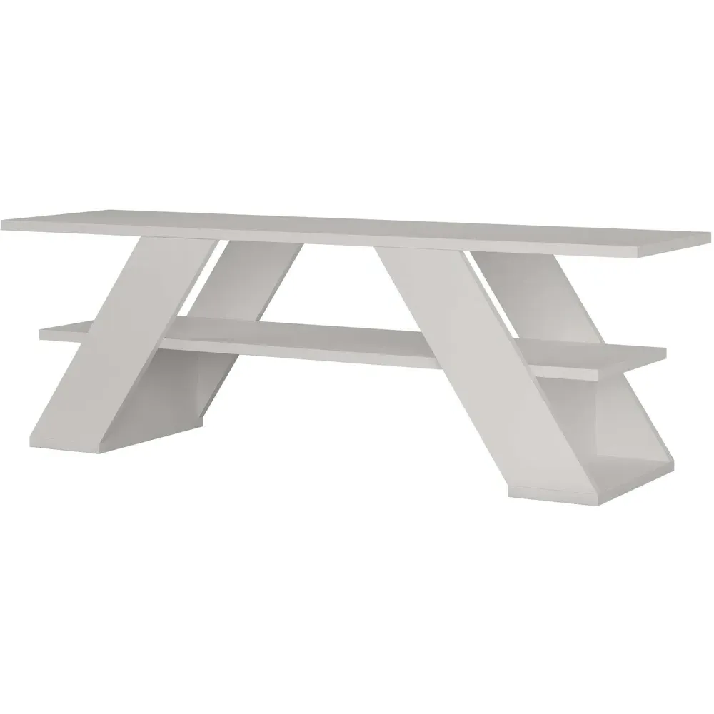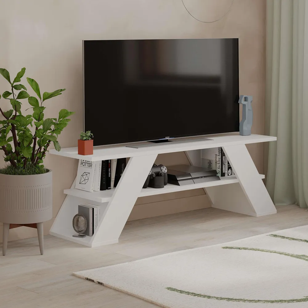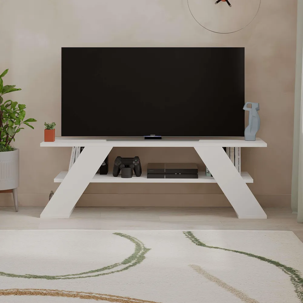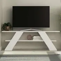 The Farfalla TV Unit combines functionality with its 120cm surface that supports TVs up to 50 inches. Its open shelf design provides extra storage space, while the particle board construction with melamine coating delivers enhanced durability. The single shelf configuration fits compact spaces, and the robust build ensures stable support for your entertainment components.