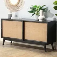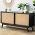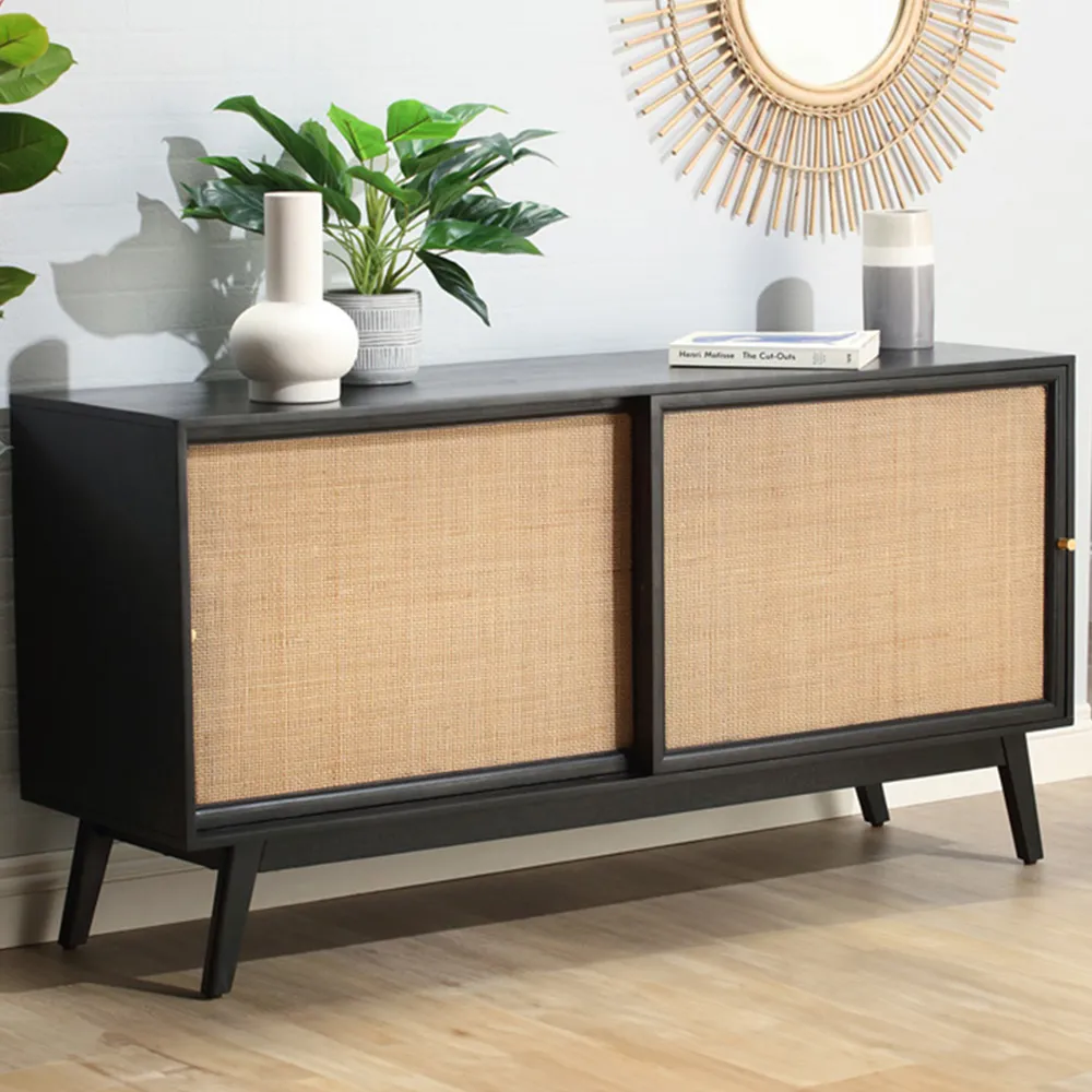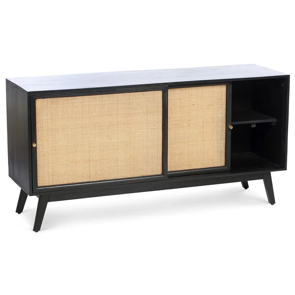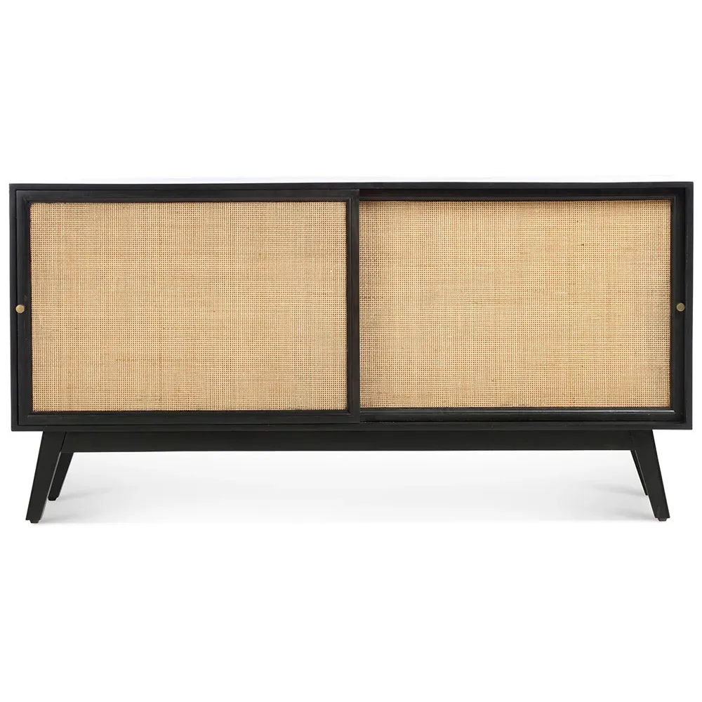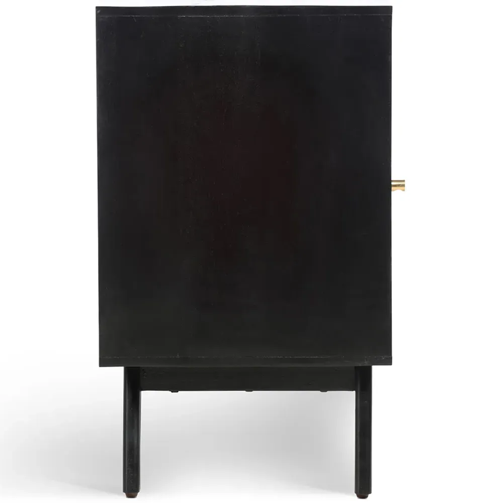 The Manhattan TV Unit combines solid mango wood construction with natural rattan front panel cupboards for distinctive texture and visual appeal. Its wide design features two open shelves and gold-handle detailing, while the natural materials add warmth and character. The two-door storage provides ample space for media essentials, and the sturdy mango wood frame ensures lasting durability.