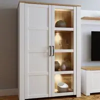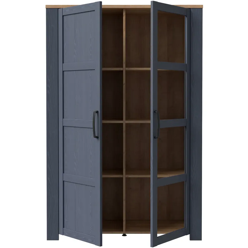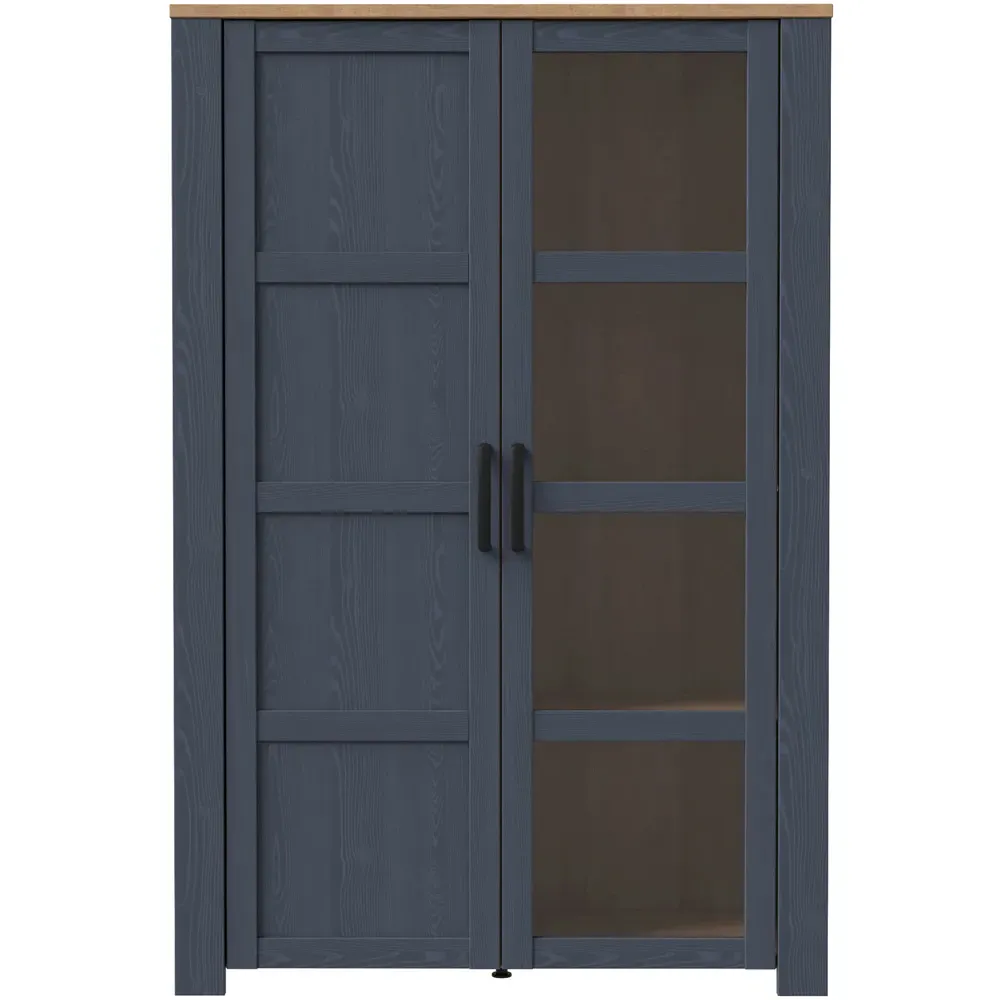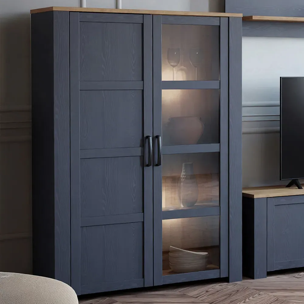 The Bohol Display Cabinet offers rustic character with enhanced functionality through its drawer feature, equipped with black handles and soft-close doors for seamless operation. Its integrated LED lighting system highlights contents while the additional drawer provides hidden storage space. The Riviera oak and navy combination creates visual interest, and the narrow design optimizes floor space usage.
