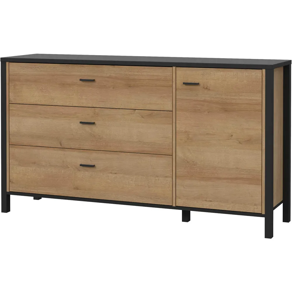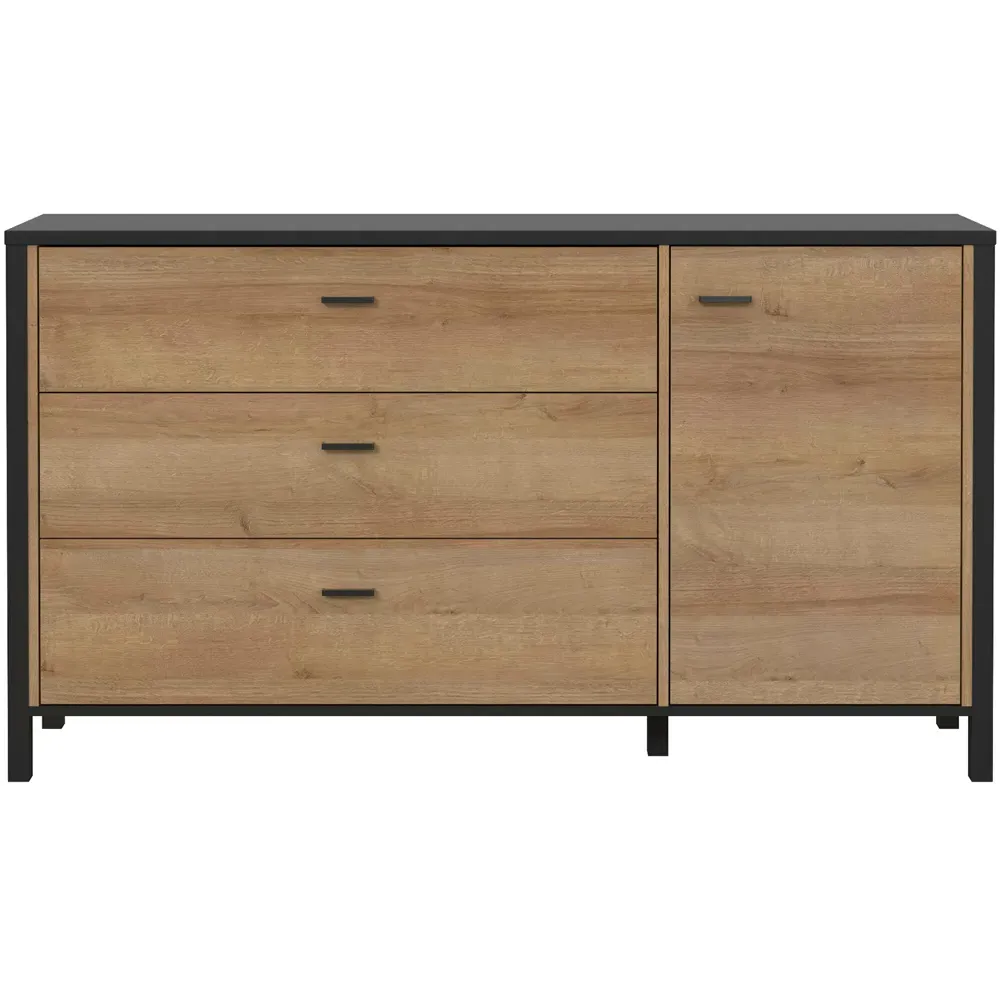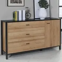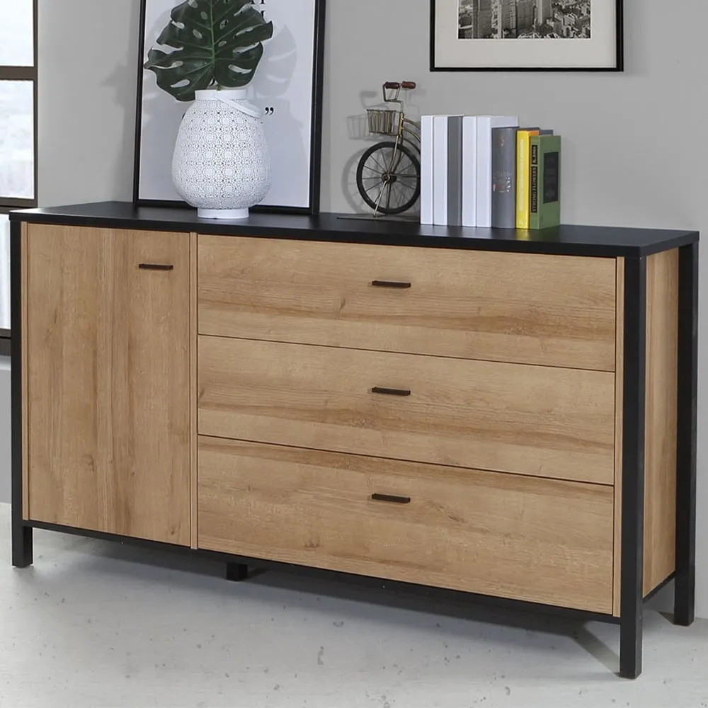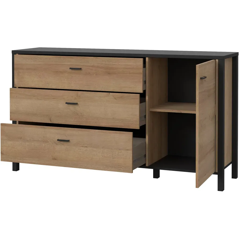 This Furniture To Go High Rock Sideboard features a contemporary design with a perfect blend of the Riviera oak decor with deep matt black accents. It has a single-drawer structure with the top surface to offer a generous storage space. The sleek black metal handles add a touch of elegance, while the table boasts robust metal legs in a frame-like design, contributing to a distinct loft character within the space. Beyond its striking aesthetics, it prioritises functionality with its ingenious storage solutions. It effortlessly fits into any room, from the living room and dining area to the hall, youth room, or bedroom, adding a touch of sophistication and practicality to every corner of the home.