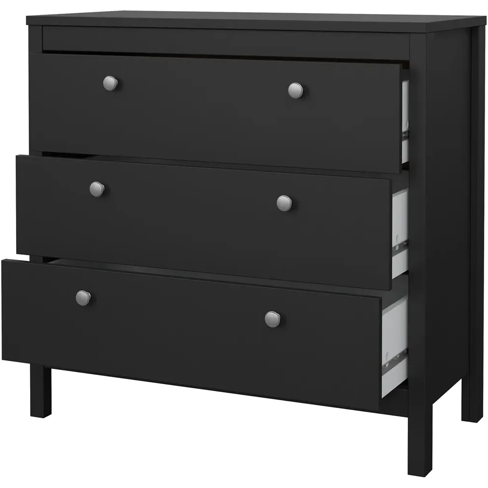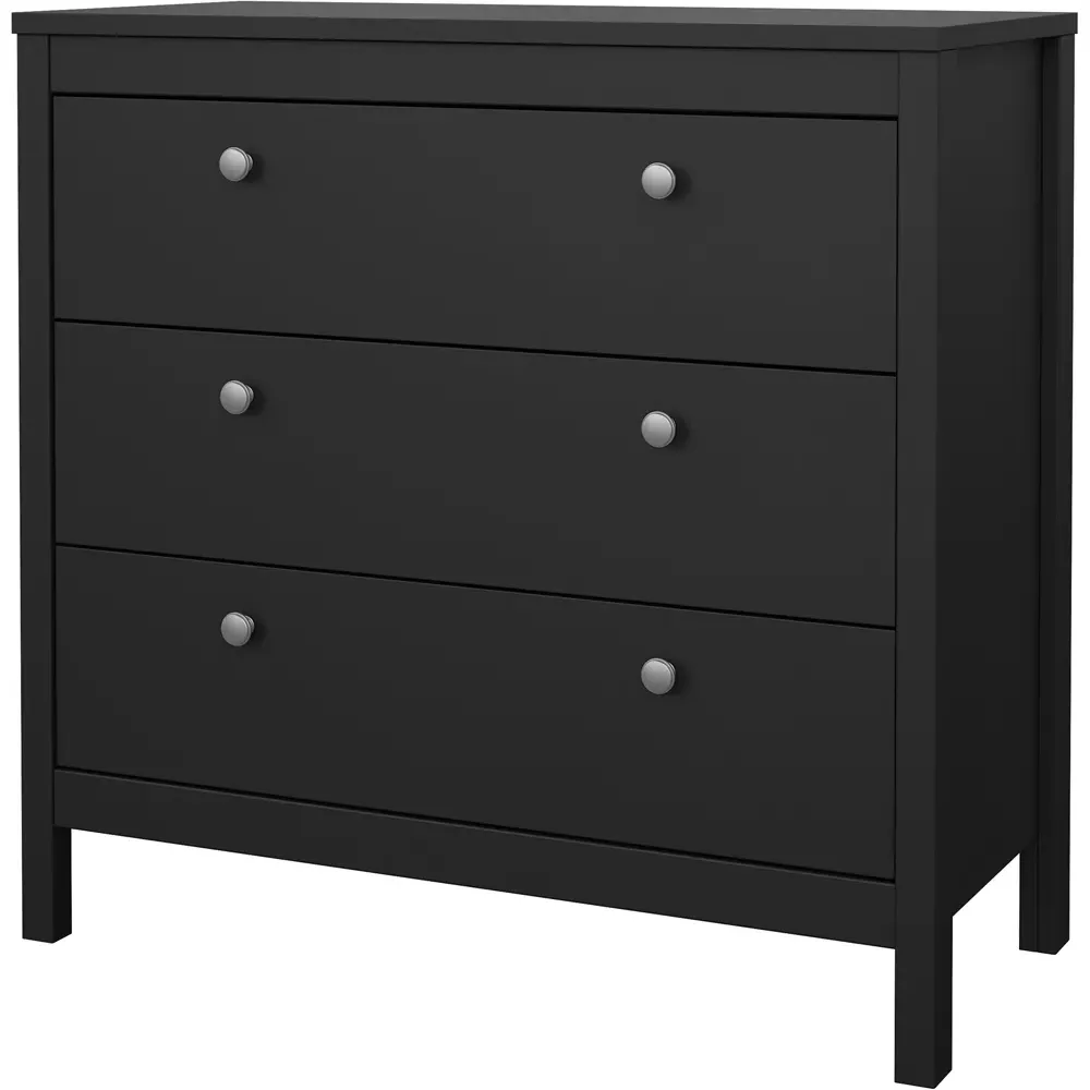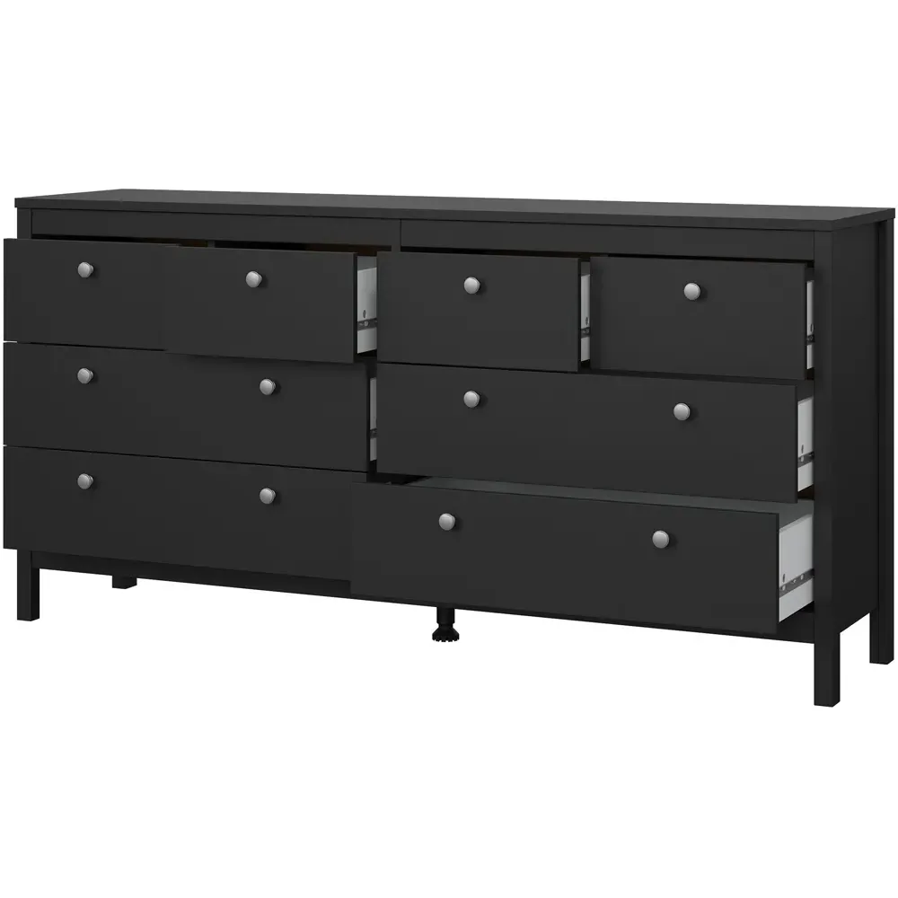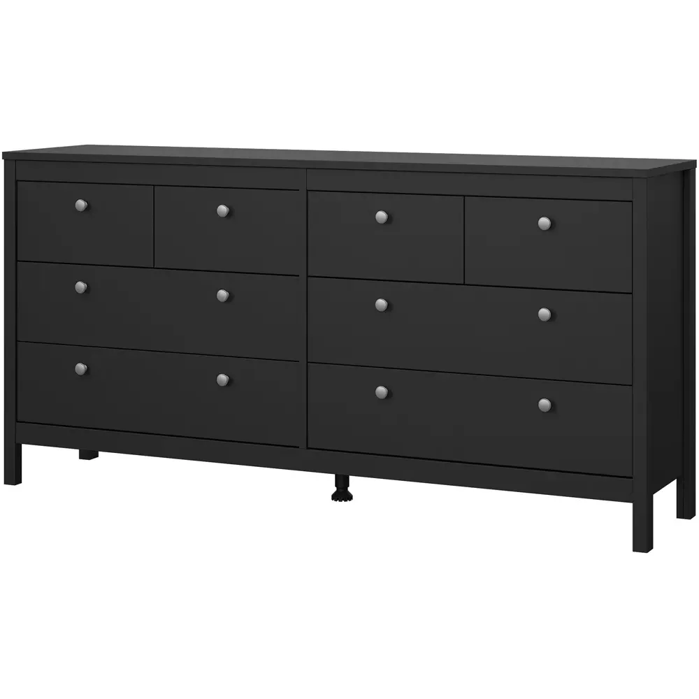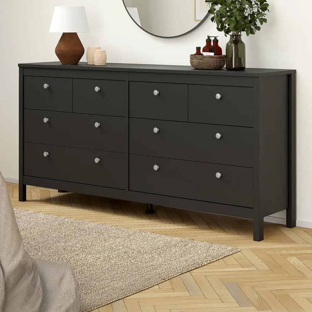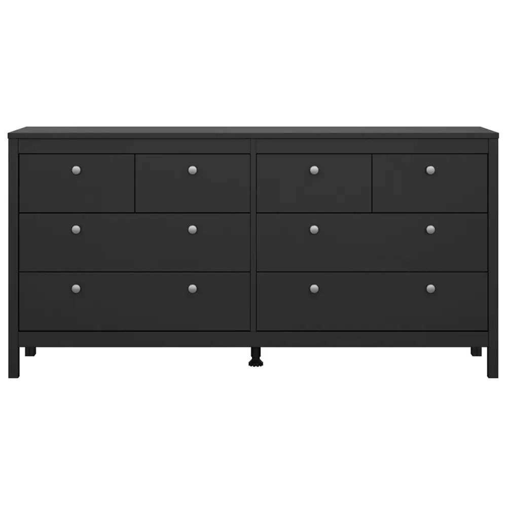 The Florence Madrid Bedside Table combines storage with its two-drawer design and matt black finish. Its simple metal handles provide easy access to the spacious drawers, offering convenient storage for bedside essentials. The tabletop surface provides additional space for lamps or personal items. Constructed from PEFC certified sustainable wood with high-quality laminated board construction for reliable bedroom storage.