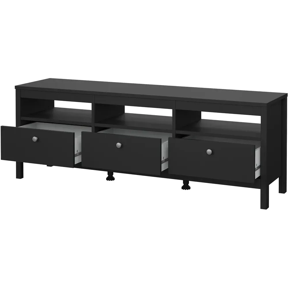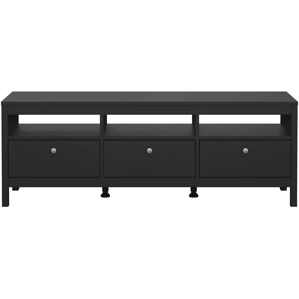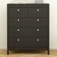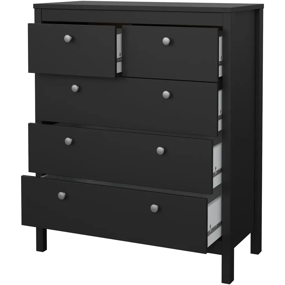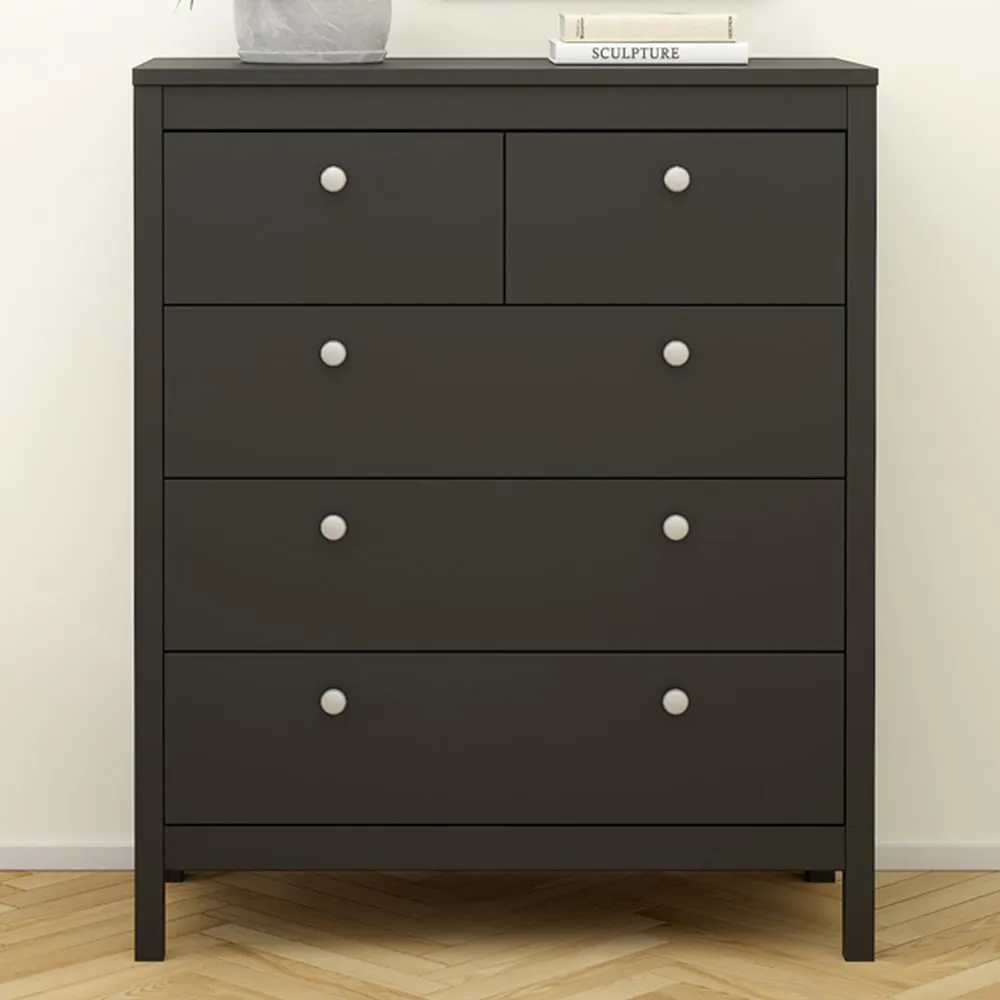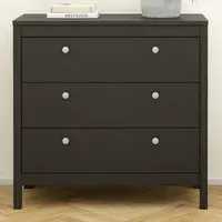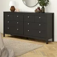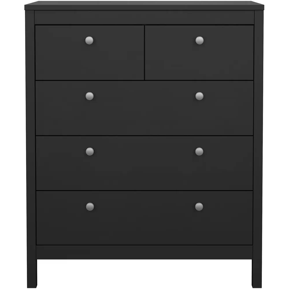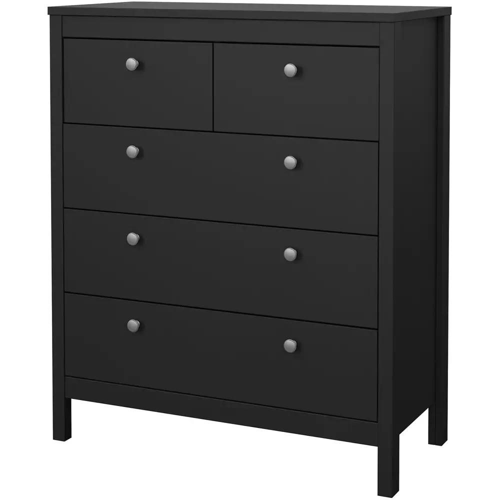 The Florence Madrid Bedside Table combines storage with its two-drawer design and matt black finish. Its simple metal handles provide easy access to the spacious drawers, offering convenient storage for bedside essentials. The tabletop surface provides additional space for lamps or personal items. Constructed from PEFC certified sustainable wood with high-quality laminated board construction for reliable bedroom storage.