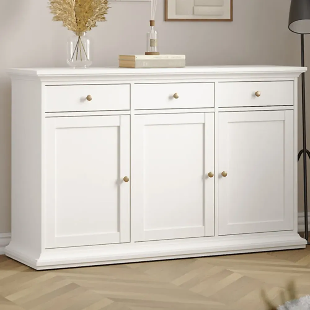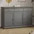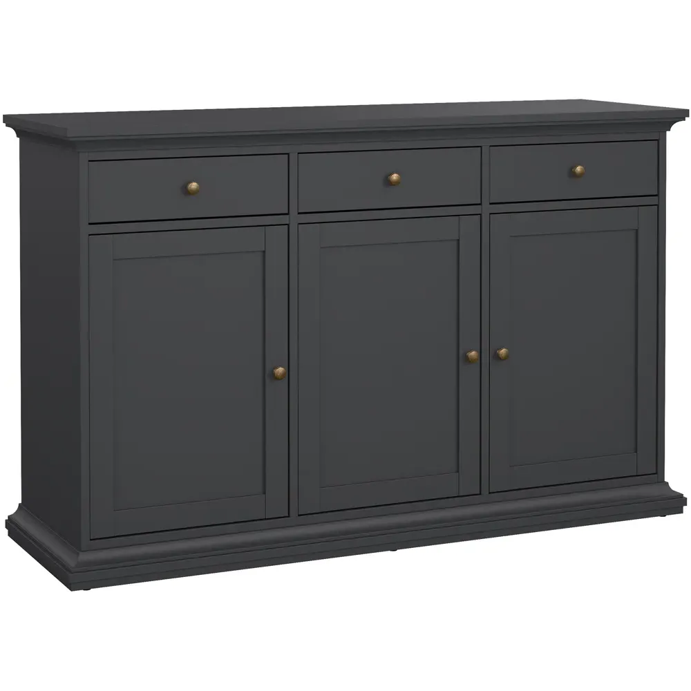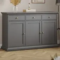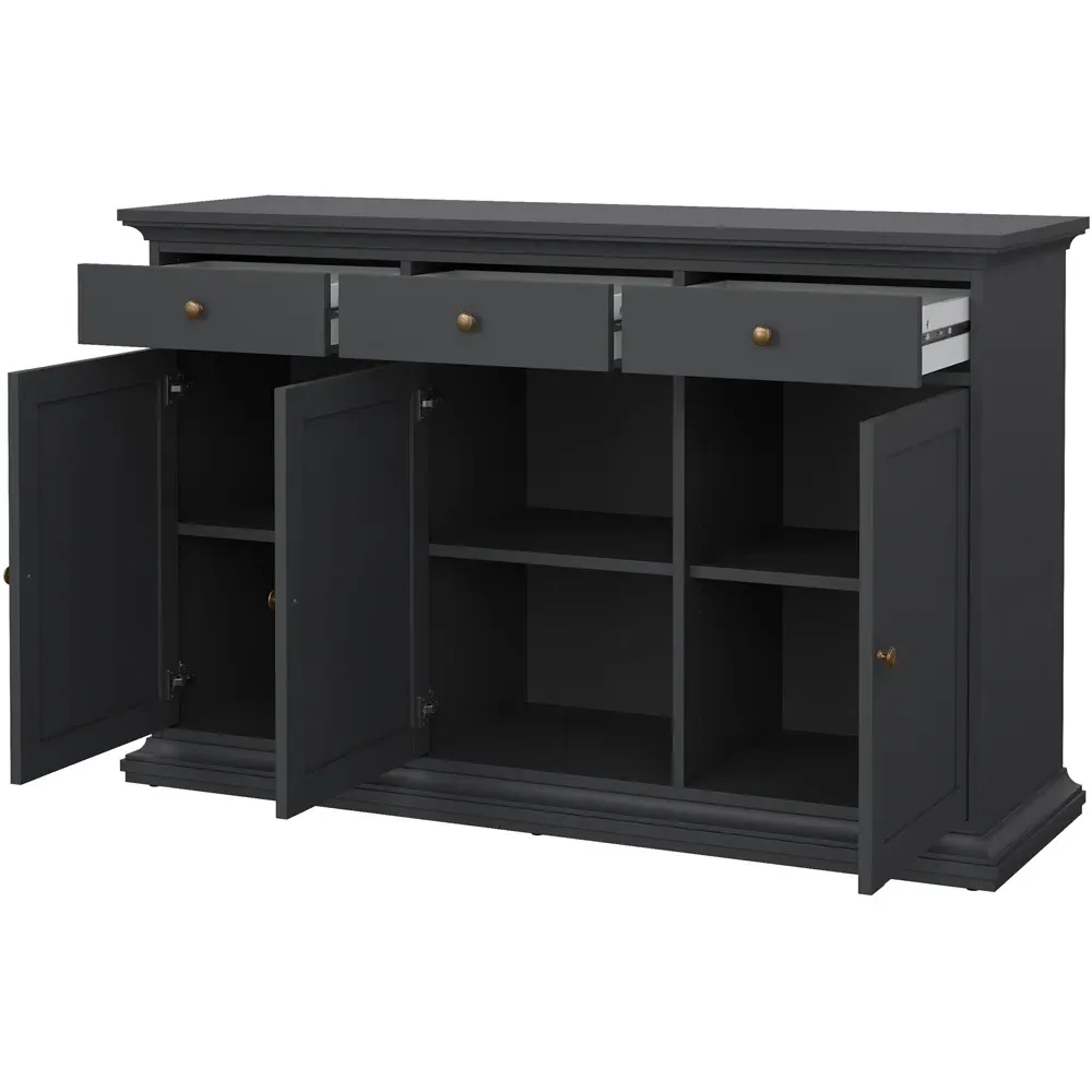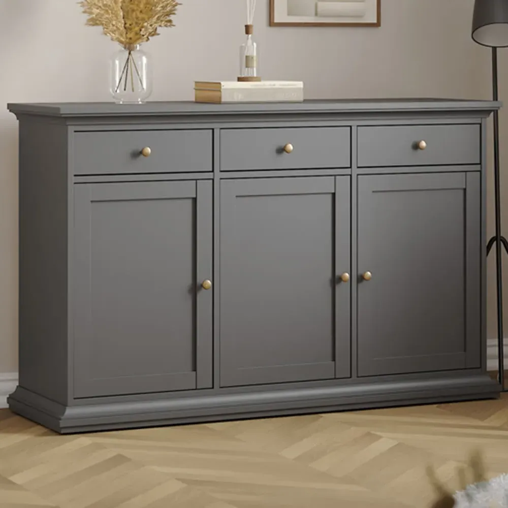 The Florence Zingaro Sideboard provides extensive storage with its 3 doors and 2 drawers configuration. Its larger design offers 50cm additional length compared to compact models, creating extra cupboard space. The grey finish complements the practical layout for enhanced organization.