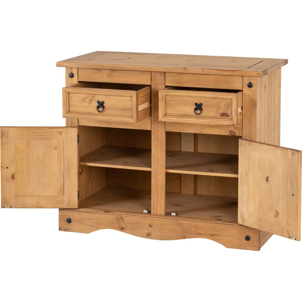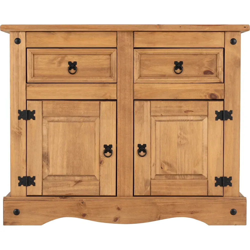 The Corona Sideboard combines practical storage with rustic charm through its distressed waxed pine finish. Its single door and four drawers provide ample space for tableware, linens, and household essentials, while the solid pine construction ensures lasting durability. The distressed finish adds character and complements various decor styles, making it both functional and visually appealing.