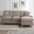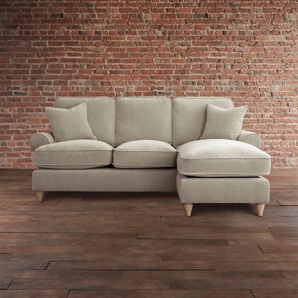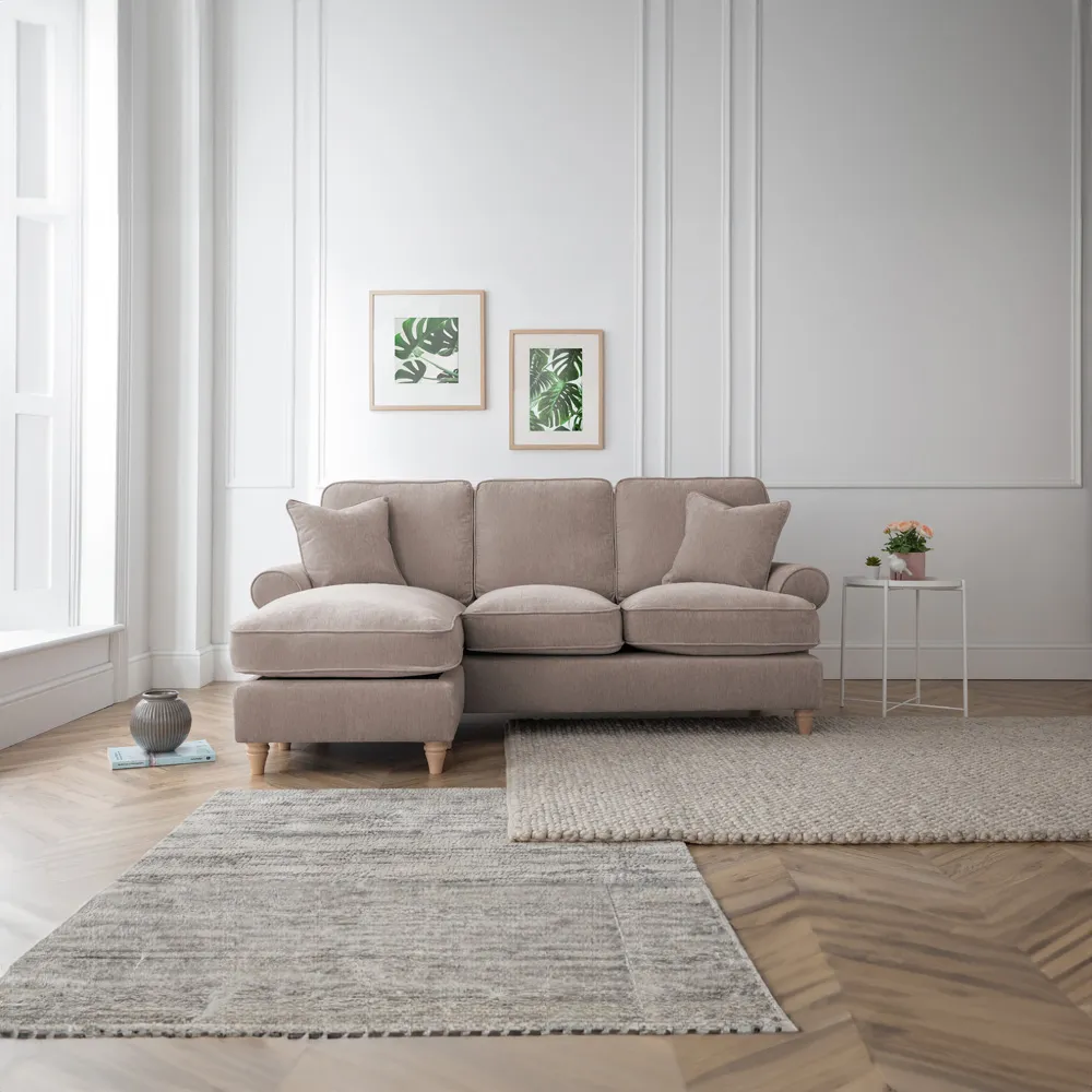 Go for a comfortable retreat with the The Victoria Putty Armchair. This handcrafted piece exudes timeless elegance and sophistication with its classic design and luxurious appearance. Its scroll arms and extra deep seat cushions exude opulence, making it a stunning addition to any space. The soft-touch fabric is not only luxurious but also easy to professionally clean. It effortlessly combines timeless style with contemporary appeal and comes with scatter cushions for extra comfort. Its back cushions, filled with soft-fill polyester fibre, require regular plumping to maintain their shape and comfort. The deep pocket sprung seat cushions ensure optimal comfort and support. Topped off with modern pale wood legs, this is a true statement piece. Additionally, it can be professionally cleaned and will be delivered to your room of choice, with the packaging removed for your convenience.
