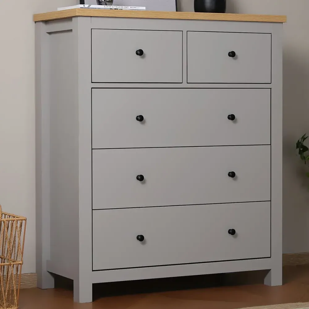 The Wiltshire 2-drawer bedside table is a versatile and functional piece of bedroom furniture. This bedside table grey model features a sleek appearance, with the body constructed from durable MDF melamine. The top surface of the bedside table cabinet is finished in a contrasting wood colour. The Wiltshire bedside table with drawers provides ample storage space for personal items. In addition, this bedside cabinet serves as a practical side table for bed setups. Its grey colour seamlessly integrates with a variety of bedroom decors, while the wood-coloured top adds a warm, vintage appeal. Whether you're looking for a grey bedside table to compliment your bedroom's theme or a 2 drawer bedside table to maximise your storage options, this item is a perfect choice.