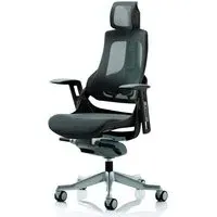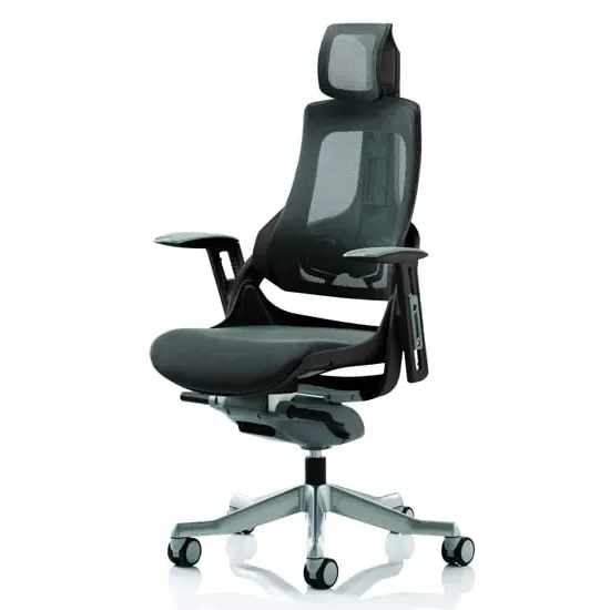 Boldly going where no chair has gone before. The Zure takes you to a new comfort destination. Our unique range of this distinctive, umber stylish posture perfect seating solution has it all. There are fine mesh, fully upholstered, partly upholstered and stunning flexible elastomer options. The seat and backrest are carefully contoured to provide maximum comfort. The high quality outer skeleton wraps the user in touch point technology. Padded arm rests on the fabric and leather options provide pleasing eye-appeal whilst the elastomer versions have colour coded armrests. The polished aluminium base houses highlighted castor detailing. FEATURES : Material : Mesh Finish : Charcoal Mesh Large contoured padded seat and backrest Orthopedic designed frame Height adjustable arms Depth adjustable lumbar support Aluminium five star base and castors Padded armrests Synchronized glide mechanism Available at an affordable price Images shown are for illustration purpose only DIMENSIONS : Seat Width : 565mm Seat Depth : 520mm Seat Height : 450-550mm Back Width : 410mm Back Height : 585-650mm Arm Width : 470mm Arm Height : 630-710mm Overall Width : 690mm Overall Depth : 700mm Overall Height : 1015-1160mm