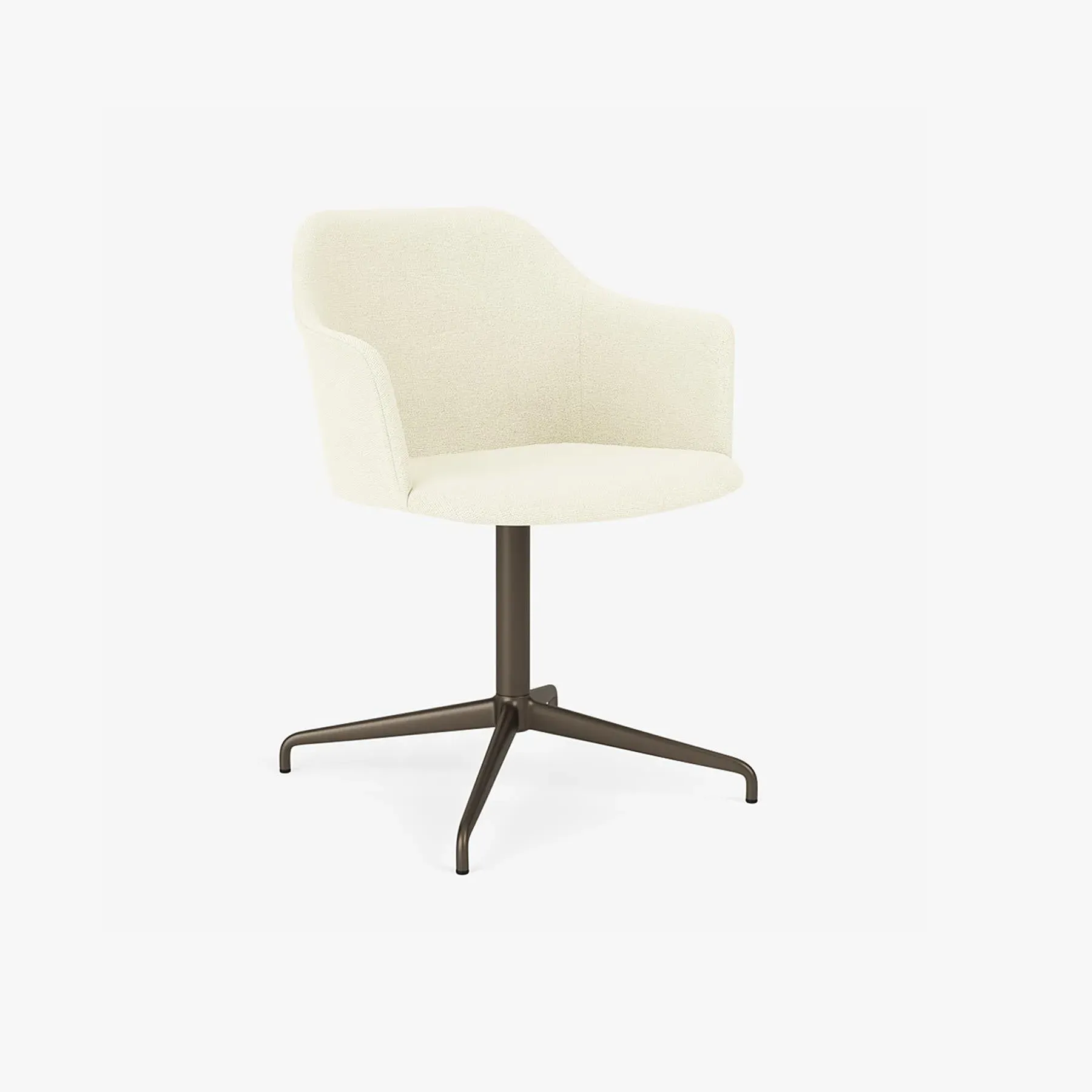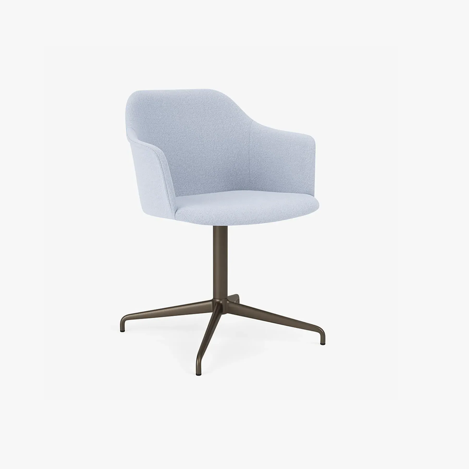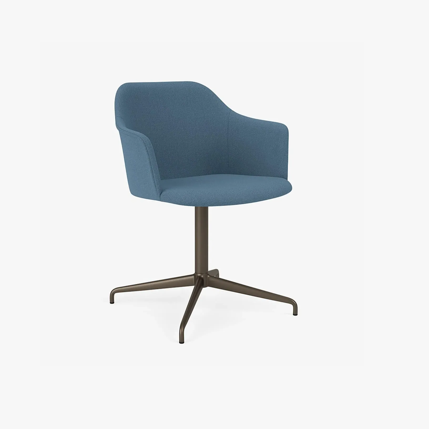 The office chair combines sustainable design with ergonomic comfort, featuring a shell crafted from 100% recycled plastic. Its fully upholstered construction provides enhanced seating comfort, while the bronzed base adds durability and stability. The chair offers customizable fabric options to suit various aesthetic preferences, and the armrest design supports extended use.