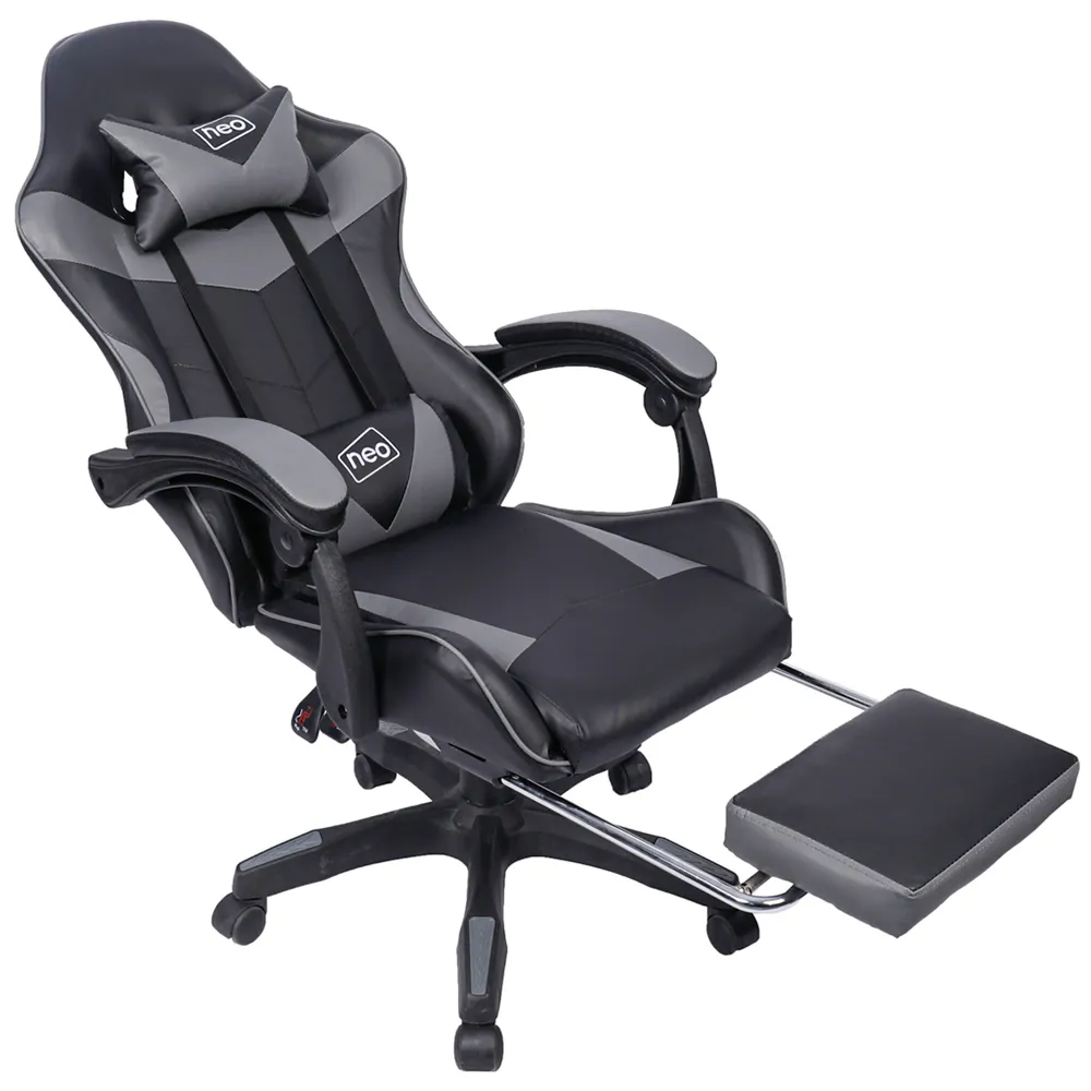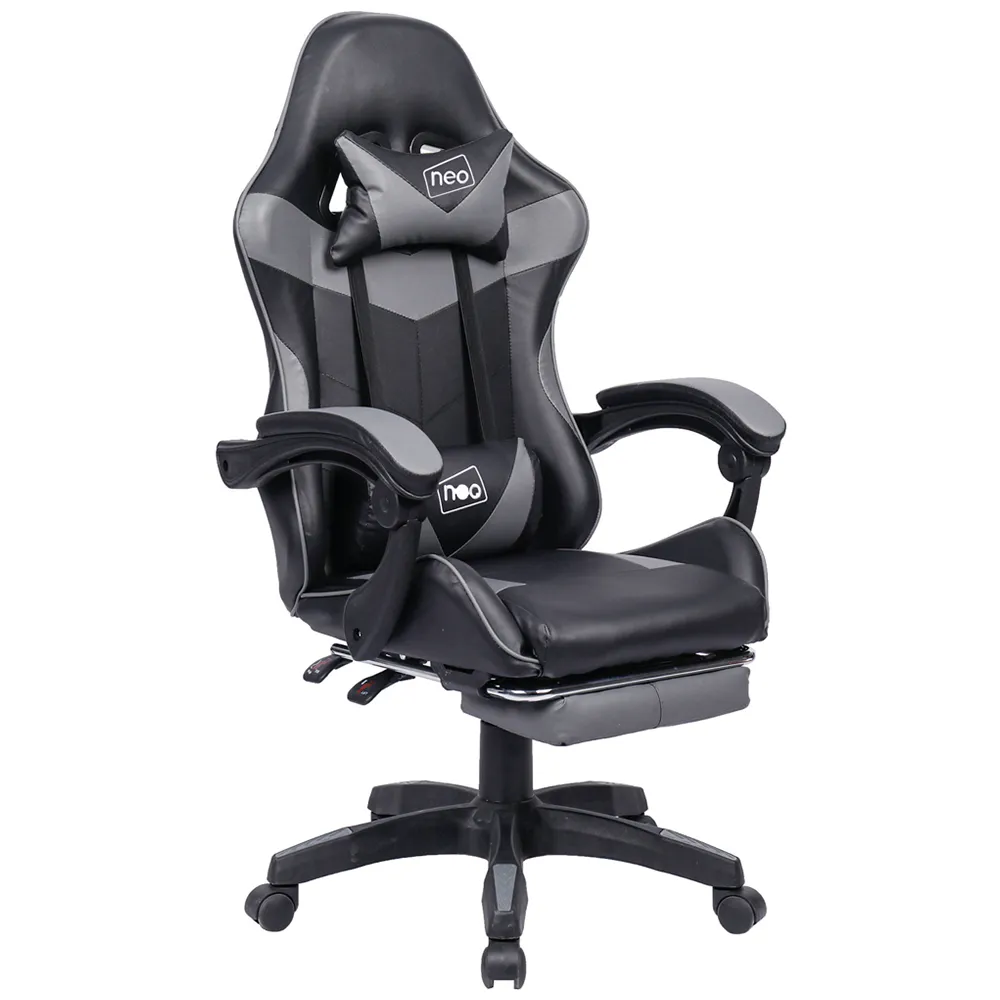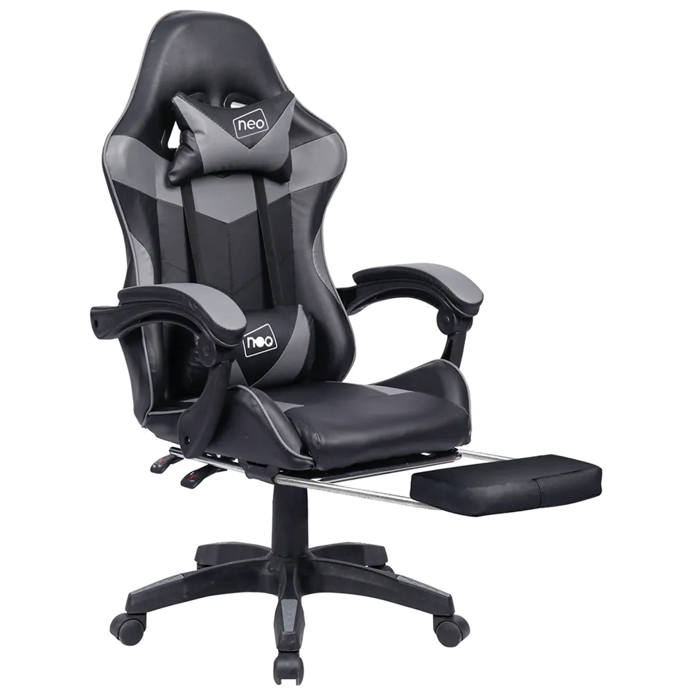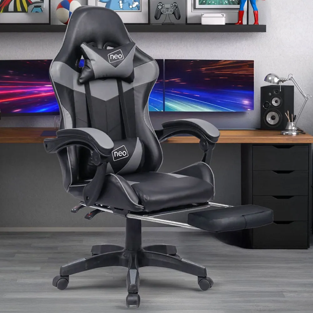 The deluxe Neo branded fully recliner racing-style white computer office gaming chair is made with high quality PU leather. The computer office gaming chair combines multiple adjustable features, luxurious materials and Ergonomic design for comfort, with lumbar and headrest support. The office chair supports a new level of comfort for gaming, studying and working office environment. Colour: Grey.