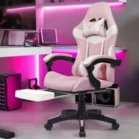 The office chair combines racing-style design with ergonomic comfort features. Its fully reclining mechanism provides adjustable positioning, while the high-quality PU leather upholstery adds durability and easy maintenance. The integrated lumbar and headrest support ensures proper spinal alignment during extended use, and the swivel base allows smooth movement around the workspace.