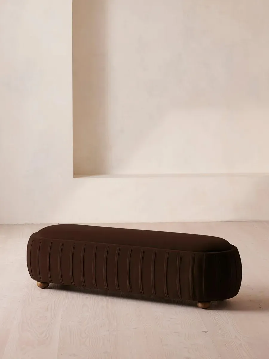 A rounded silhouette upholstered in tactile boucle is designed as an extension of our Vivienne range. Inspired by our the Vivienne sofa on the eighth floor of White City House, this bench is designed to perfectly complement the Vivienne bed. Its rounded silhouette comes fully upholstered in tactile natural boucle.
